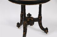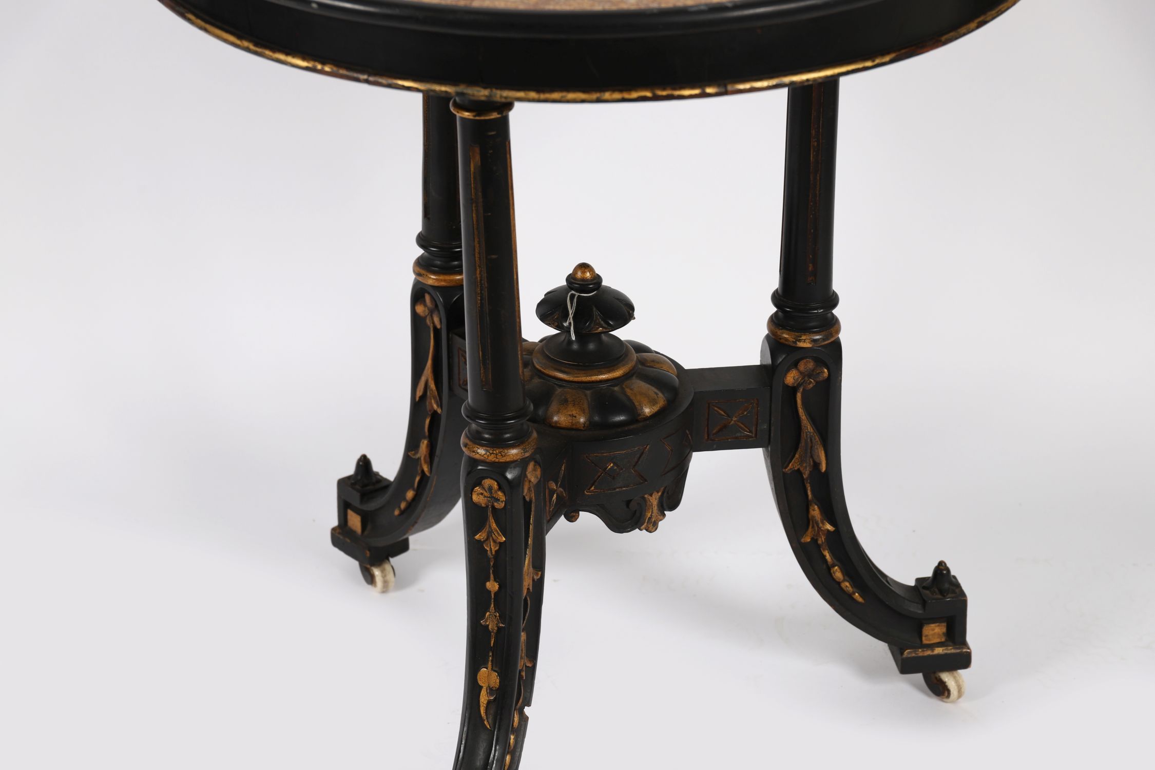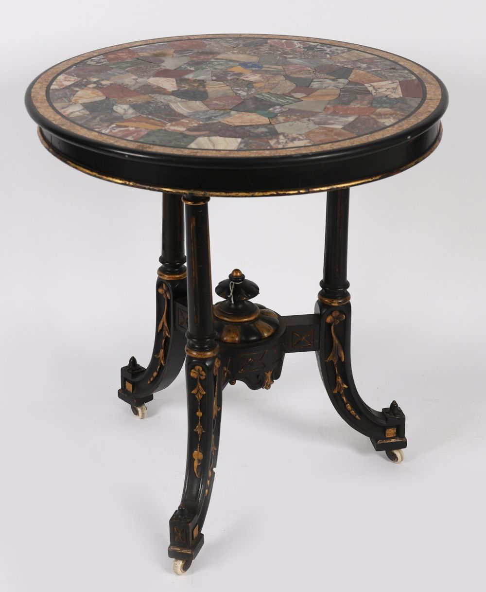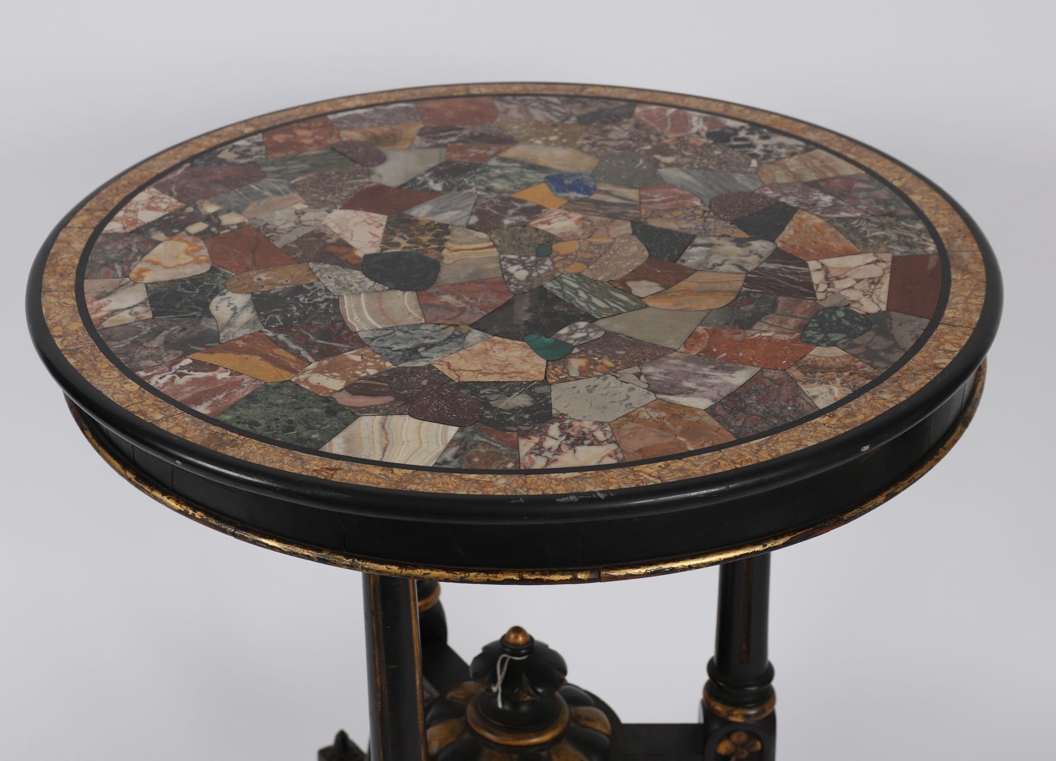 A fine 19th-century Grand Tour specimen marble table, the circular top inlaid with a radiating arrangement of numerous semi-precious and decorative marbles including examples of lapis lazuli, malachite, brocatelle, jasper, porphyry, verde antico, and various breccias. The border with a band of Siena marble and ebonised edge. Raised on an ebonised and parcel-gilt base with three turned legs and foliate decoration, joined by a central finial and ending in original brass castors.