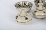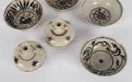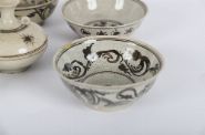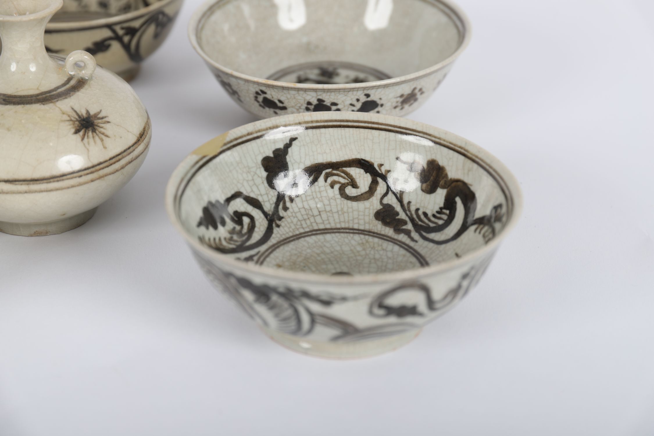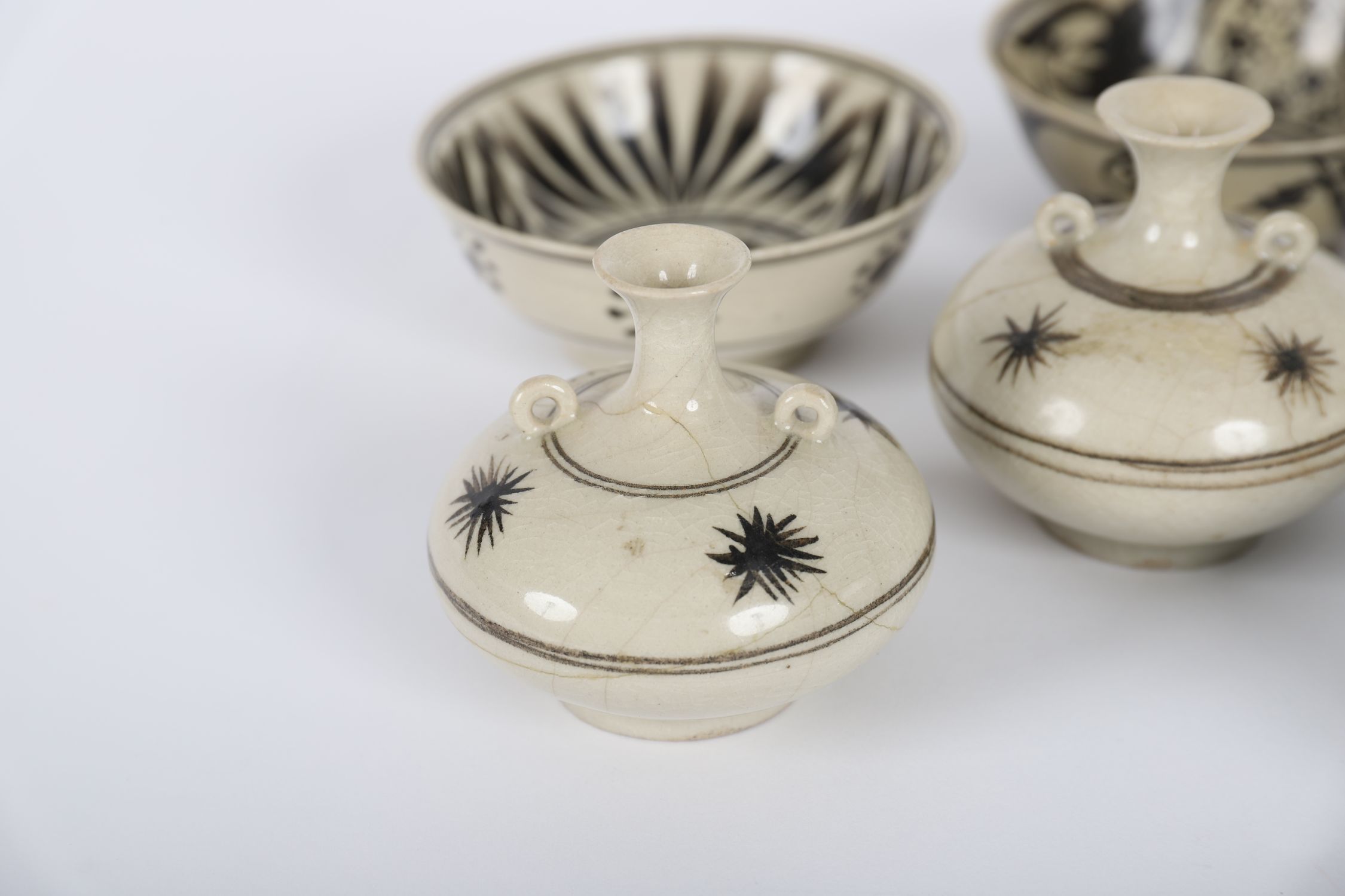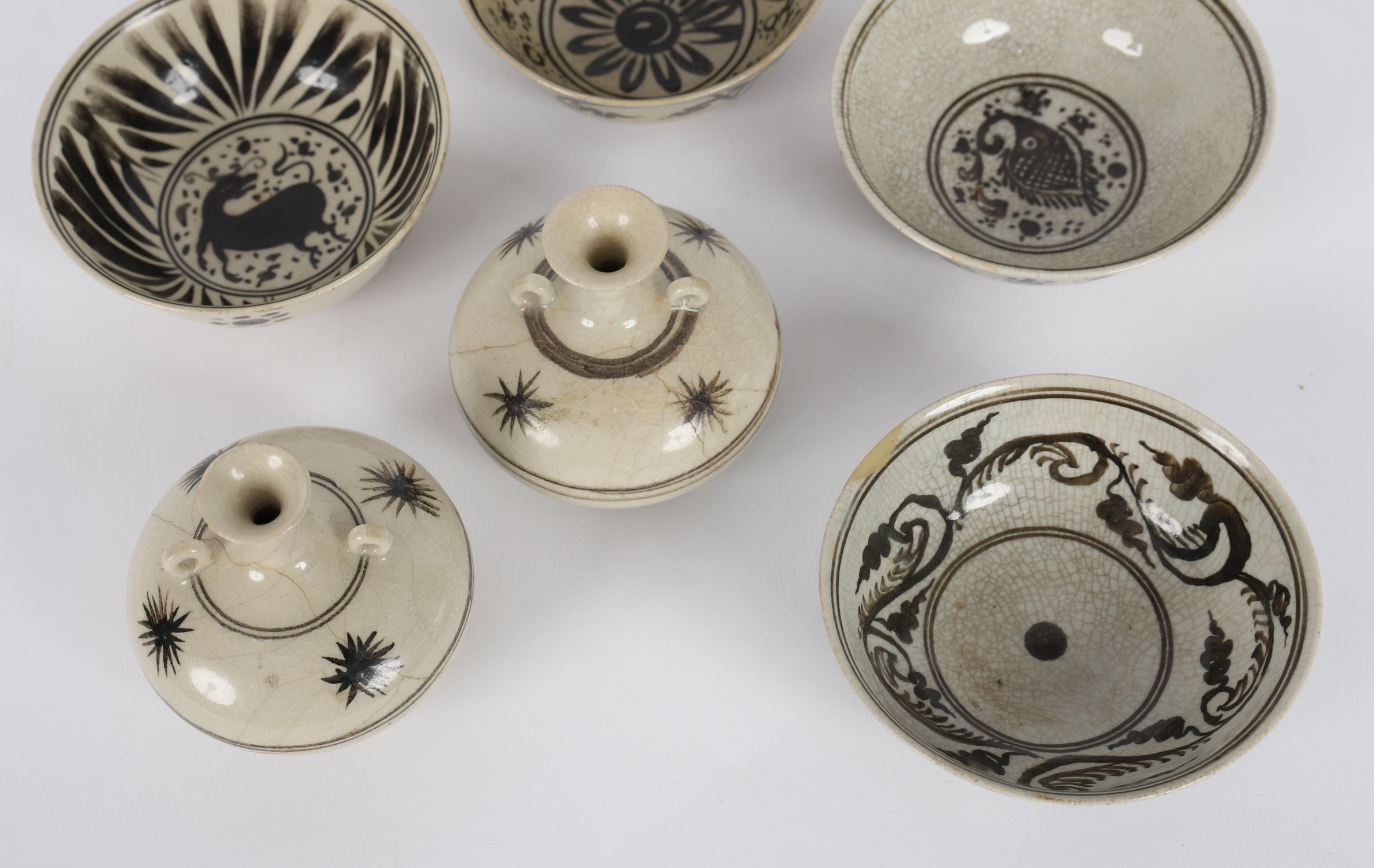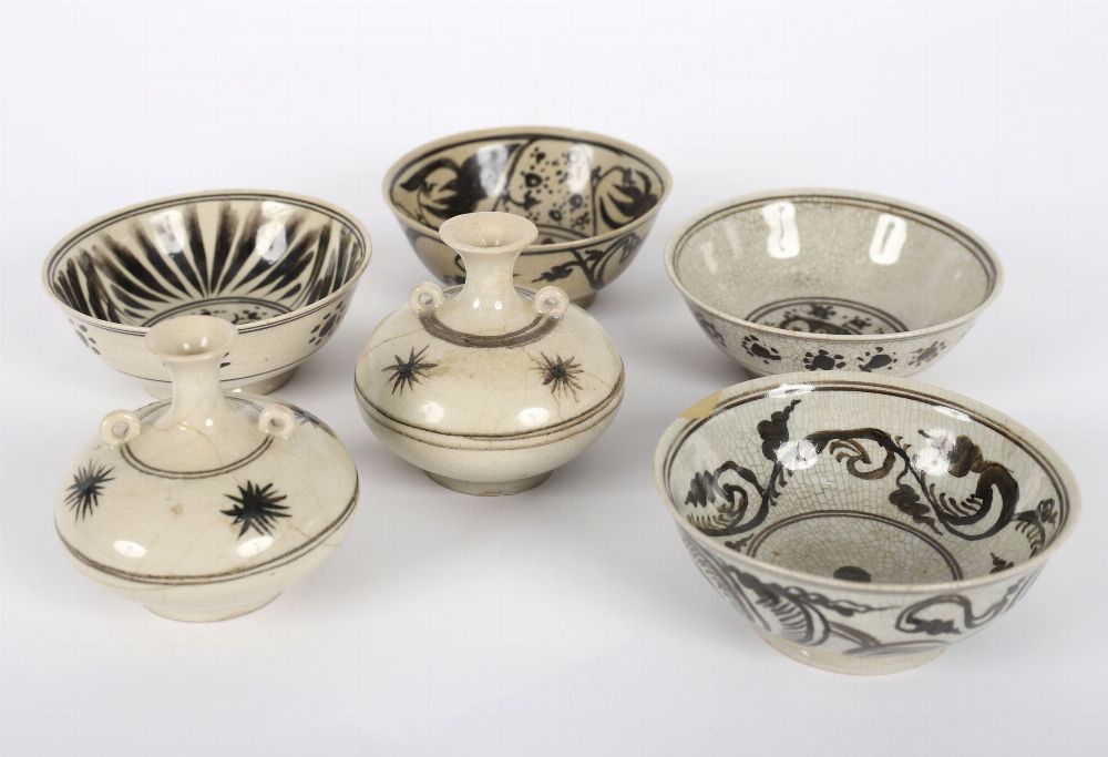 A group of 6 Chinese ceramic vessels comprising four bowls and one small flask, each decorated in black slip over a white or pale grey glaze in traditional Cizhou style. Motifs include floral, foliate, and abstract geometric patterns, all beneath a crackled transparent glaze. The flasks with loop handles and elongated neck. All with unglazed foot rims and typical signs of early kiln firing.