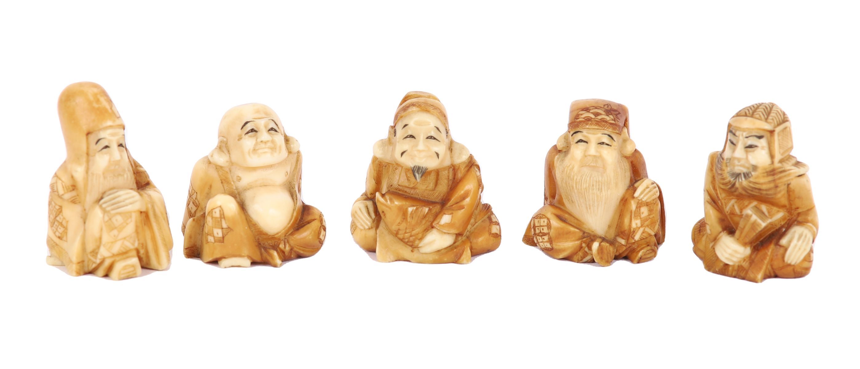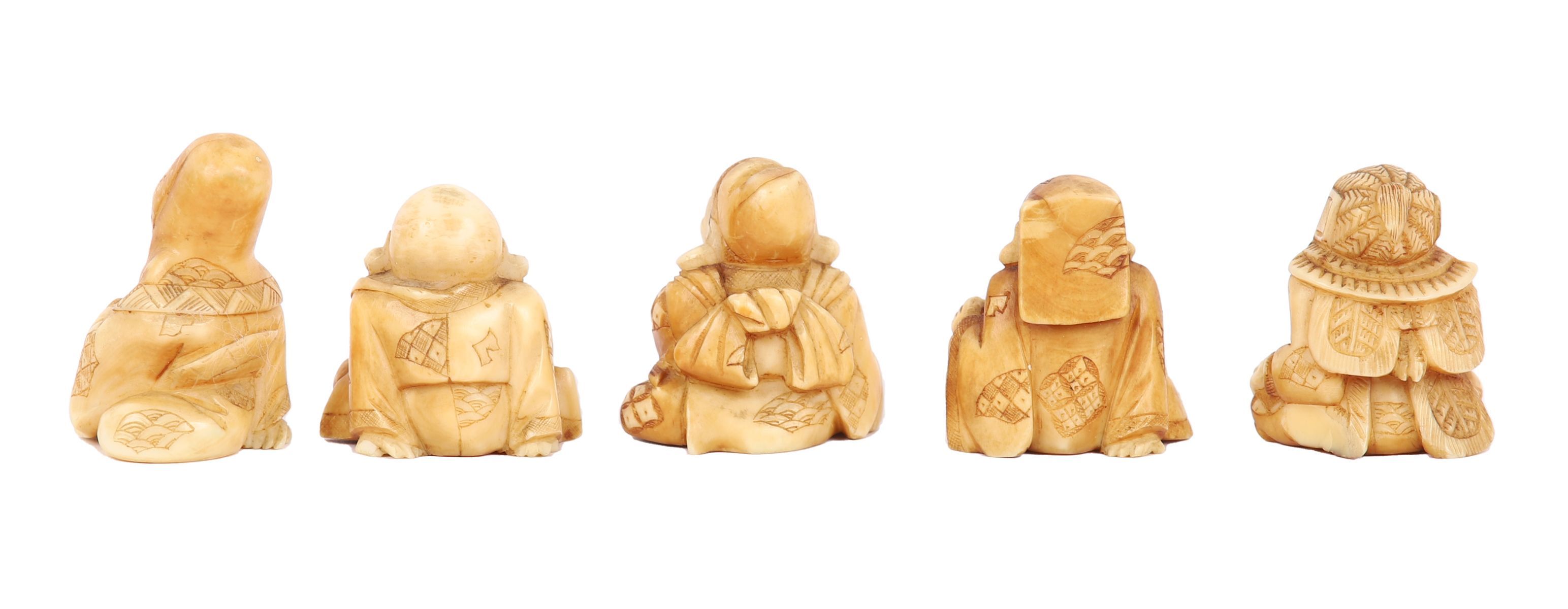 A group of five carved ivory netsuke depicting seated and standing male figures, including elders and scholars in traditional robes, each finely detailed with incised decoration and expressive facial features. Various poses, including figures holding scrolls and resting their hands upon their knees.