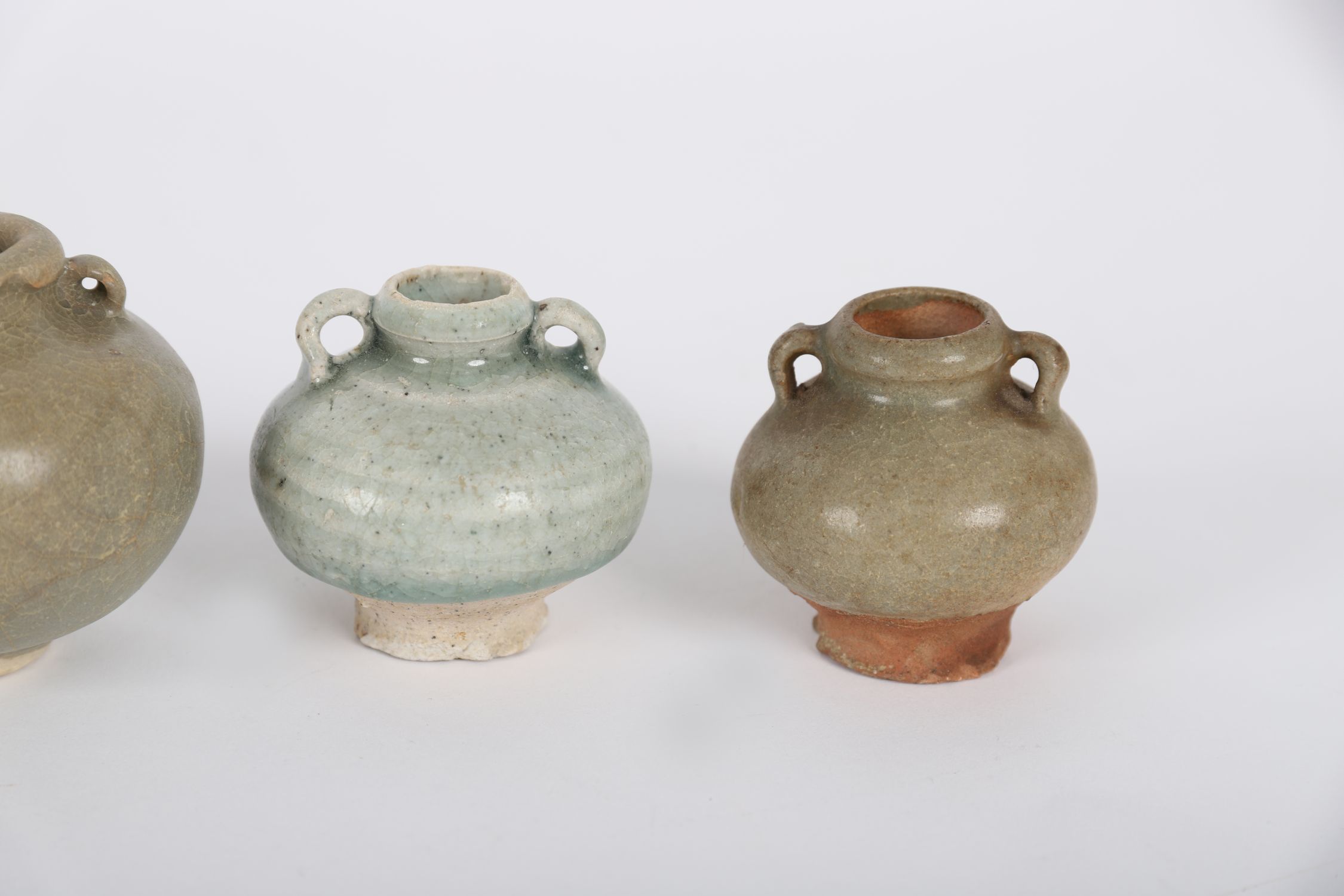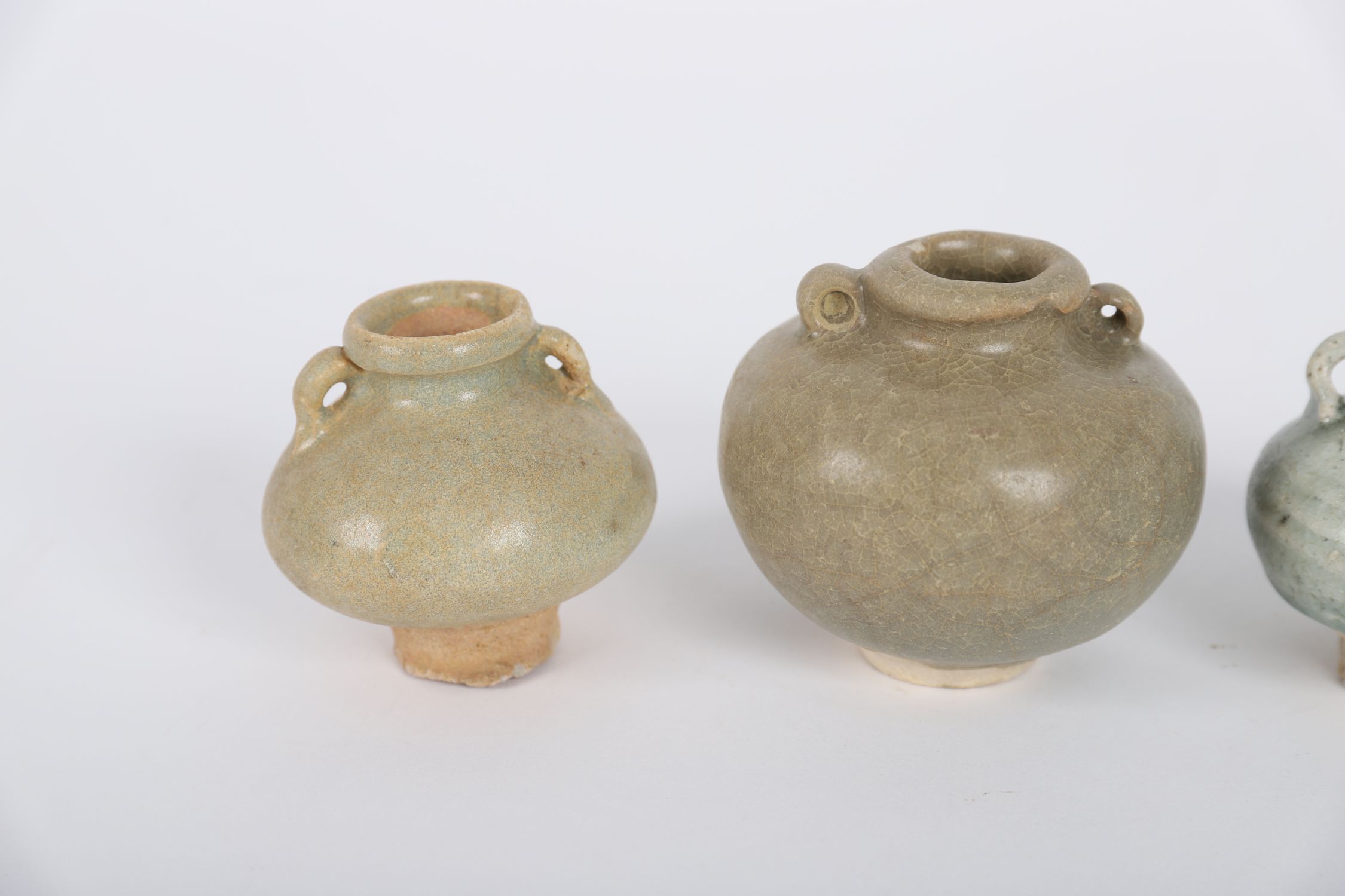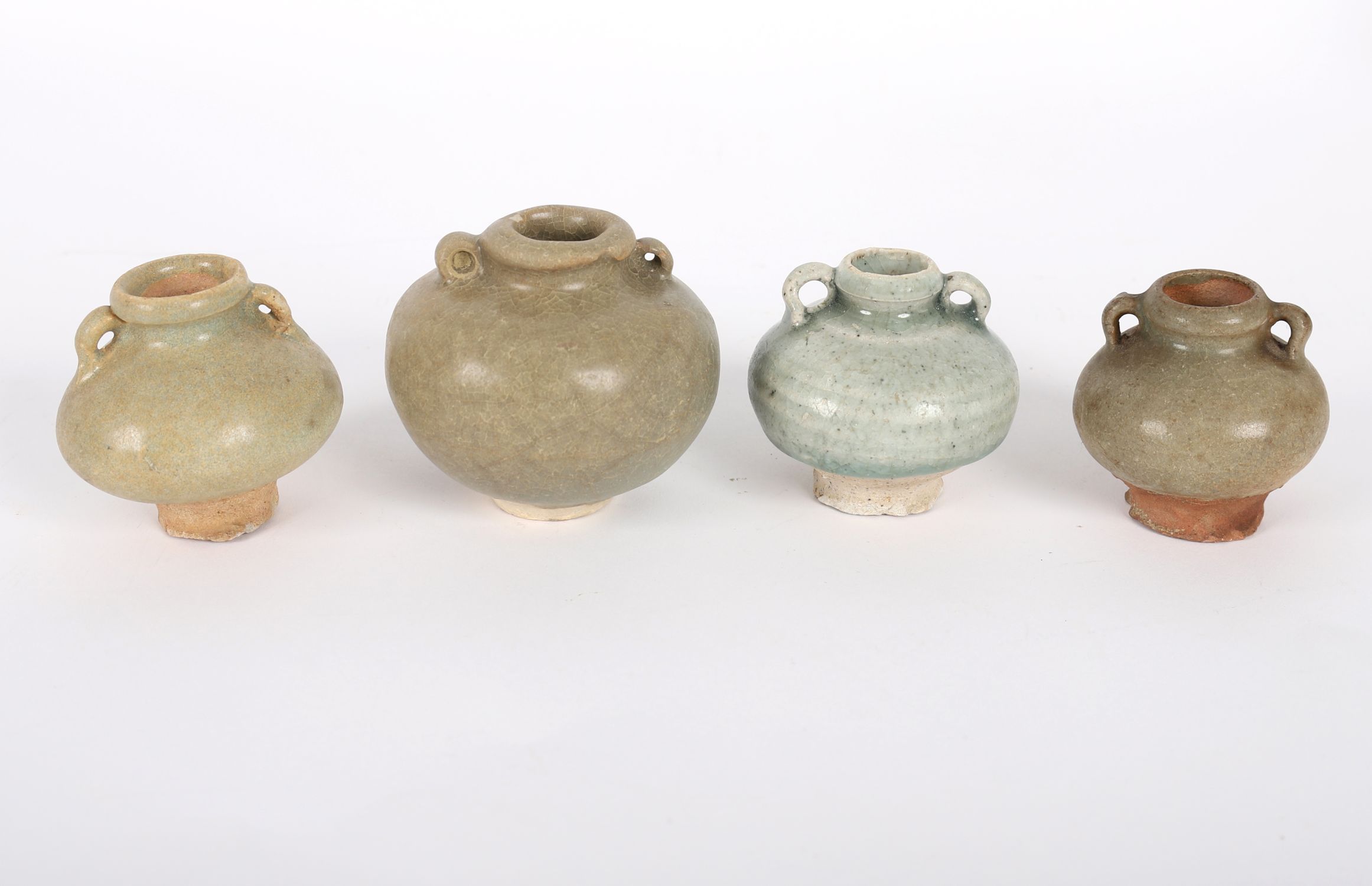 A group of four finely potted Chinese stoneware miniature vessels, each of rounded or ovoid form with loop handles and short necks, covered in pale celadon glazes ranging from bluish green to olive. The glazes exhibit attractive crackling and natural pooling, typical of Southern kiln traditions. Unglazed foot rims reveal fine buff and reddish clay bodies. Likely products of Yue or early Longquan kilns, Song dynasty (960–1279).