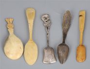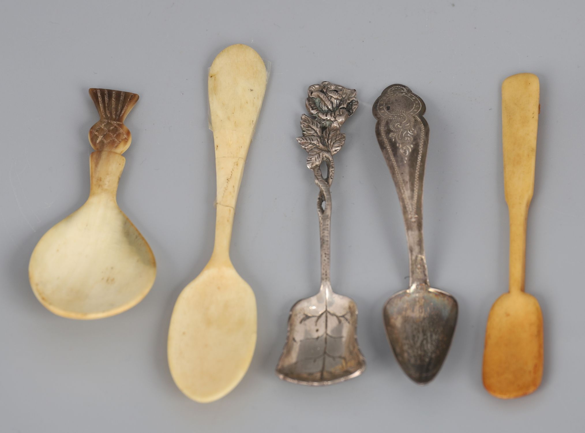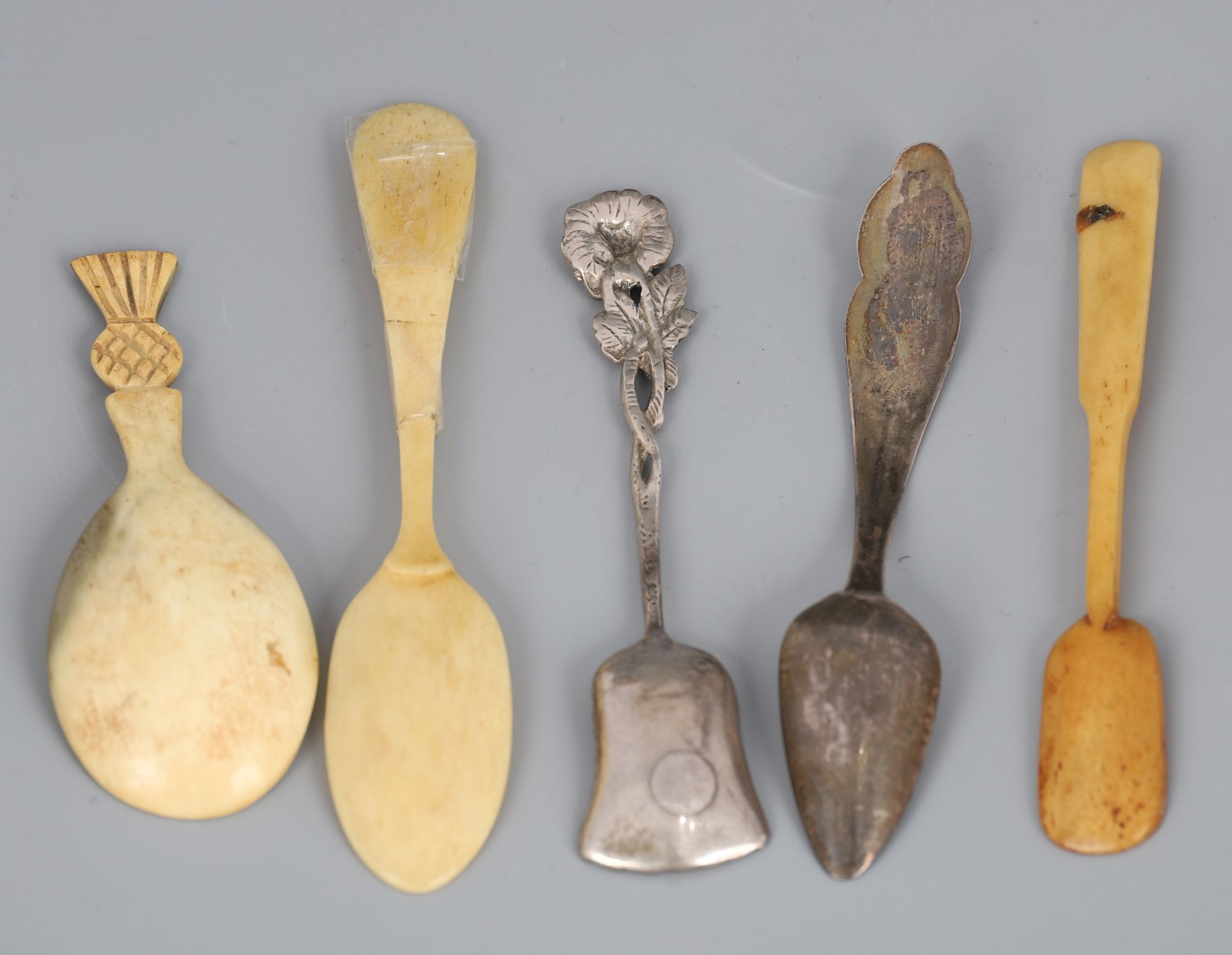 A group of five 19th century mustard spoons, comprising bone and silver examples, one with silver floral terminal.