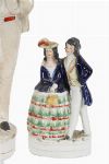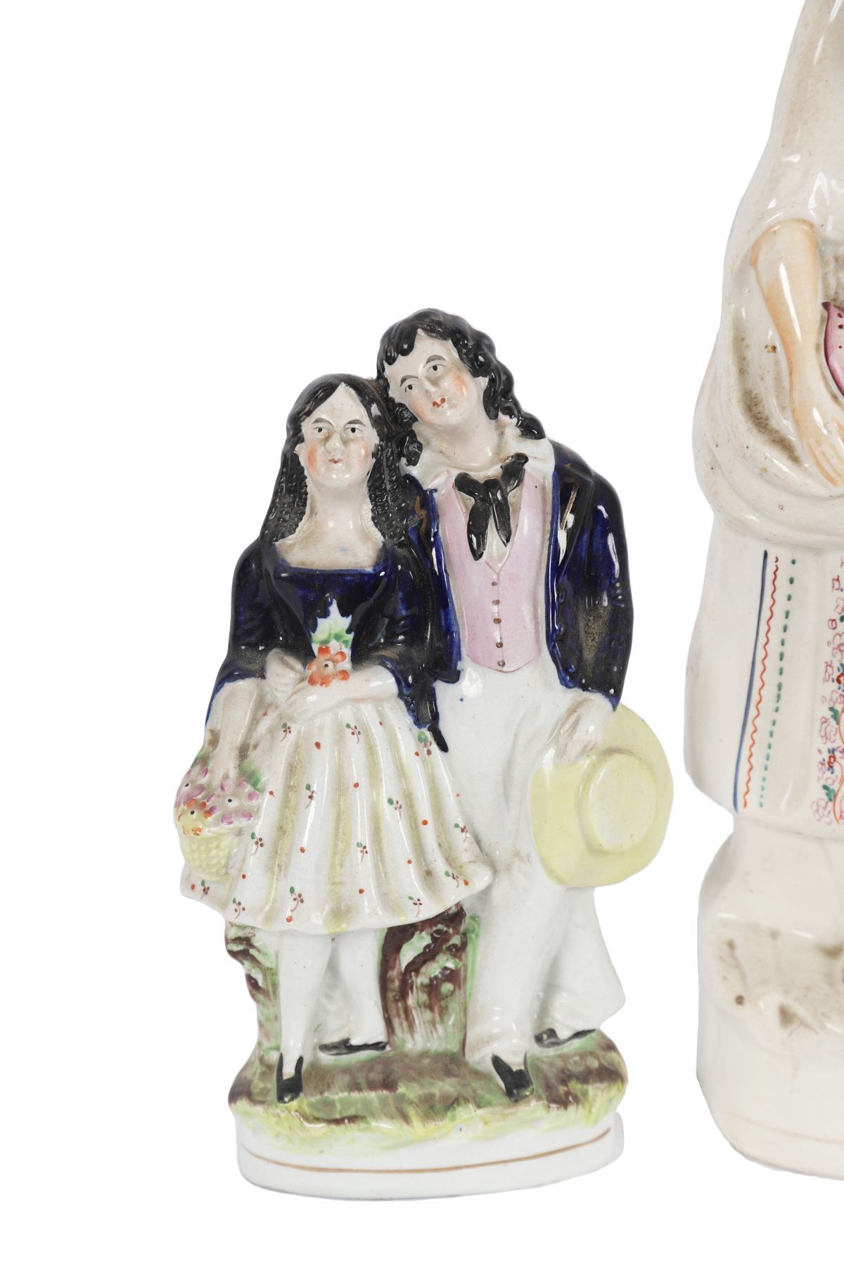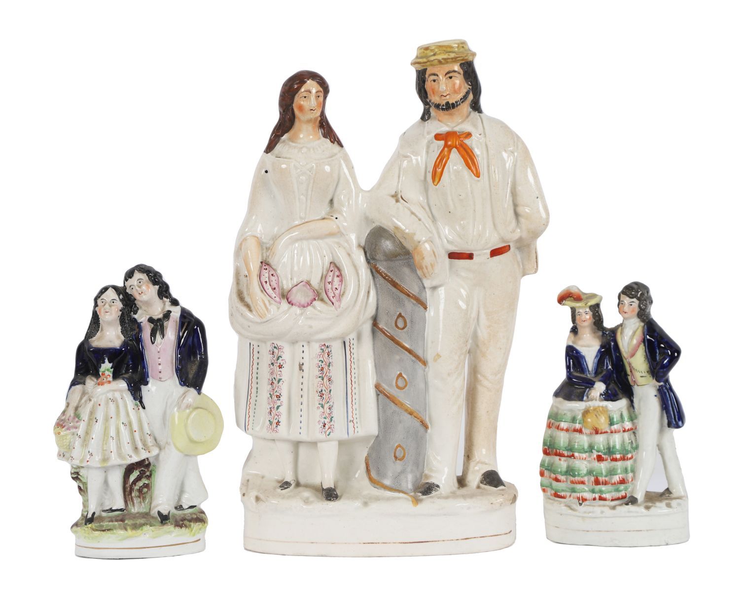 Comprising three 19th-century Staffordshire figures, including a standing couple with bocage support and two smaller courting groups, each modelled in typical polychrome glazes and raised on naturalistic bases.