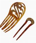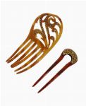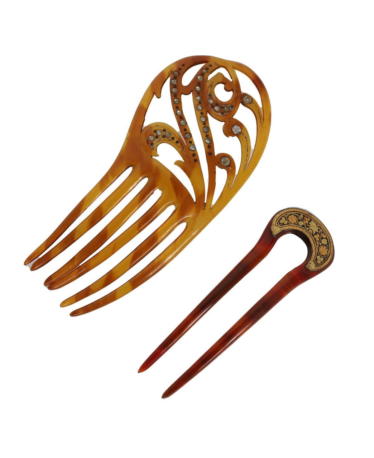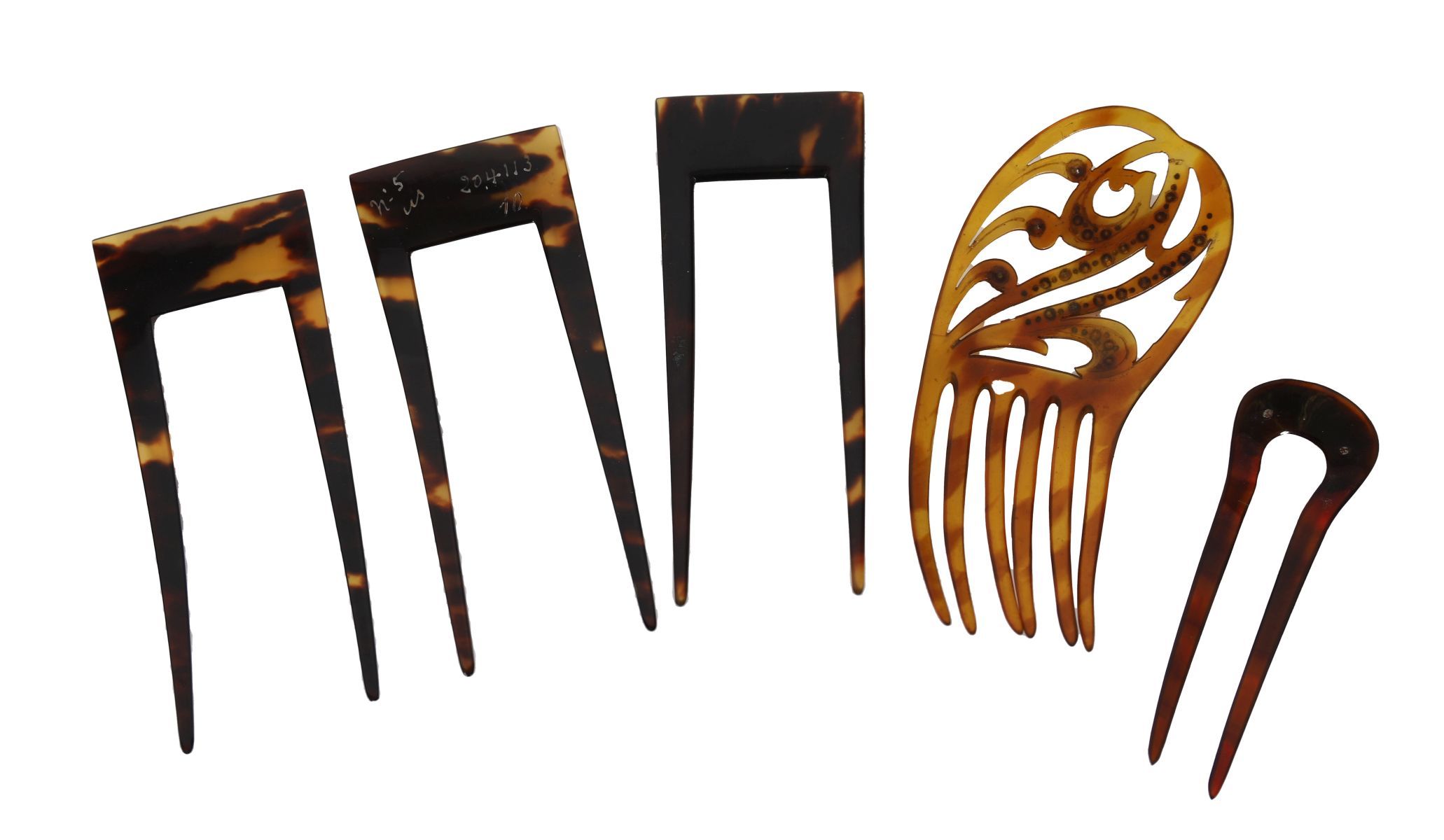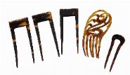 A group of 19th-century tortoiseshell hair combs, various forms with straight and curved crests.