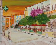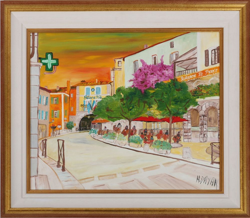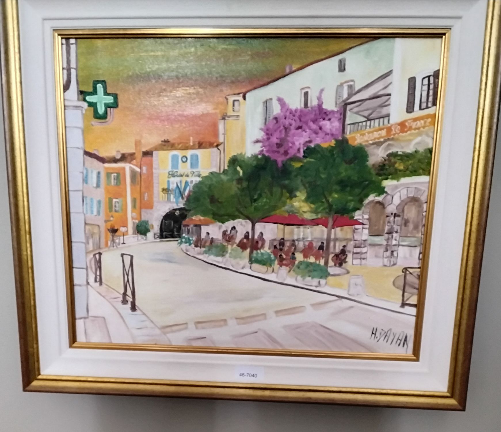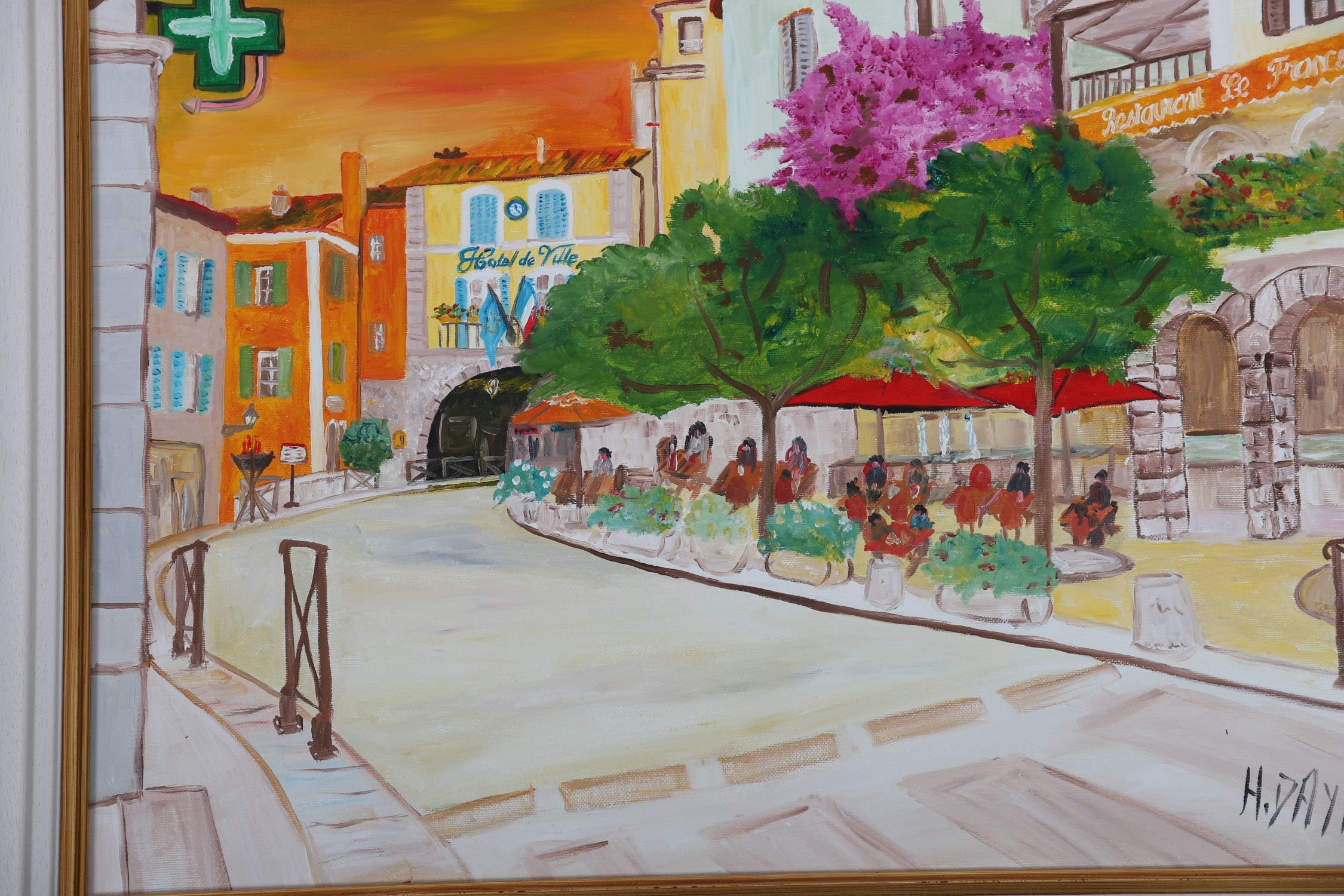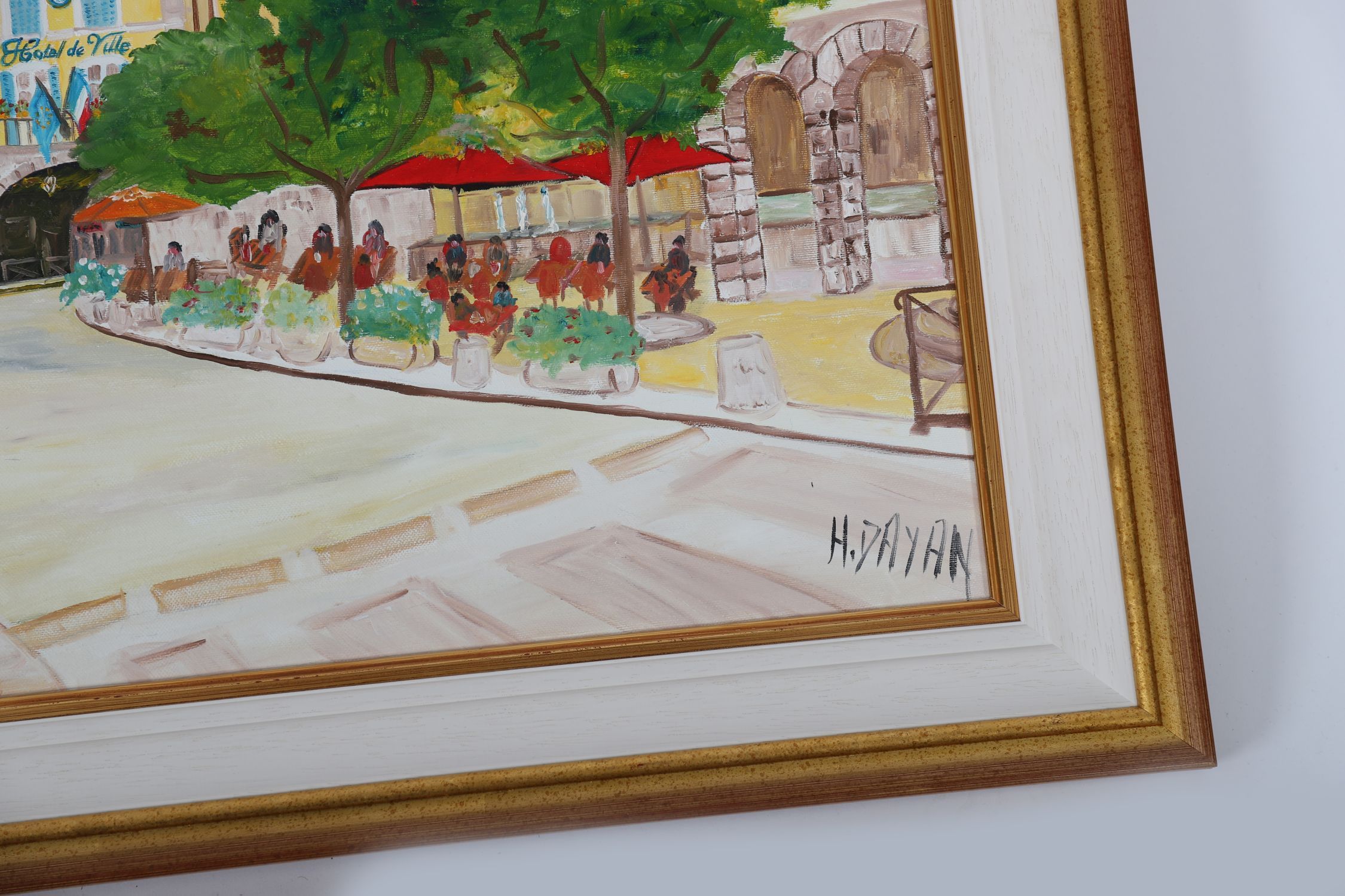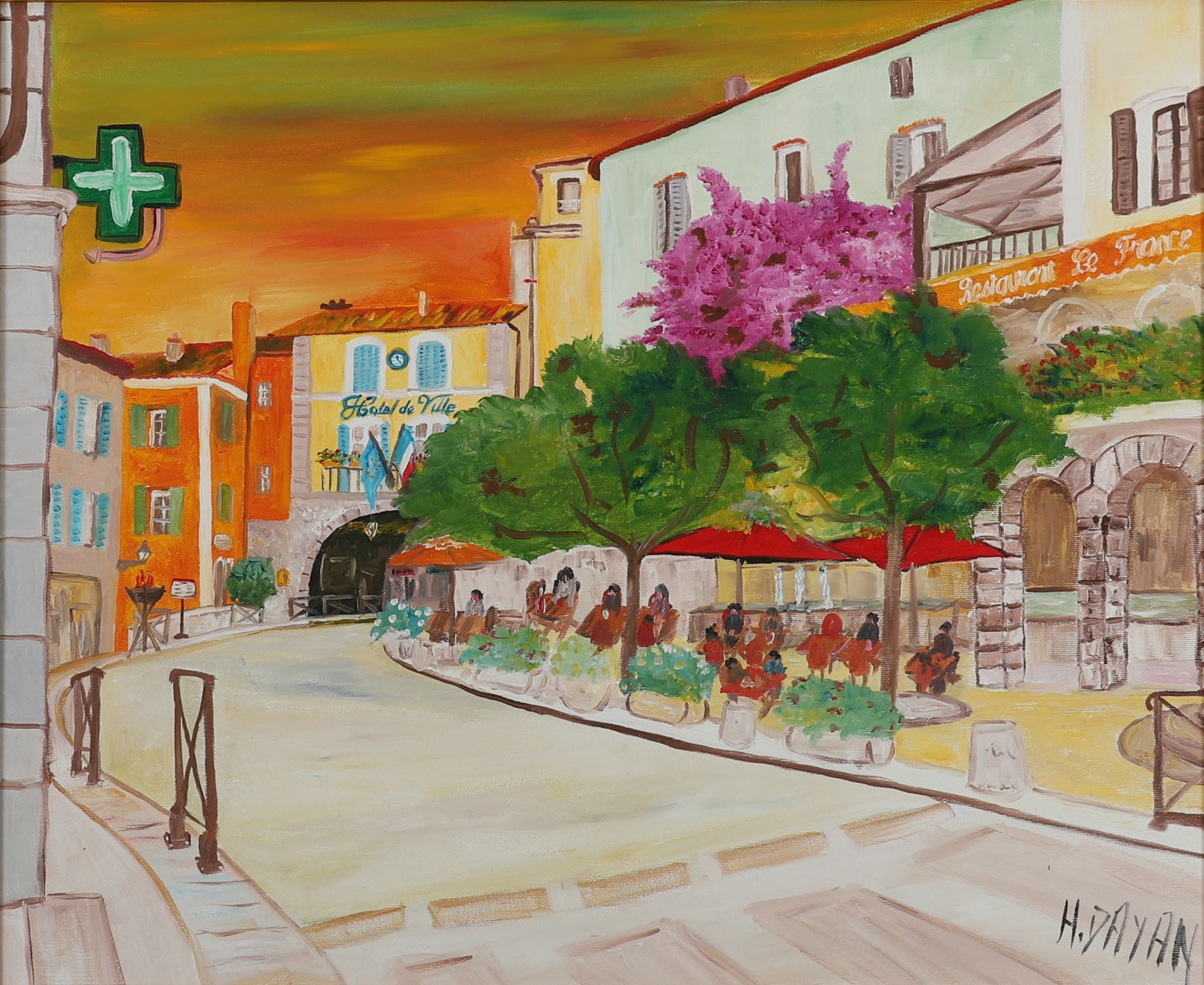 H. Dayan — A vibrant French street scene with tree-lined boulevard and café terraces, rendered in warm hues of sunset orange and green, oil on canvas, signed lower right, in white and gilt frame.