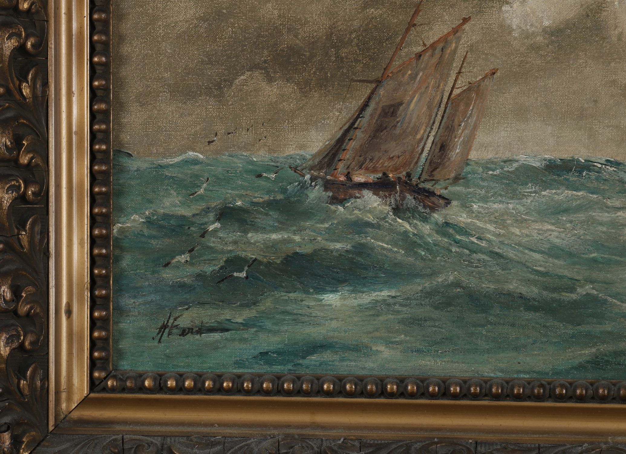 A dramatic marine oil painting by H. Ferd, depicting a sailing vessel battling rough seas near a rocky coastline under a stormy sky. The composition is full of motion, with the boat heeling in the wind and waves crashing below. Executed in a bold, textured style and housed in an ornate carved and gilded frame. Signed lower left.