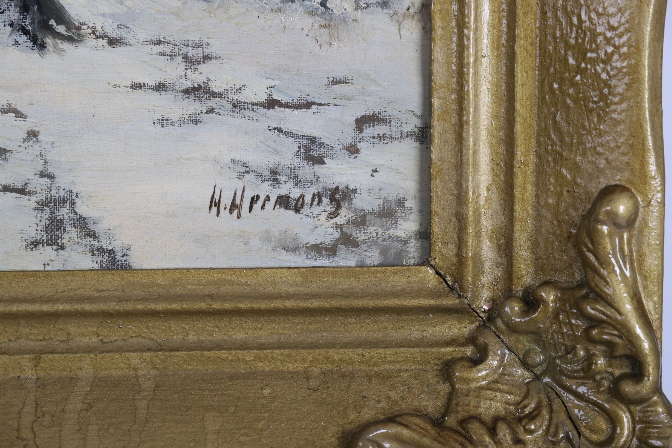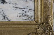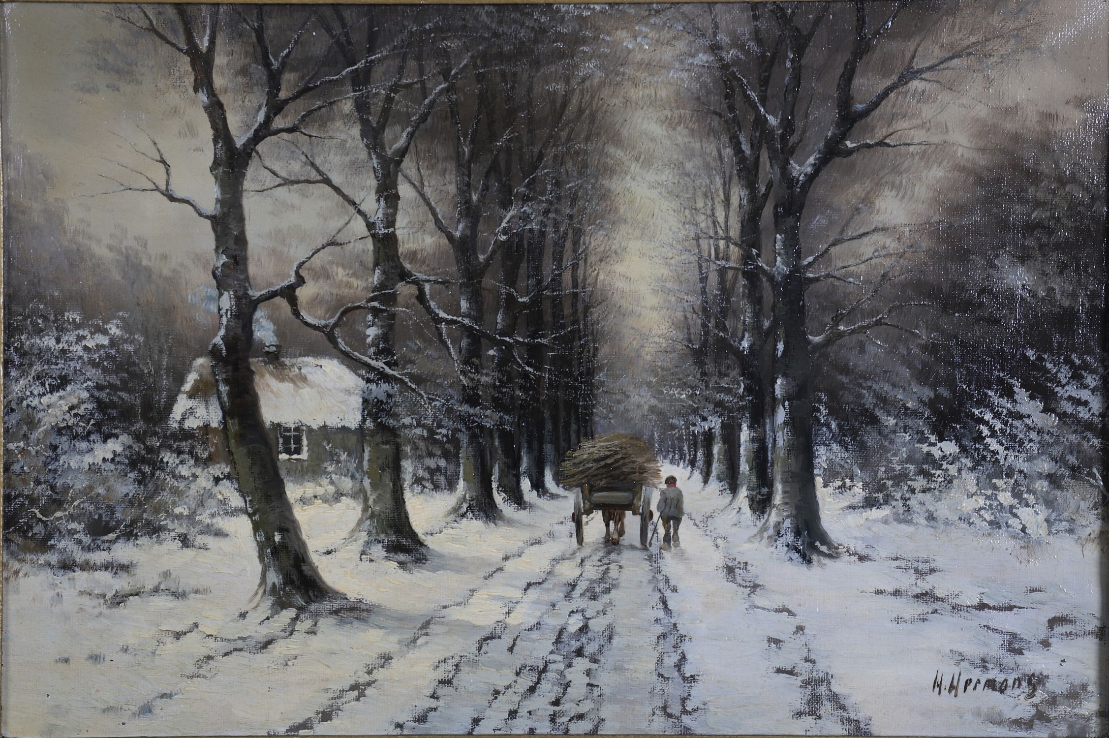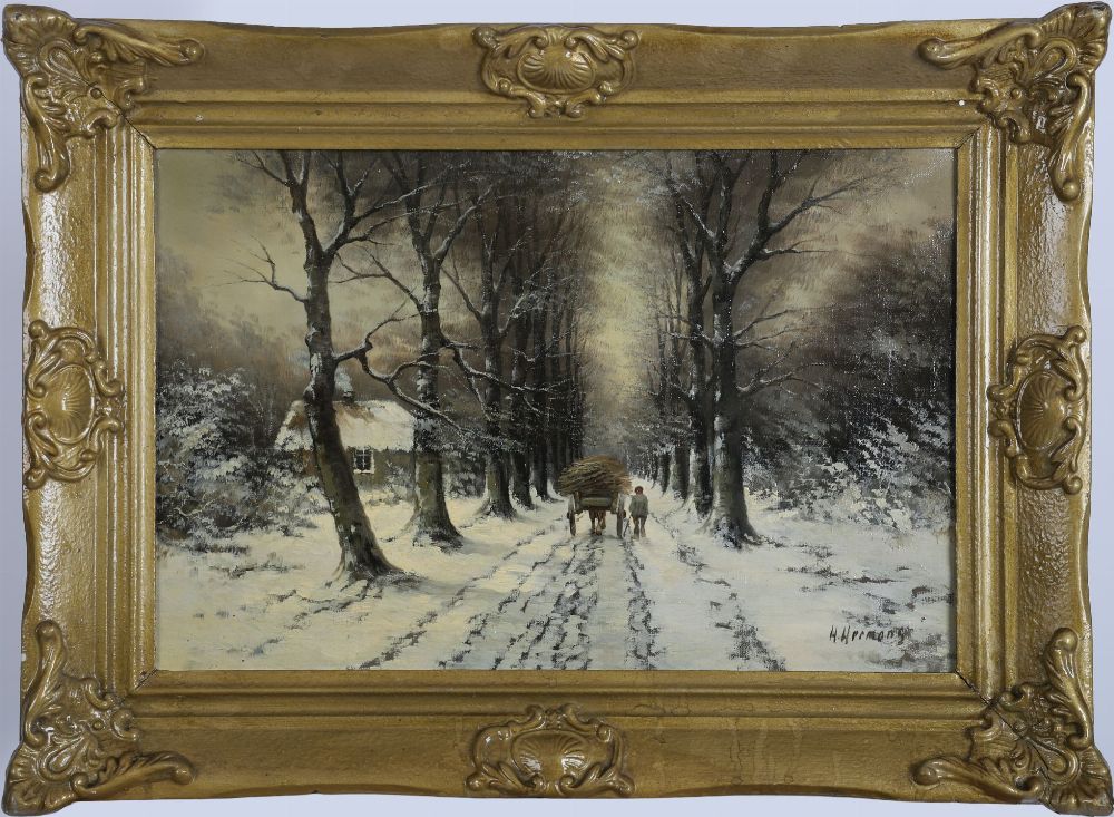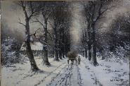 An oil painting depicting a snow-covered woodland path with a figure leading a horse and cart along the lane. Signed lower right. Presented in an ornate gilt frame. Oil on canvas.