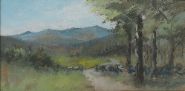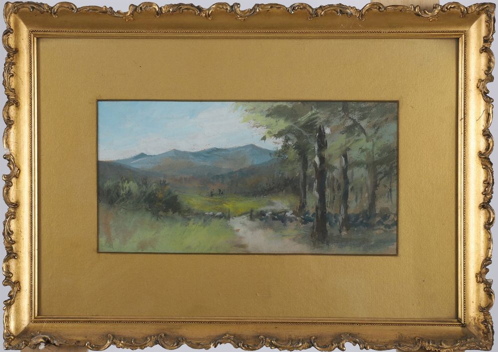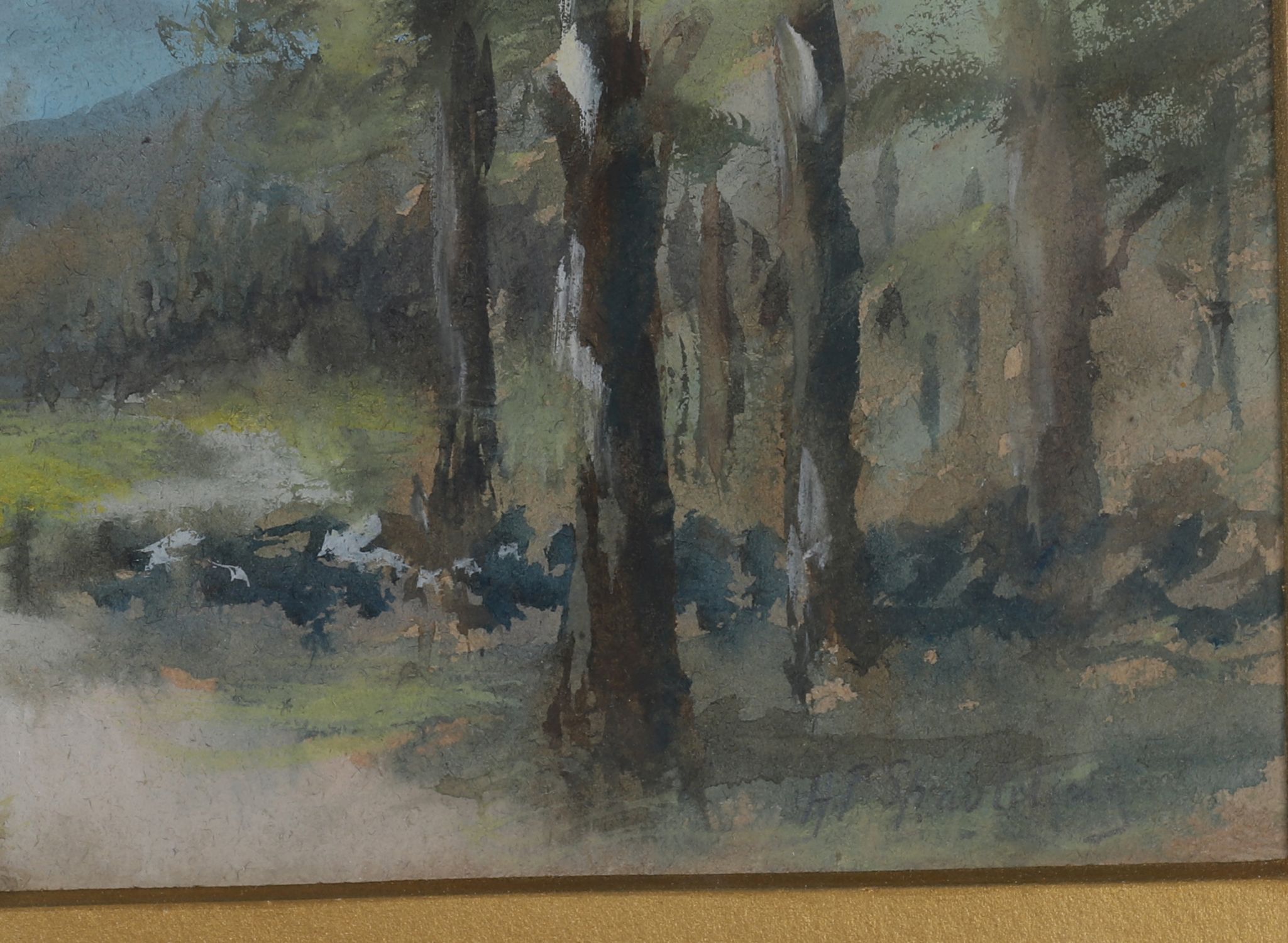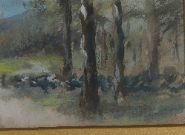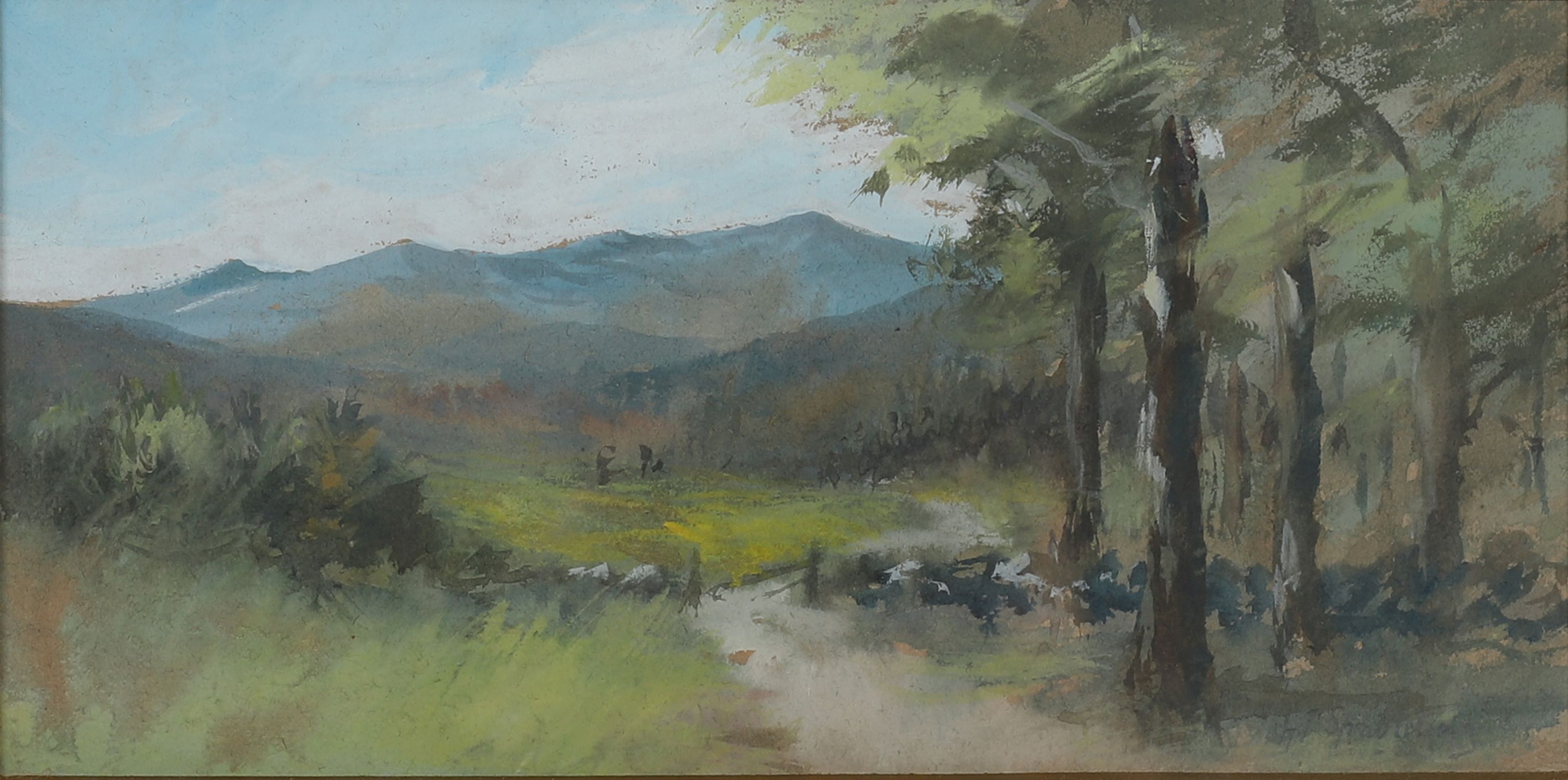 A loosely painted watercolour landscape showing a pathway through trees with distant hills, possibly in Tuscany. Signed lower right.