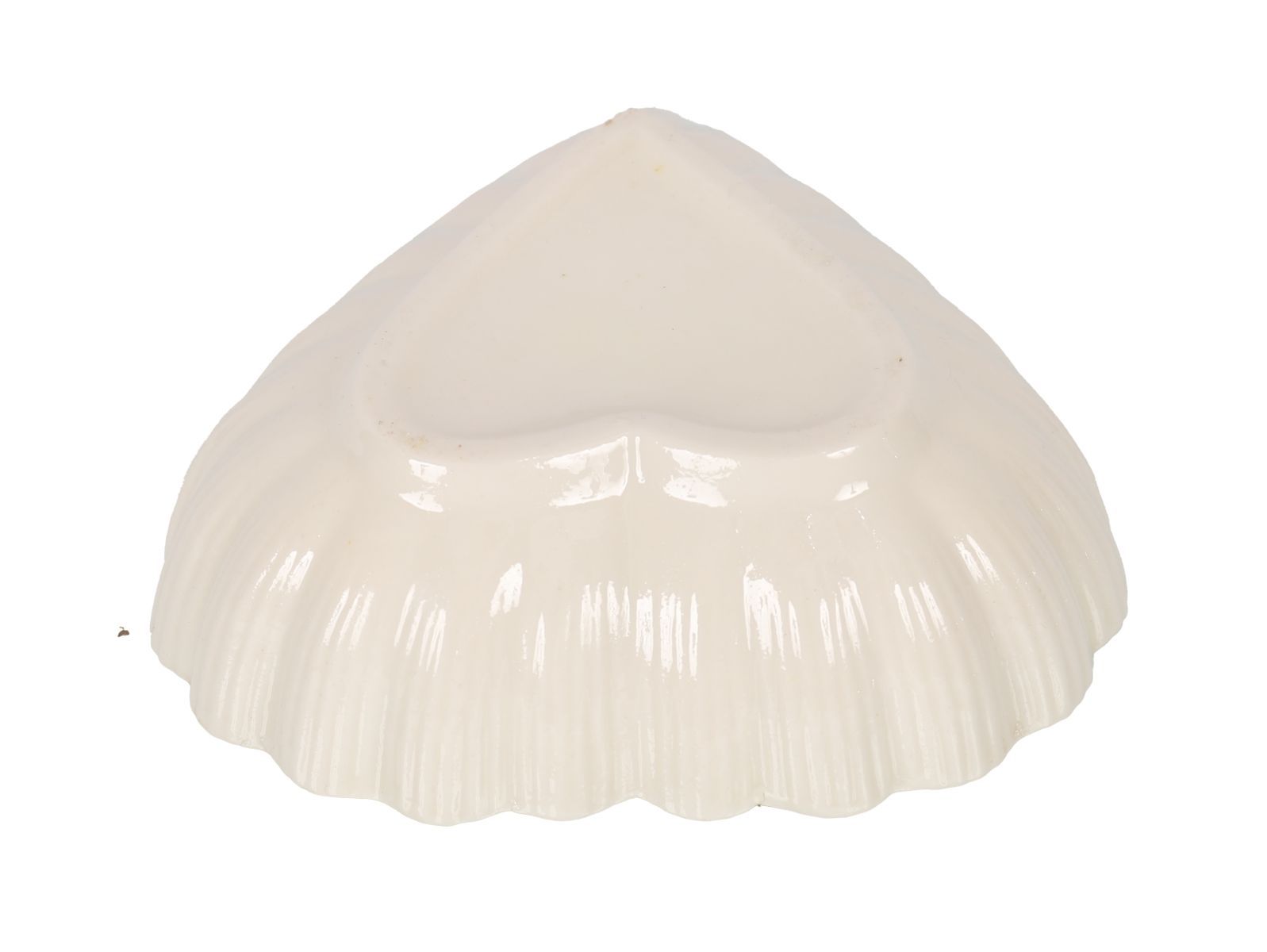 A small, white-glazed porcelain dish of heart form, with scalloped edges and moulded leaf pattern to the underside. Possibly English or Continental manufacture.