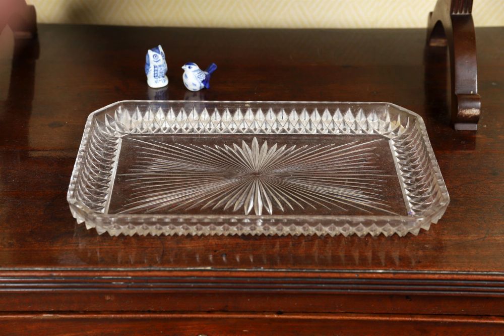 A heavy rectangular cut glass jewellery plateau, decorated with radiating starburst motifs and faceted borders. Suitable for dressing table use.