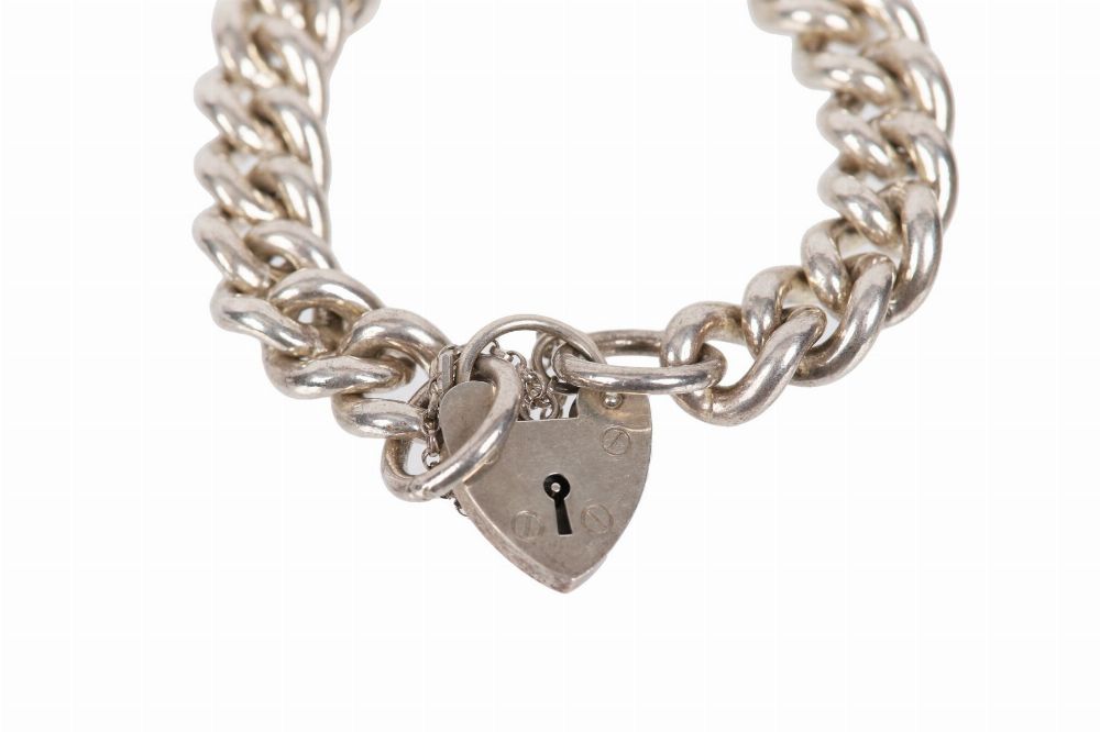 A solid silver curb link bracelet with heart-shaped padlock clasp and safety chain. Total weight approx. 83 g.