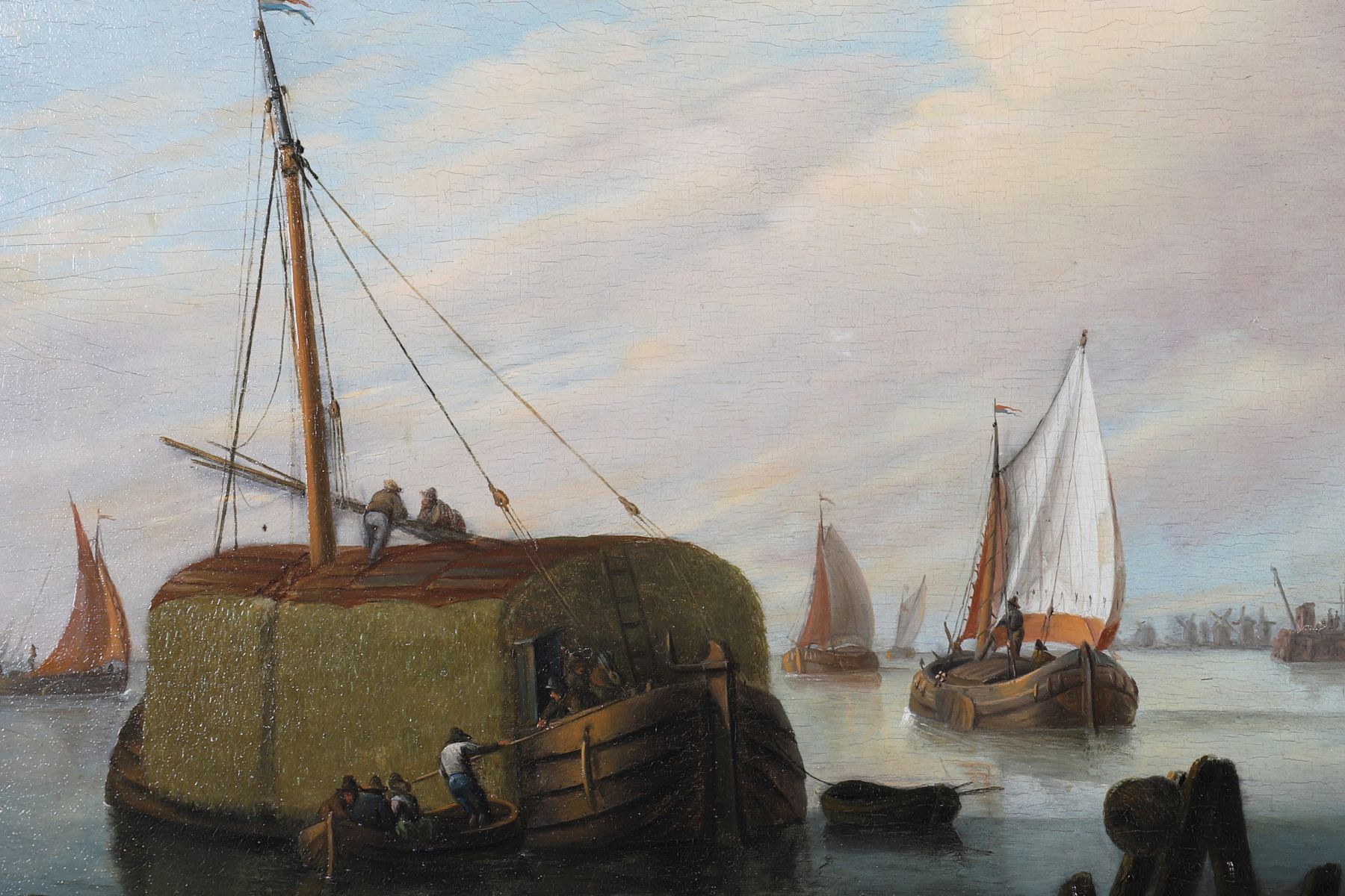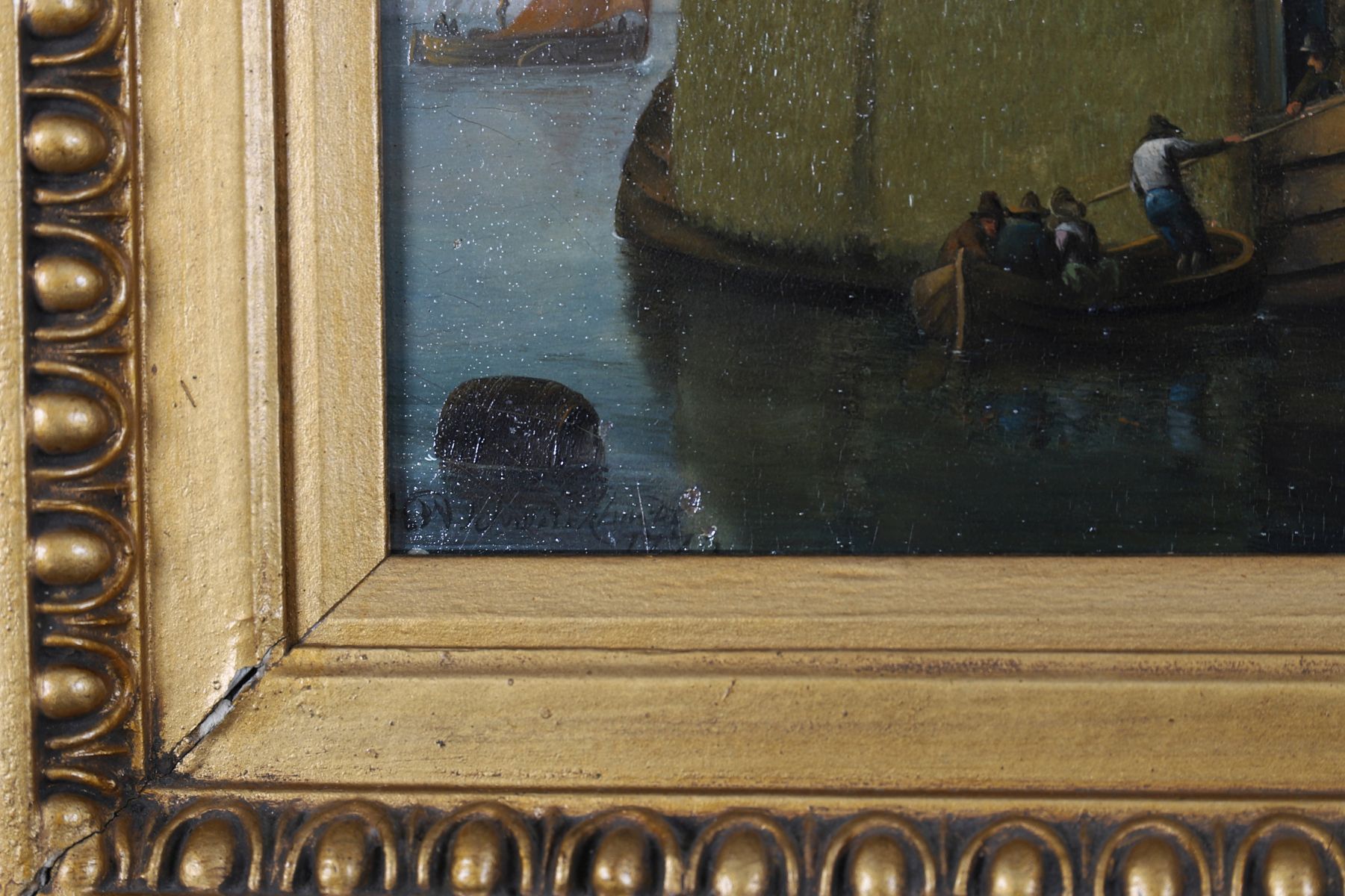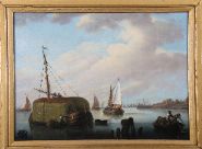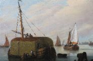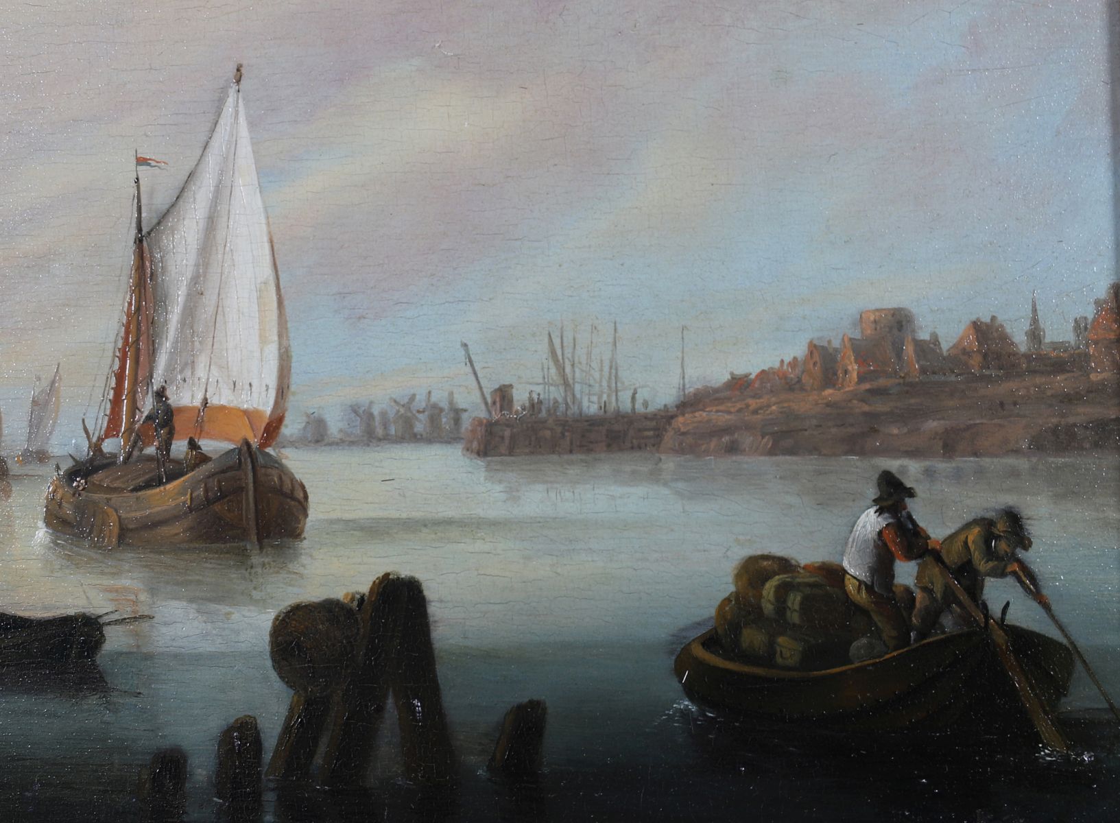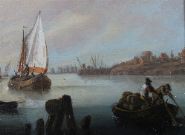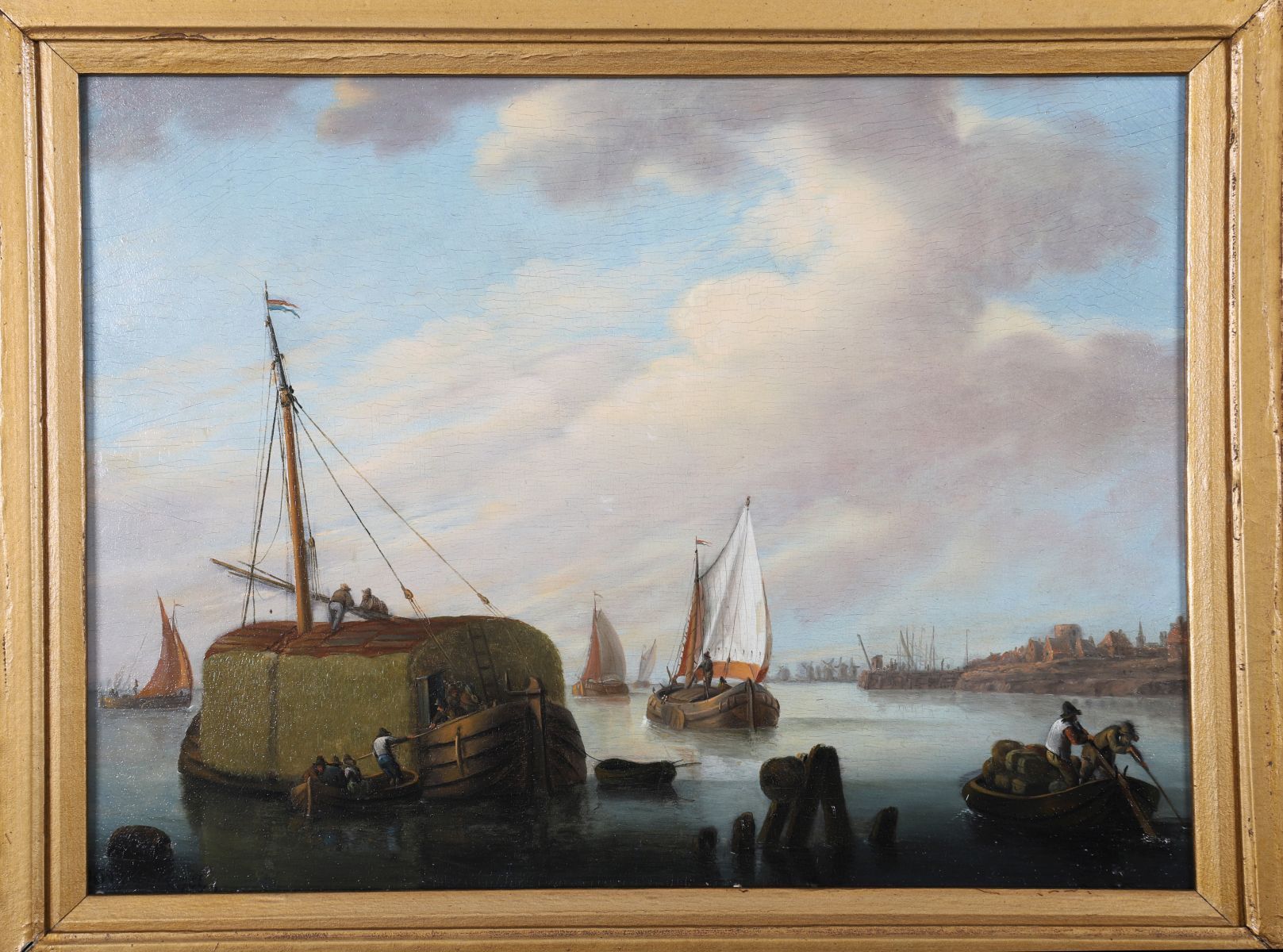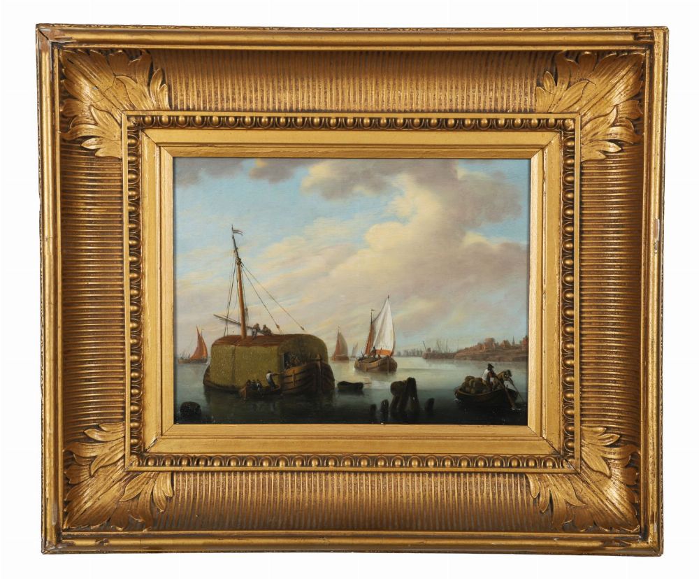 A serene riverside scene with sailing barges and figures loading cargo under a wide sky. Oil on panel, signed lower left. Presented in a fluted gilt frame.