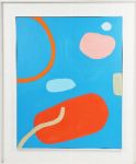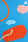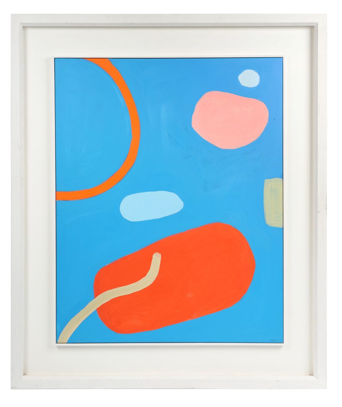 A bold abstract composition dominated by cobalt blue, punctuated by organic forms in orange, peach, and soft grey. The simplicity of form and balanced colour palette evoke mid-century modernism with a contemporary freshness.