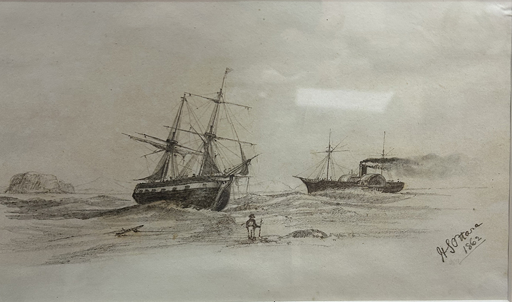 Signed and dated 1962. Pencil and wash on paper depicting two sailing vessels drawn up on a strand with figures in the foreground. Framed and glazed.