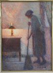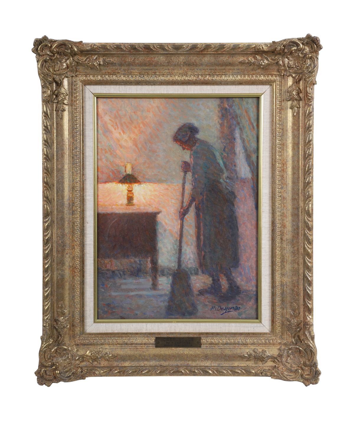 A refined and atmospheric interior scene, Desportes masterfully renders the soft fall of evening light as a woman sweeps beside a lamplit table. The delicate interplay of shadow, muted colour, and quiet domestic gesture exemplifies the artist’s sensitivity to tone and mood.