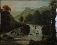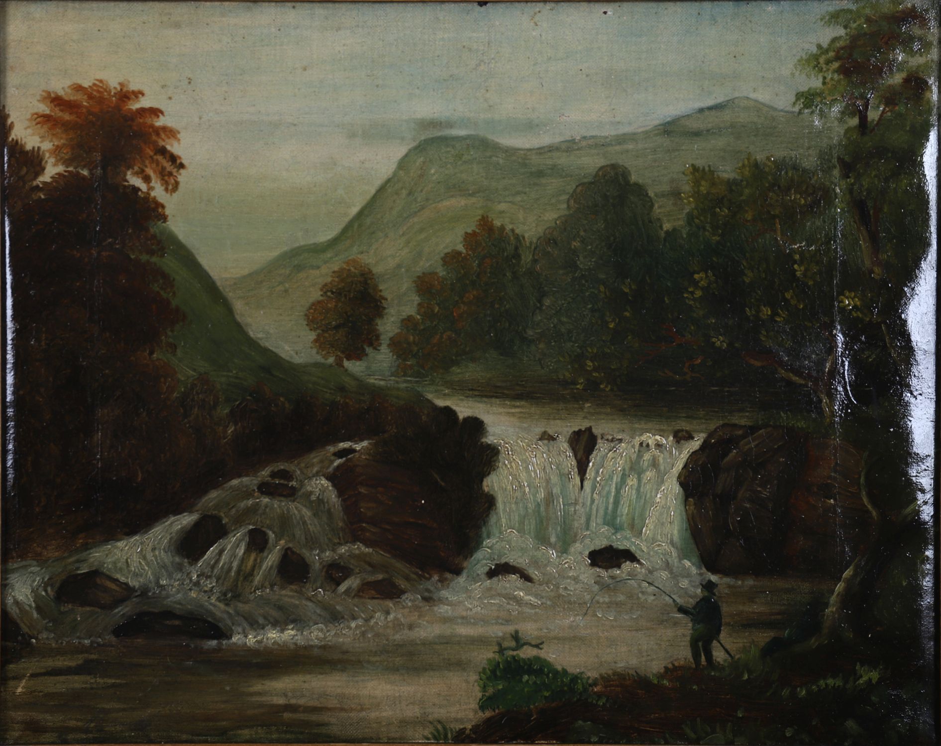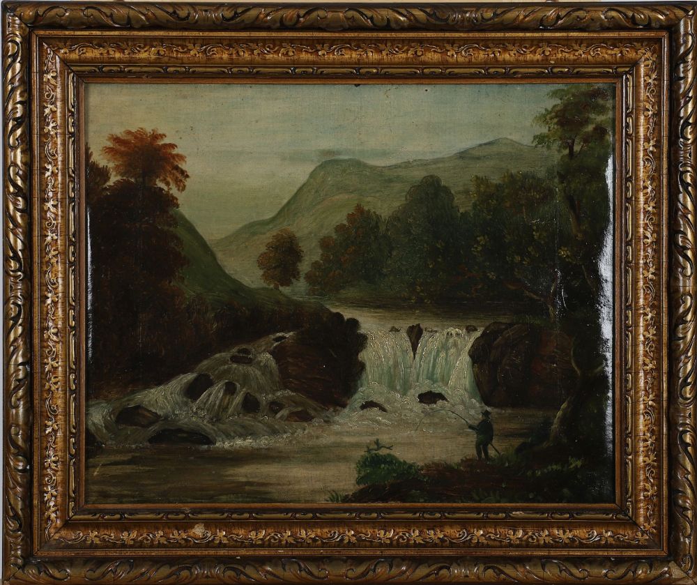 A framed oil painting depicting a river and cascading waterfall within a wooded valley, with a figure fishing in the foreground. Enclosed in an ornate gilt frame. Oil on canvas.