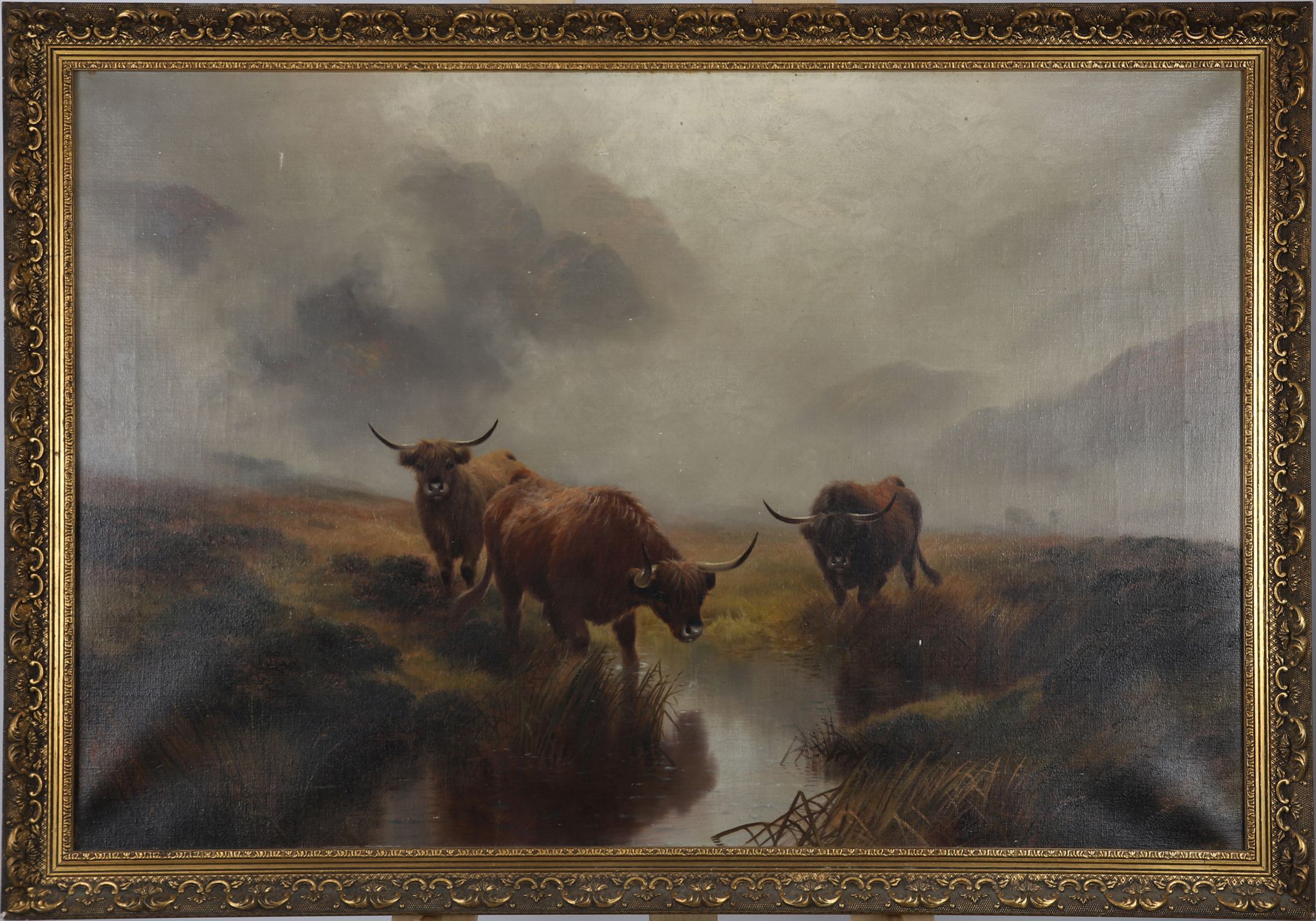 A large and atmospheric oil on canvas depicting three Highland cattle watering in a stream beneath a brooding, mist-filled sky, surrounded by wild moorland. The scene captures the rugged majesty of the Scottish Highlands with careful attention to mood, light, and detail. Presented in an ornate gilt scroll frame.