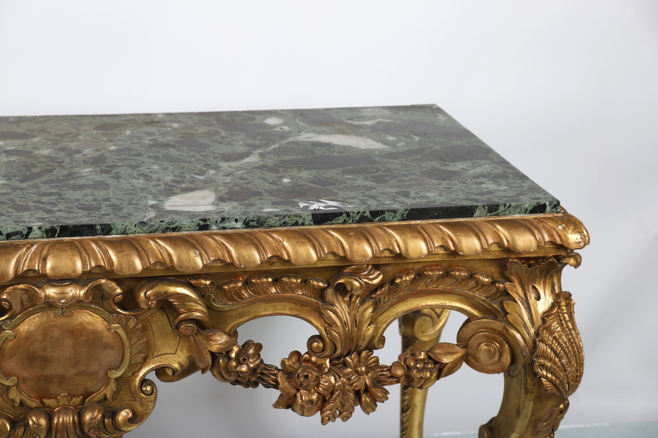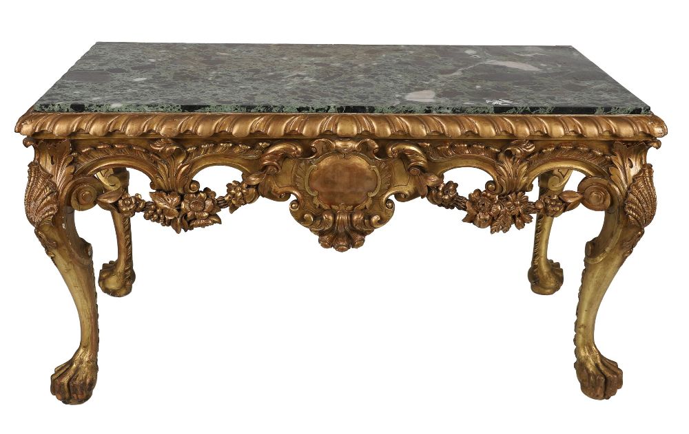 A highly important and richly carved 19th-century Irish giltwood console table, the rectangular verde antico marble top above a deep frieze profusely carved with scrolling acanthus, floral festoons, and central cartouche. The front corners are boldly modelled with volutes and flowerheads, supported on exaggerated cabriole legs terminating in paw feet.
