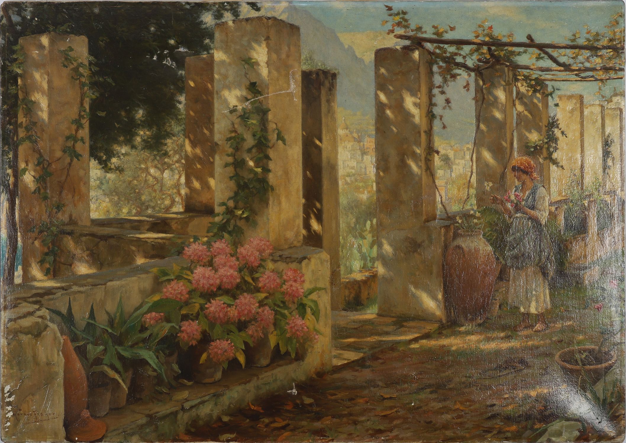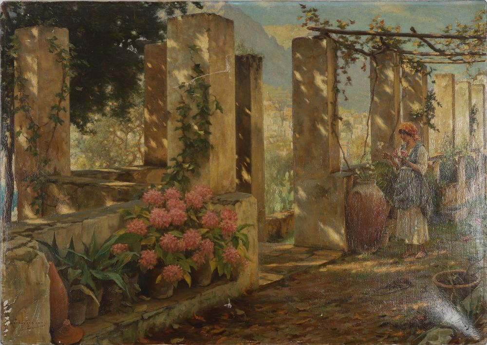 Possibly The Isle of Capri. Oil on canvas depicting a young girl in a shaded colonnaded terrace, sunlight filtering through vine-covered beams, with a view over a distant coastal town. Rich in detail and atmosphere, capturing the interplay of light and shadow. Unframed.