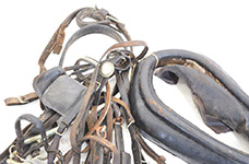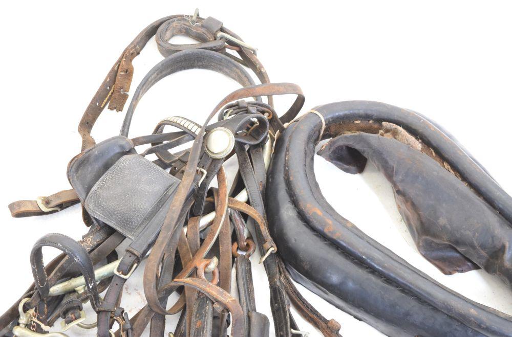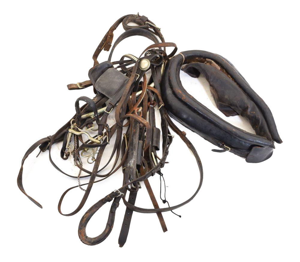 A traditional leather horse driving harness, complete with collar, bridle, reins, and fittings.