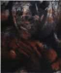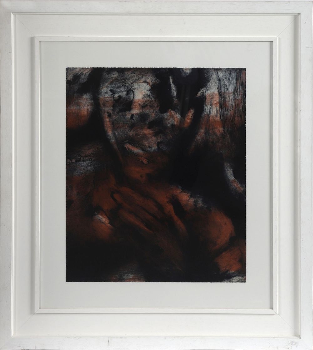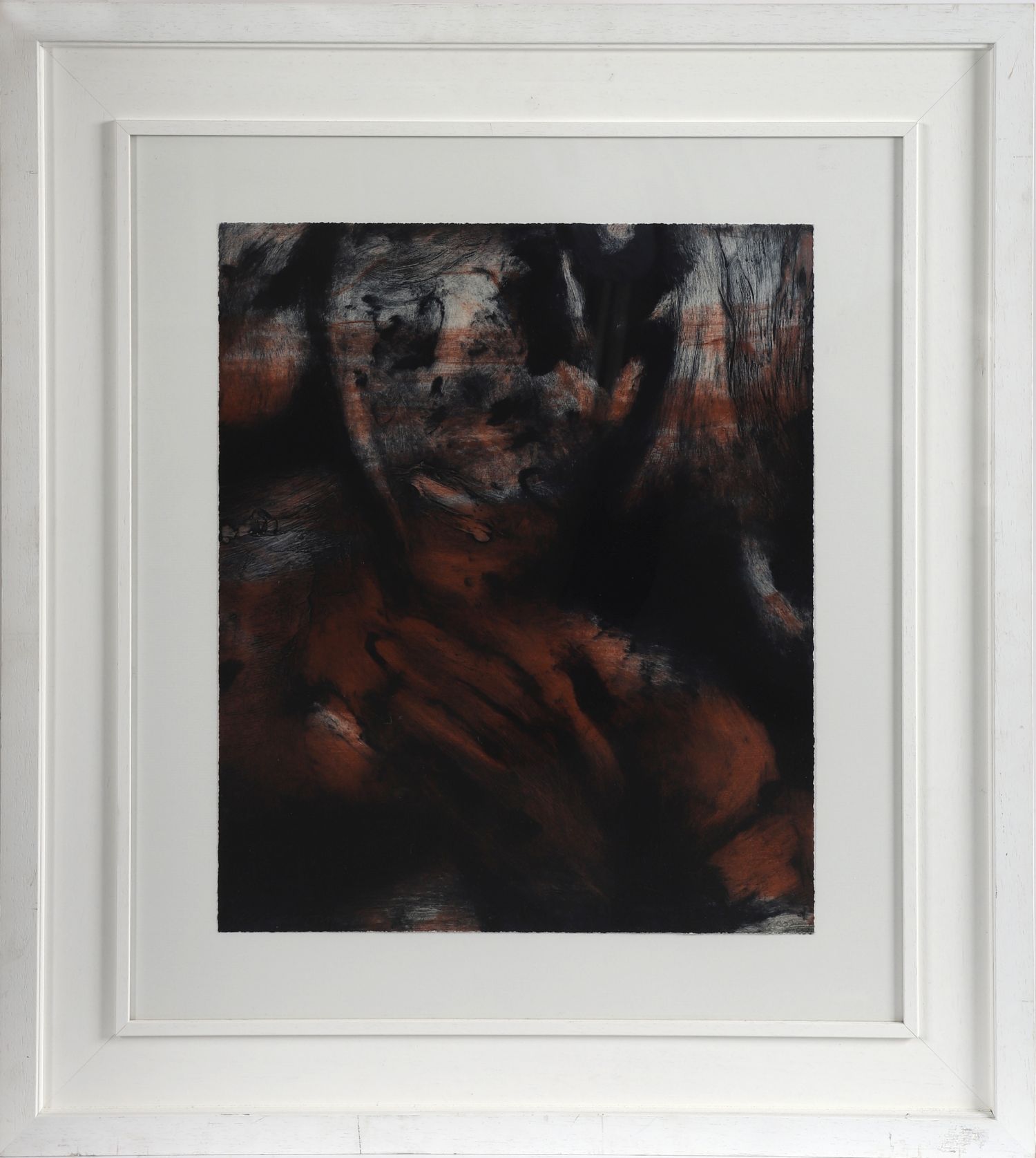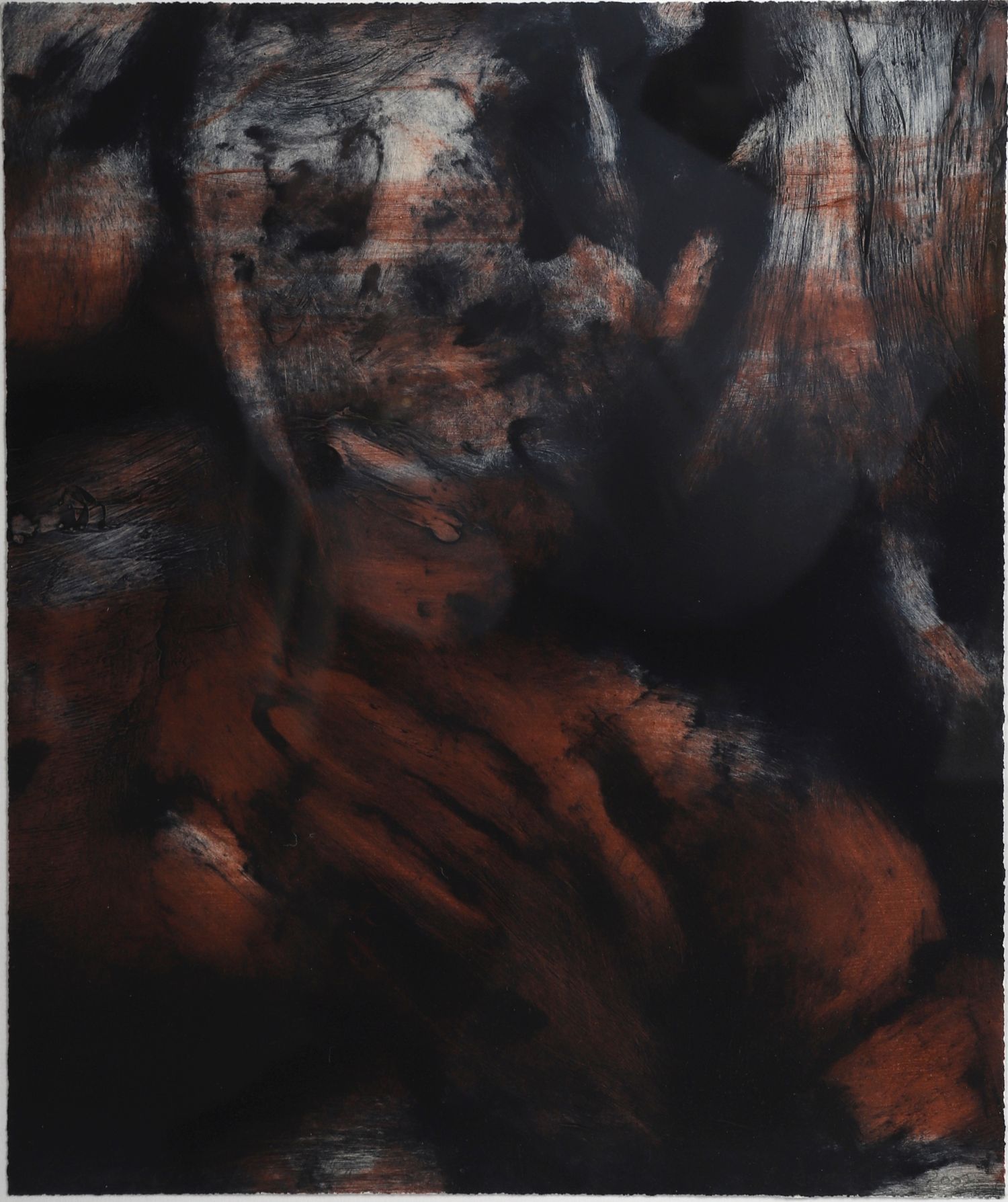 Description: A brooding, abstract composition in dark rust and black tones evoking layered history and memory. Mixed media on paper. Framed under glass.