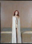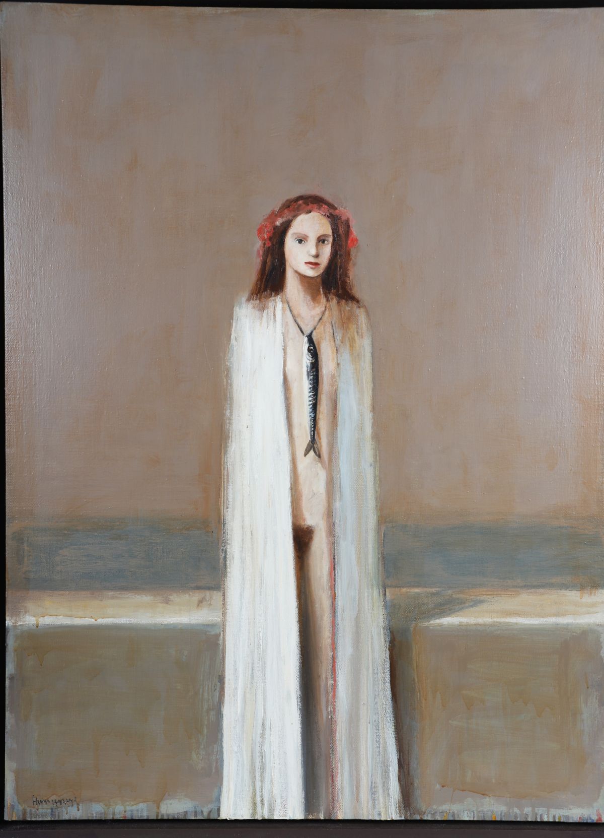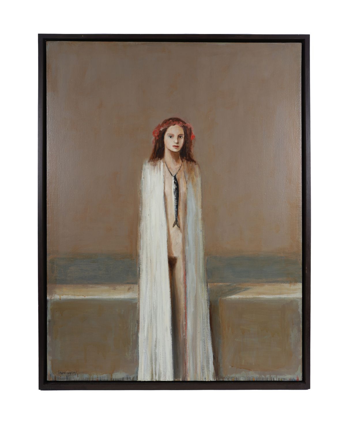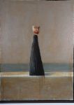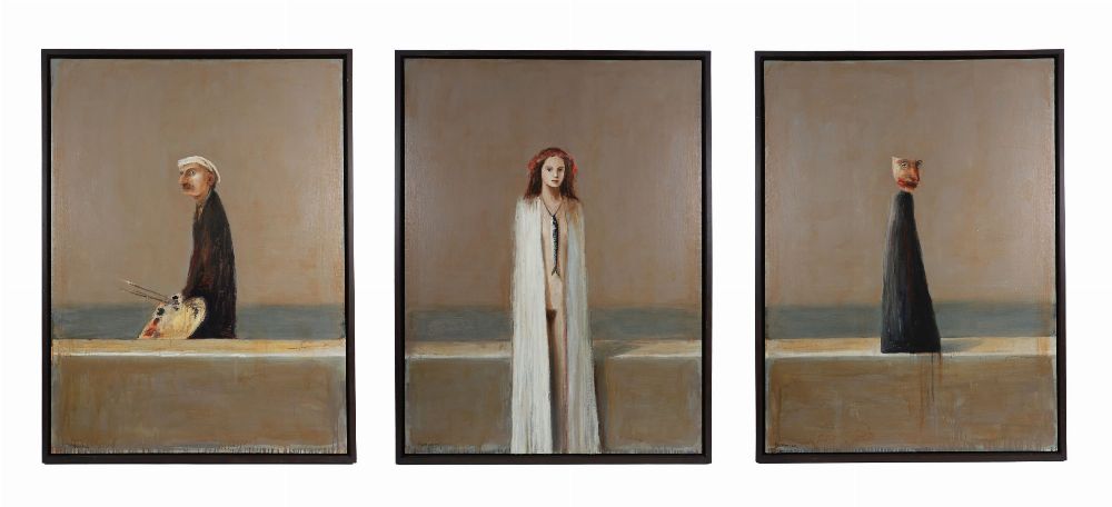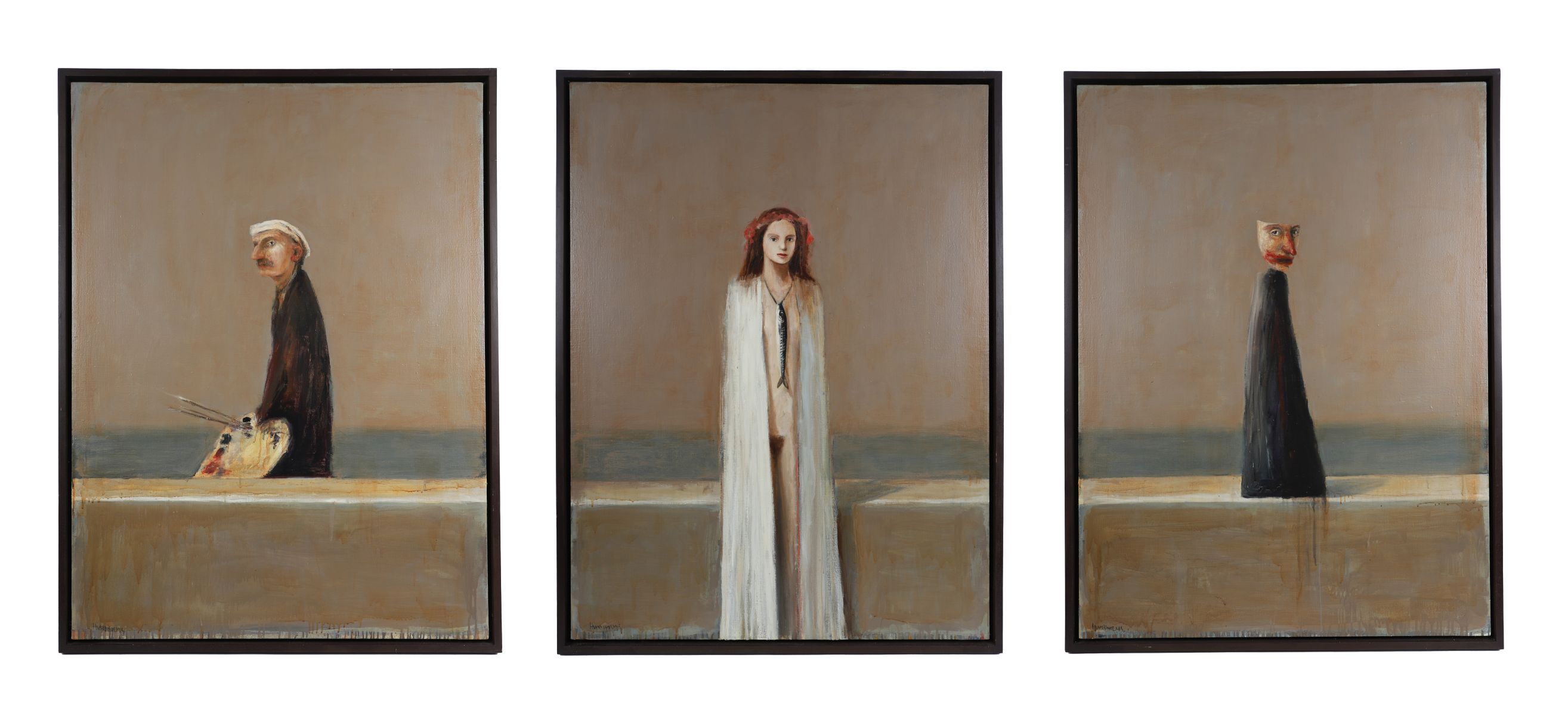 Although today Humphreys is known as a resolutely abstract painter, some twenty years ago, as with this triptych, The Pagan, the Model and the Mask, his work was more figurative. Dating from 2001/02, the triptych, a combination of abstract background and three standing figures, contains elements both of autobiography and allegory. Each panel depicts a single figure, set against horizontal bands of pale umber, blue and brown. In the left panel, a figure holding brushes and palette can be read as representing the artist. In the centre, wearing a necklace of mackerel fish, stands a young woman wearing a crown of red leaves—perhaps a muse—while on the right is an enigmatic cloaked figure with a mask for a head. Although the