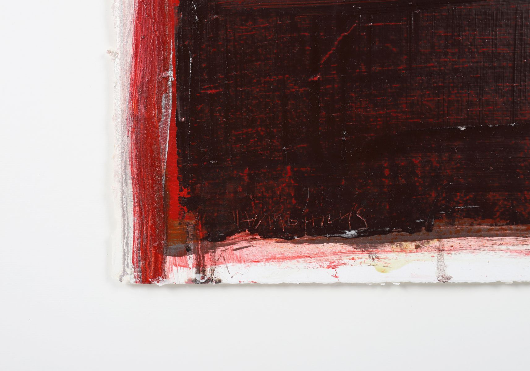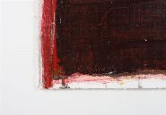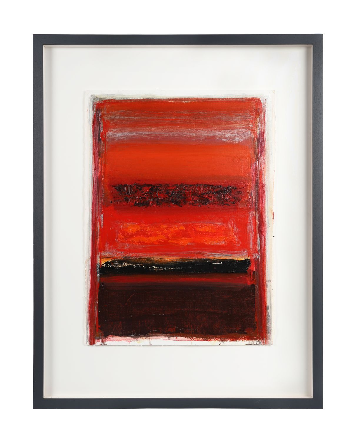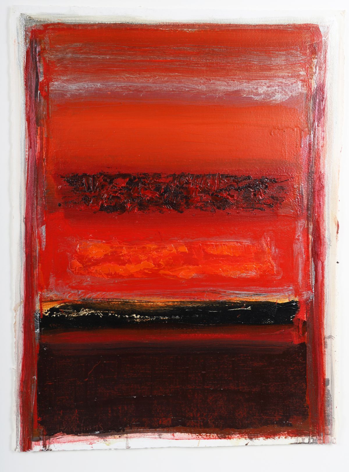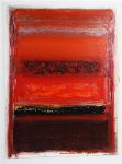 A vivid abstract oil on paper dominated by red and crimson fields with dark and fiery undertones. Expressive horizontal bands are layered in varying densities of pigment, producing a sense of rhythmic movement and spatial depth. Signed lower left.