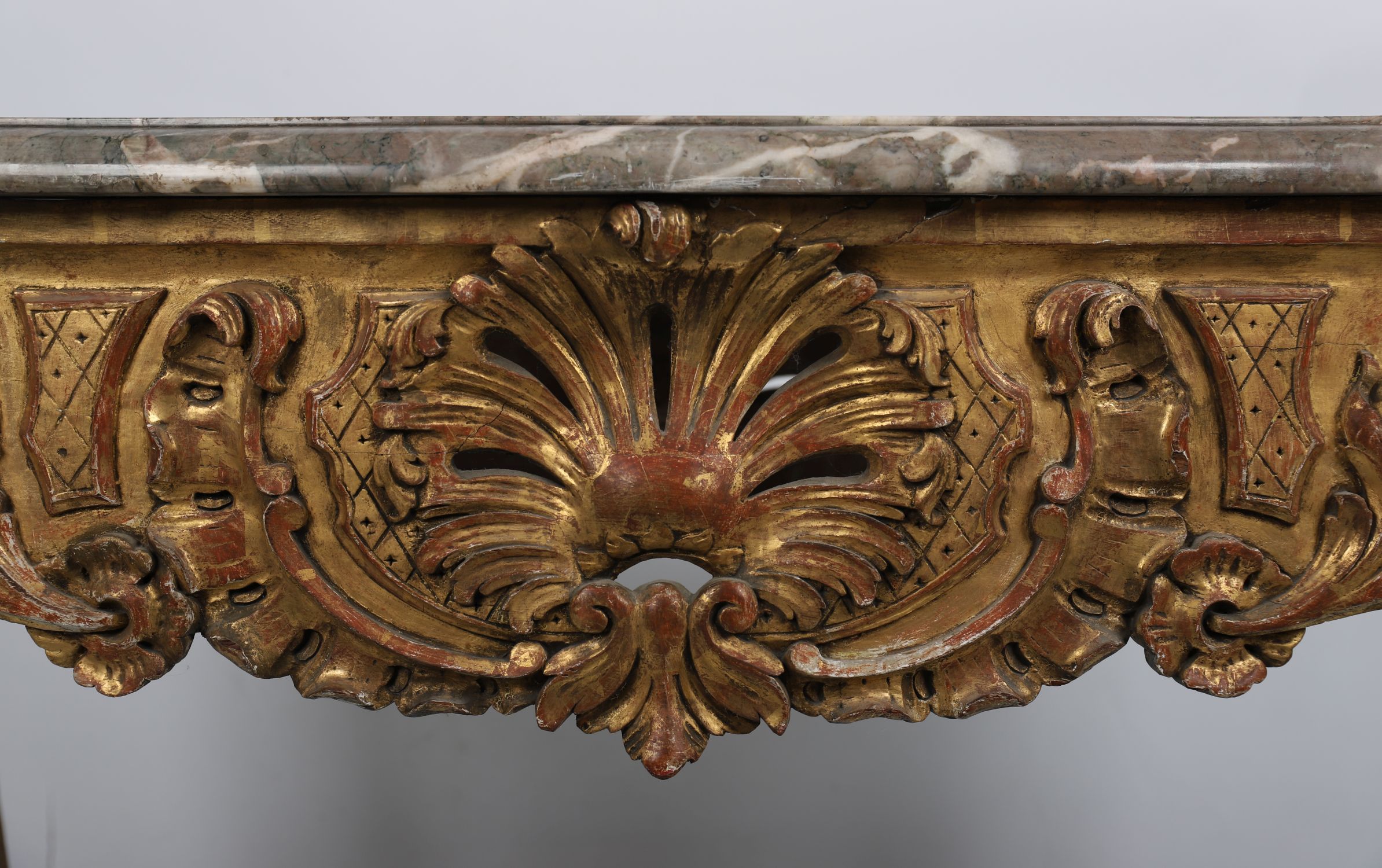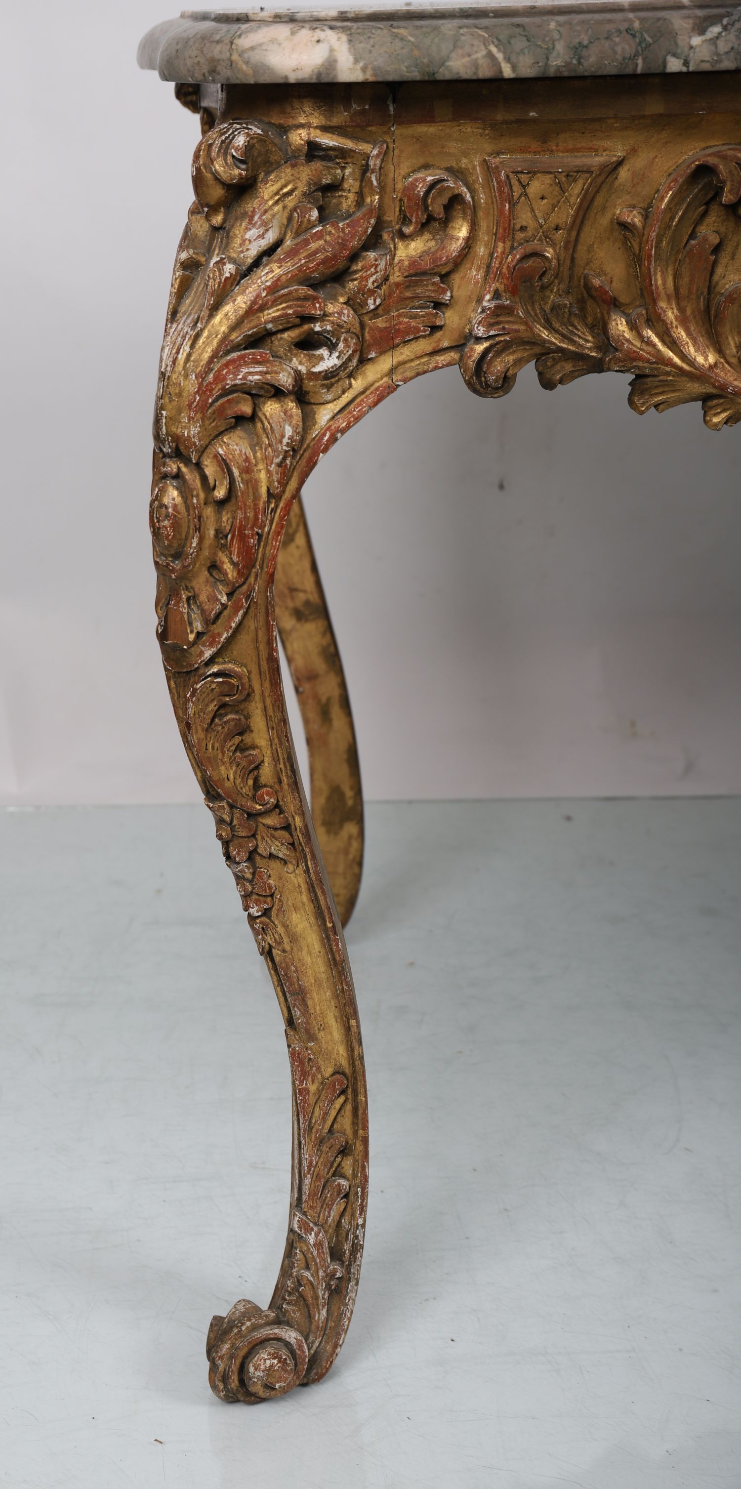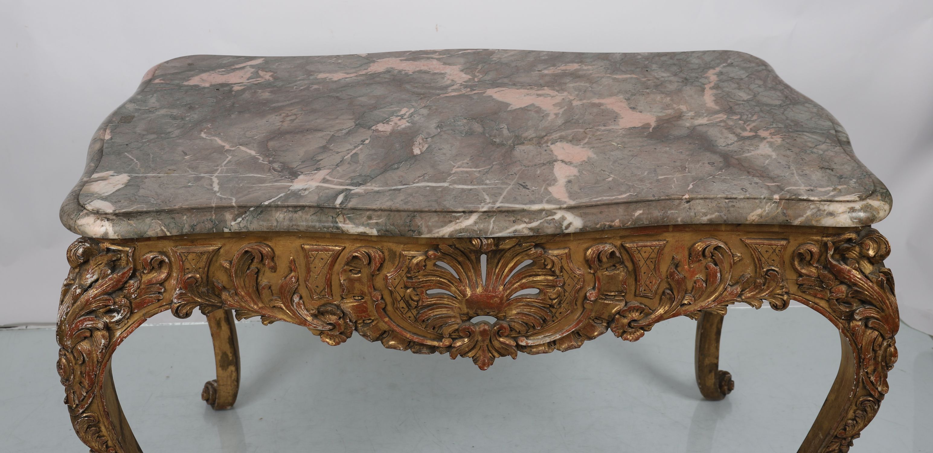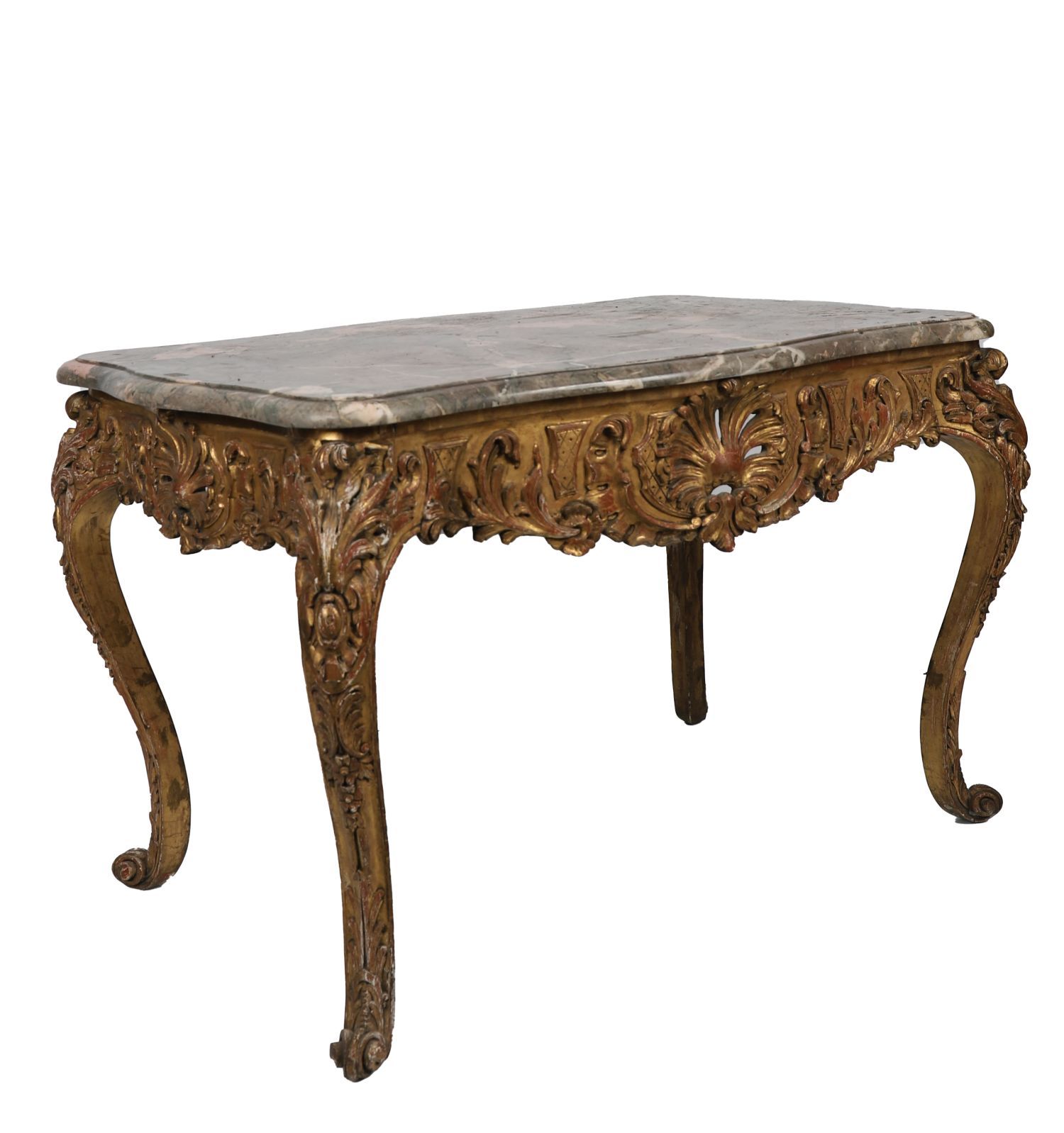 An important early 18th century carved giltwood centre table, of bold architectural proportion. The serpentine frieze is finely carved with scrolling acanthus foliage, each side centred by a prominent scallop shell cartouche, flanked by further foliate scrolls. The whole is raised on cabriole legs with acanthus carving to the knees, terminating on leaf scrolls feet. Retains its original richly coloured marble top.