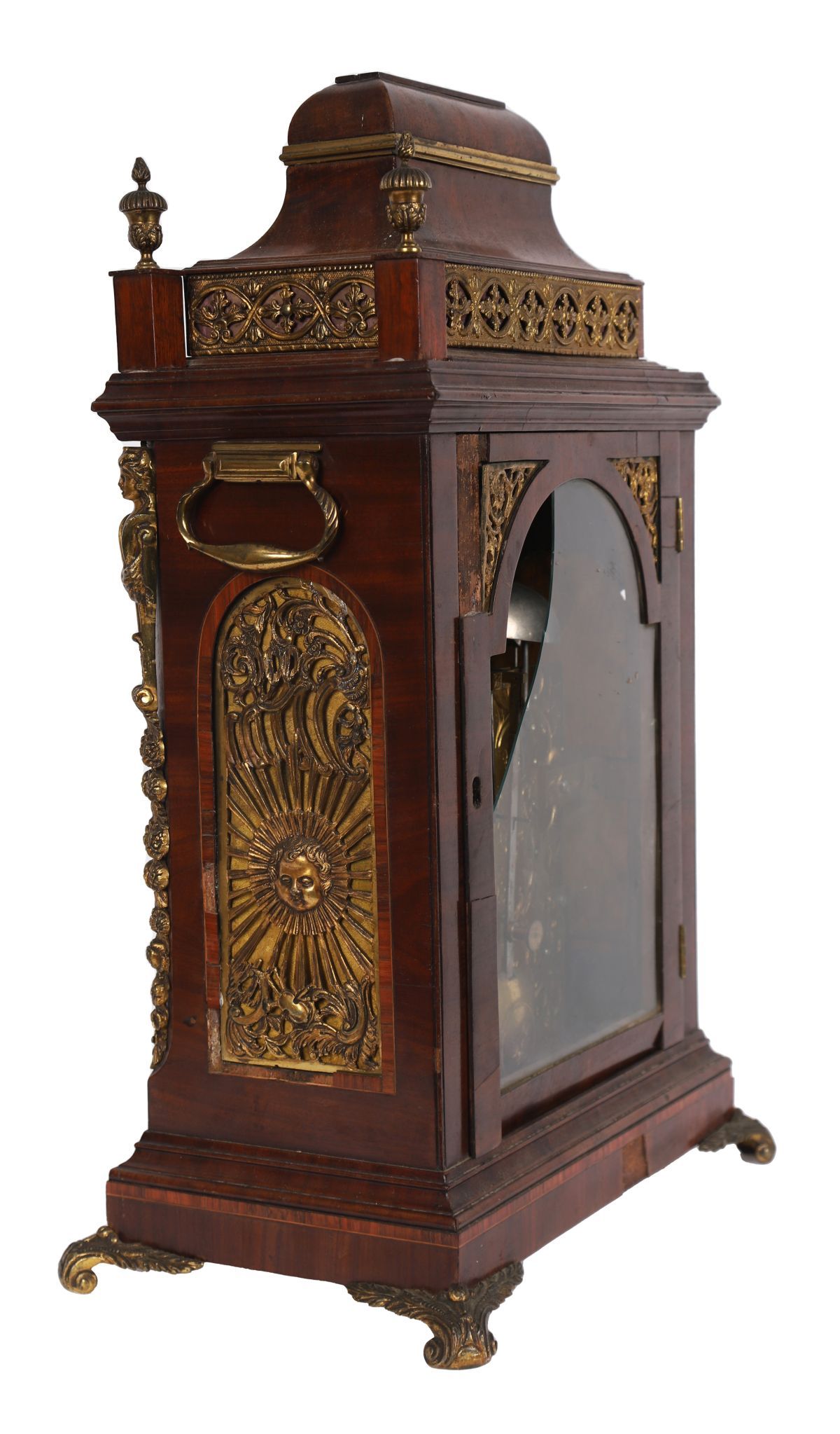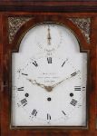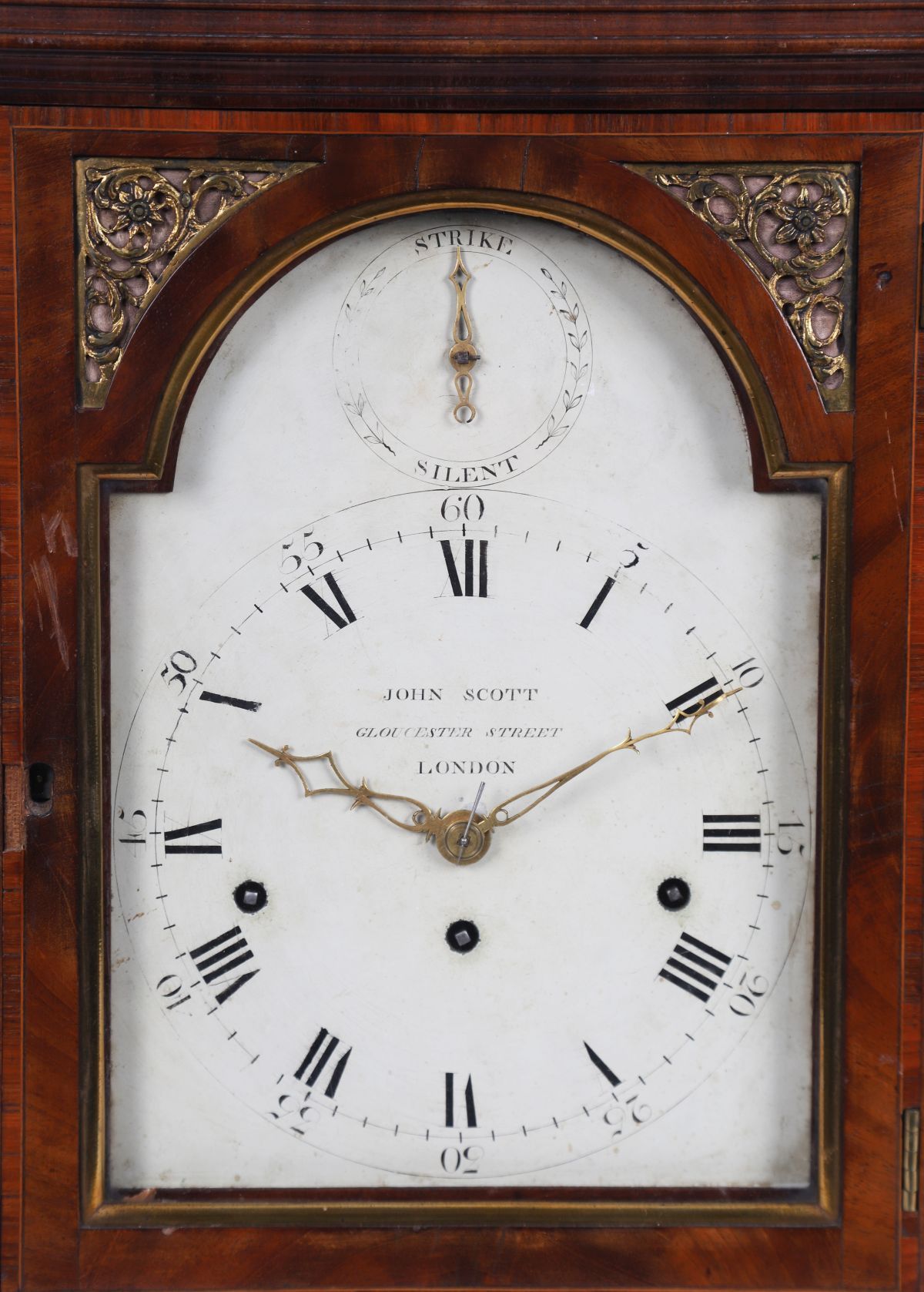 the white enamelled square arched dial with Roman numerals within an ormolu and fruit wood inlaid case below a stepped cavetto Prince of Wales plume cartouche and roll over pediment flanked by turned ormolu finials, raised on scroll feet.