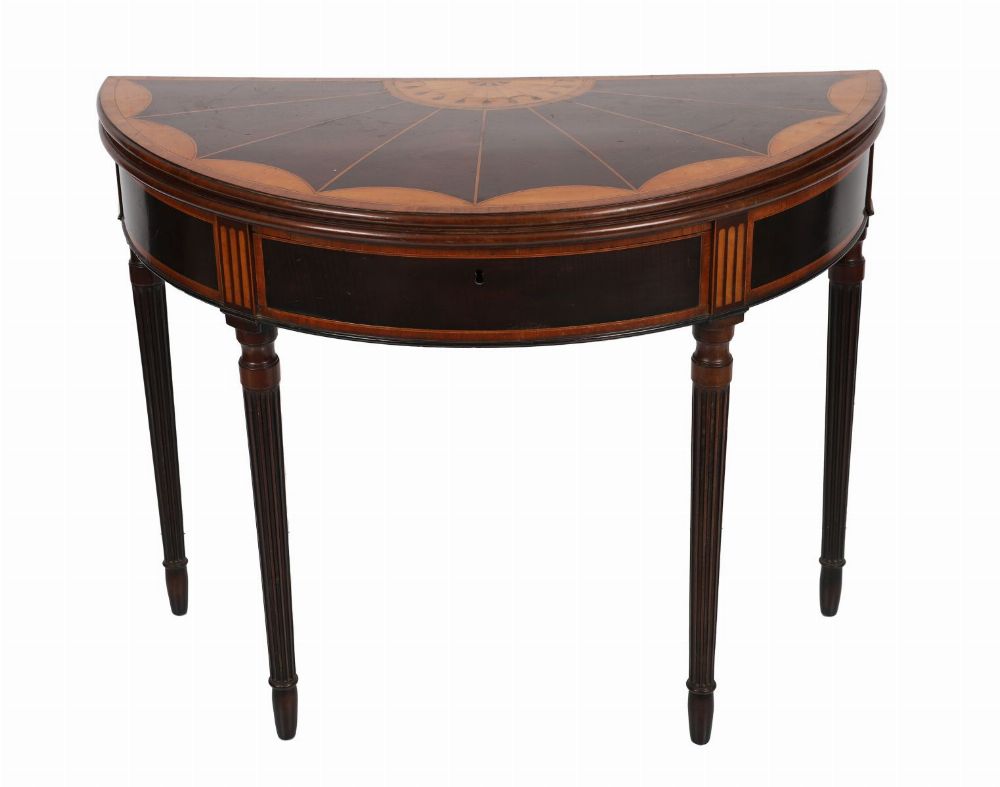 A fine 18th-century demi-lune card table, the top inlaid with radiating satinwood fan and segmental design, opening to reveal a baize-lined interior, on fluted tapering legs.