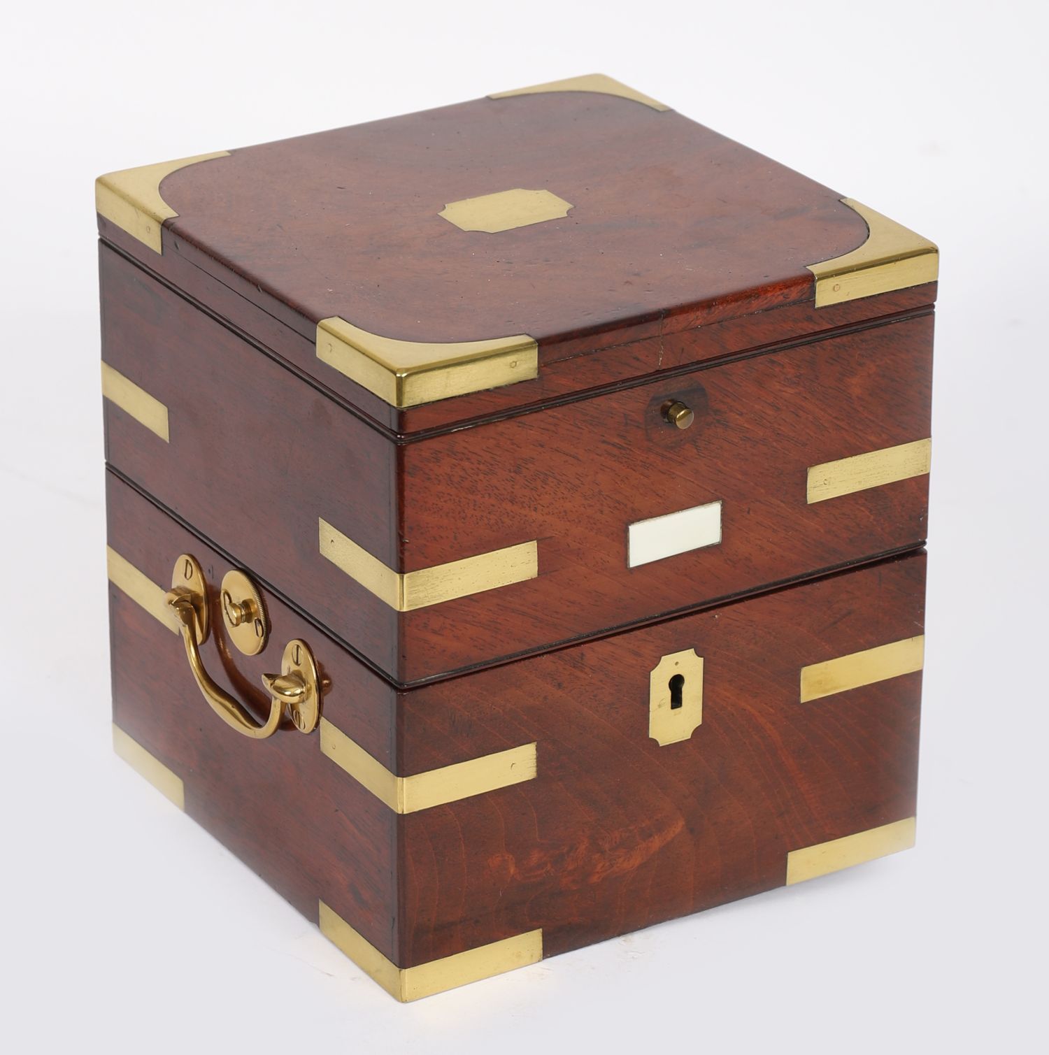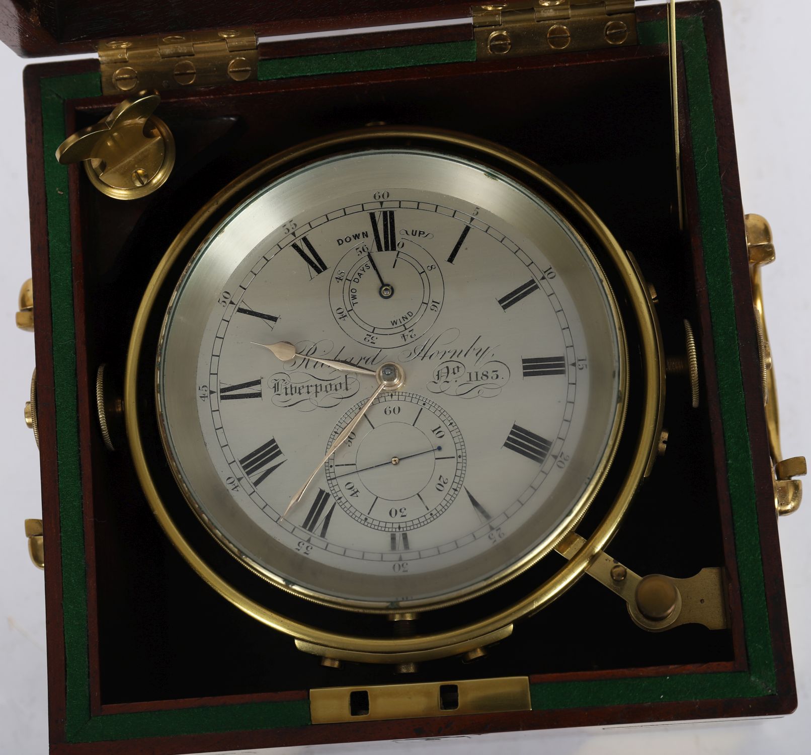 A fine 19th century two-day marine chronometer in brass and mahogany gimbal box, signed to the silvered dial “Richard Hornby, Liverpool.” Dial with Roman numerals, subsidiary seconds dial, up-and-down power reserve indicator, and blued steel hands. Retains original three-tier mahogany case with inset brass handles.