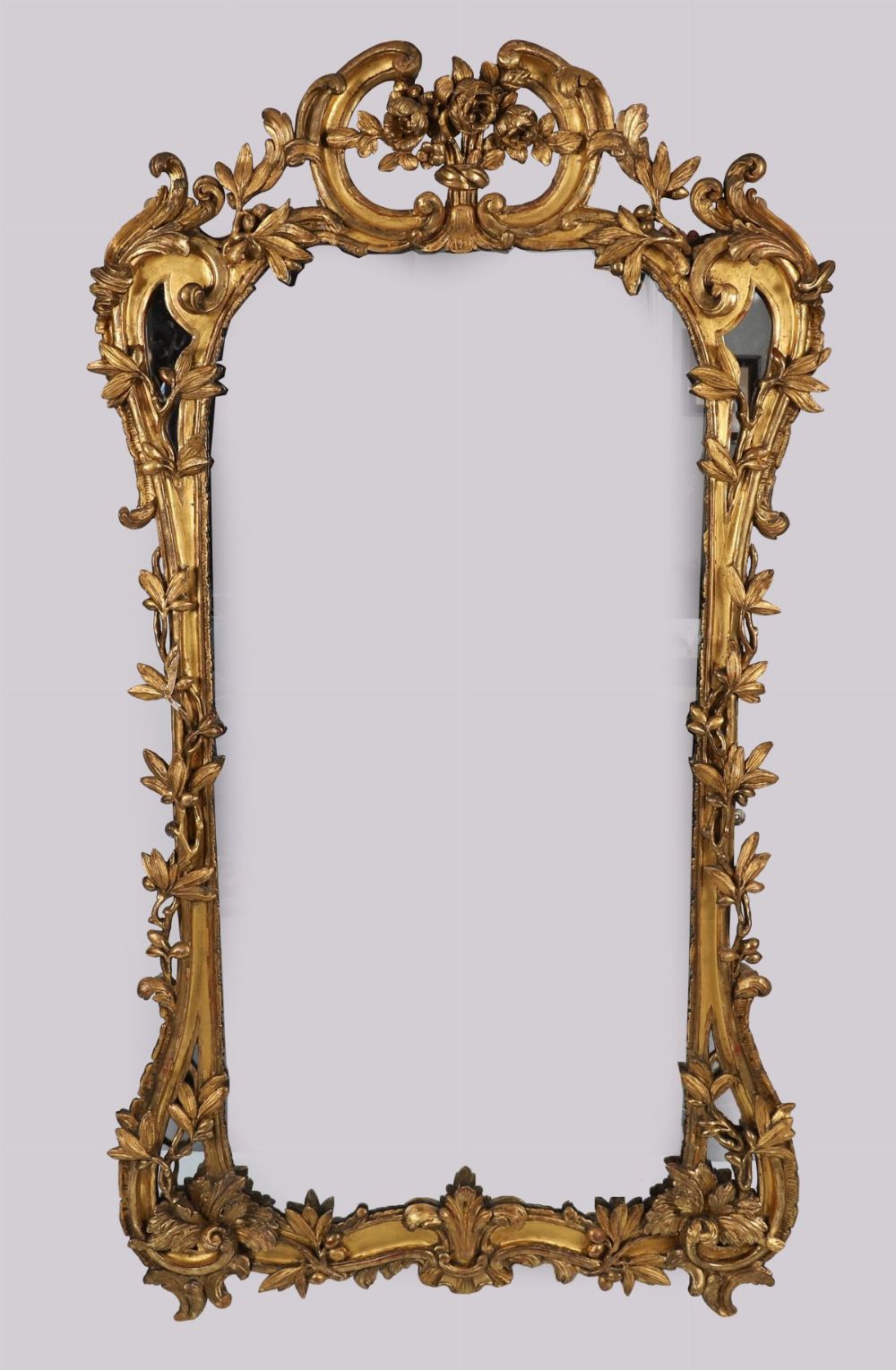 An important 19th-century rococo giltwood mirror enclosing a serpentine plate, the elaborate frame profusely carved with C-scrolls, acanthus leaves, and rocaille motifs. The cresting features floral sprays and a prominent central shell. Deeply moulded and gilded with fine attention to Baroque ornamentation.