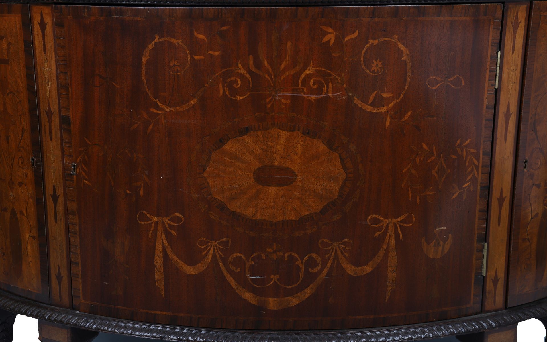 An important Adam style mahogany commode, with satinwood and boxwood marquetry inlay of urns, swags and floral sprays, the bow-fronted form fitted with drawers and cupboards, mounted with gilt-bronze borders and mouldings.