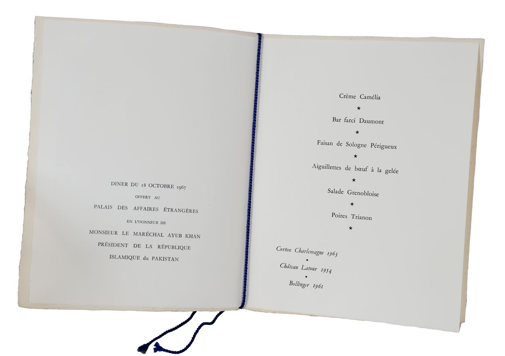 1967 VISIT OF MARSHAL AYUB KHAN — WITH LATOUR 1954 & CORTON-CHARLEMAGNE 1963. Official state dinner menu issued during 1967. Printed wine list includes Château Latour 1954 and Corton-Charlemagne 1963. Decaris engraving.