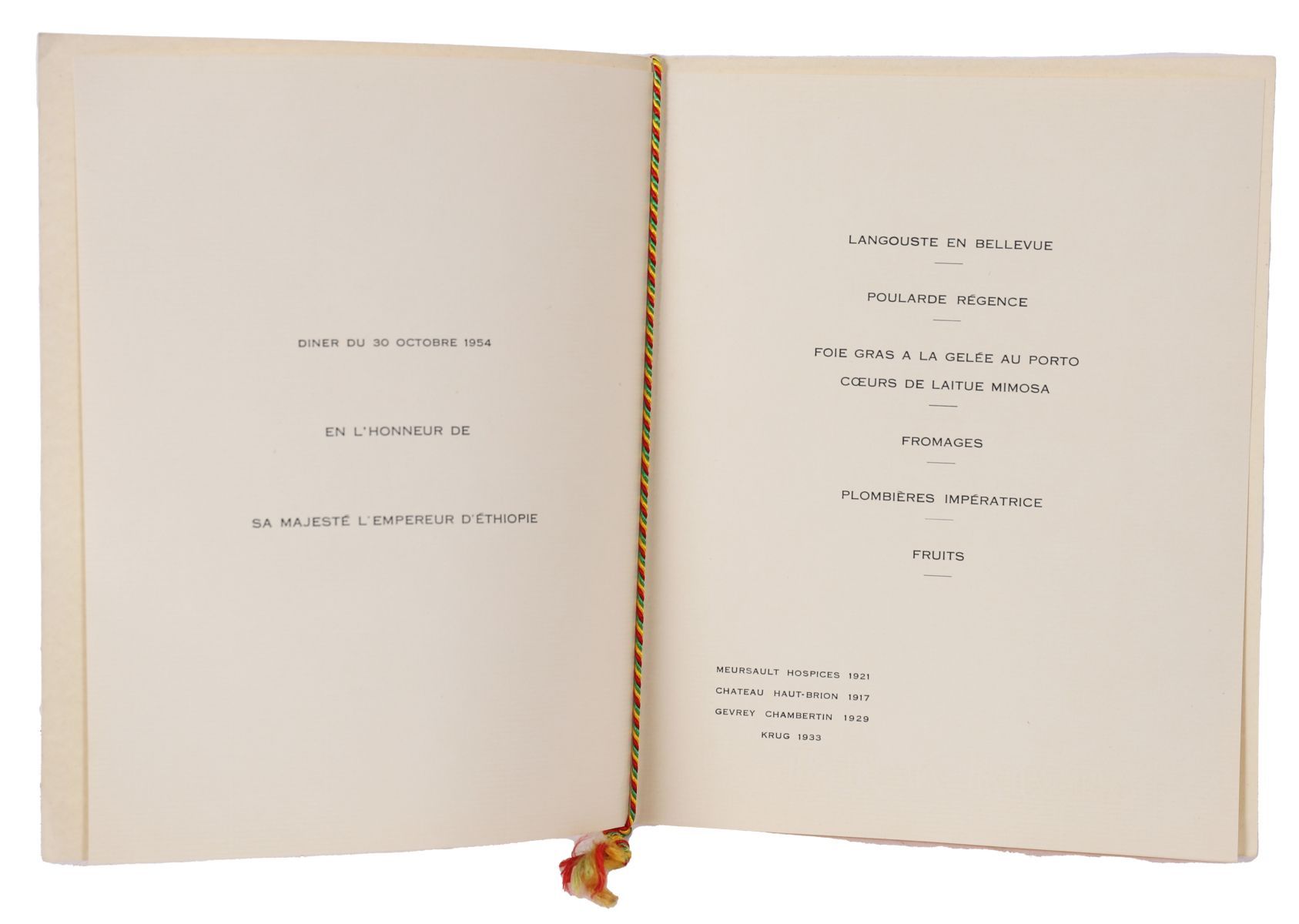 Official state dinner menu issued in honour of Emperor Haile Selassie. Printed wine list includes Château Haut-Brion 1917 and Krug 1933.