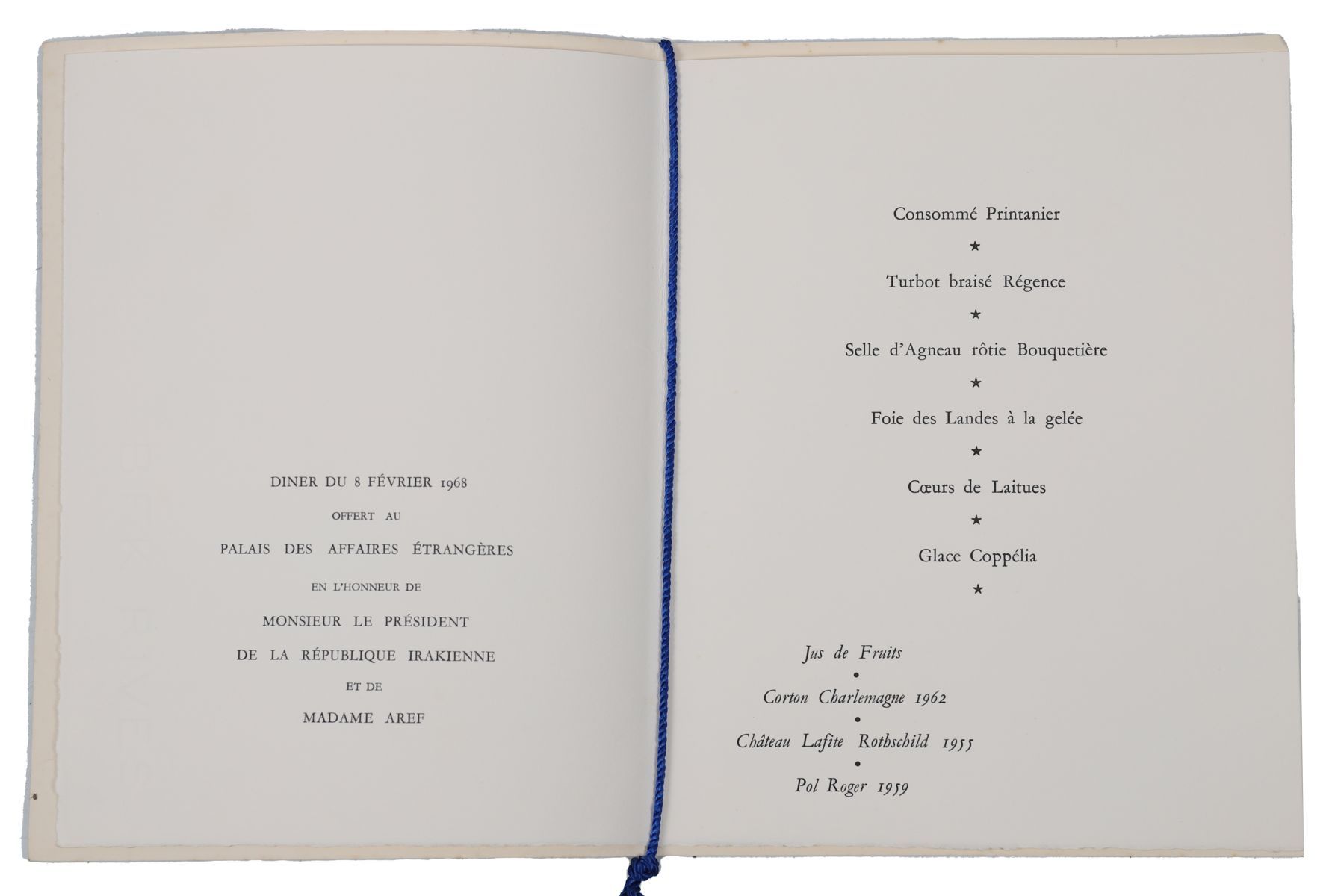 Official state dinner menu issued during the late Gaullist period in honour of President Abdul Rahman Aref. Wine list includes Château Lafite Rothschild 1951 and Pol Roger 1953.