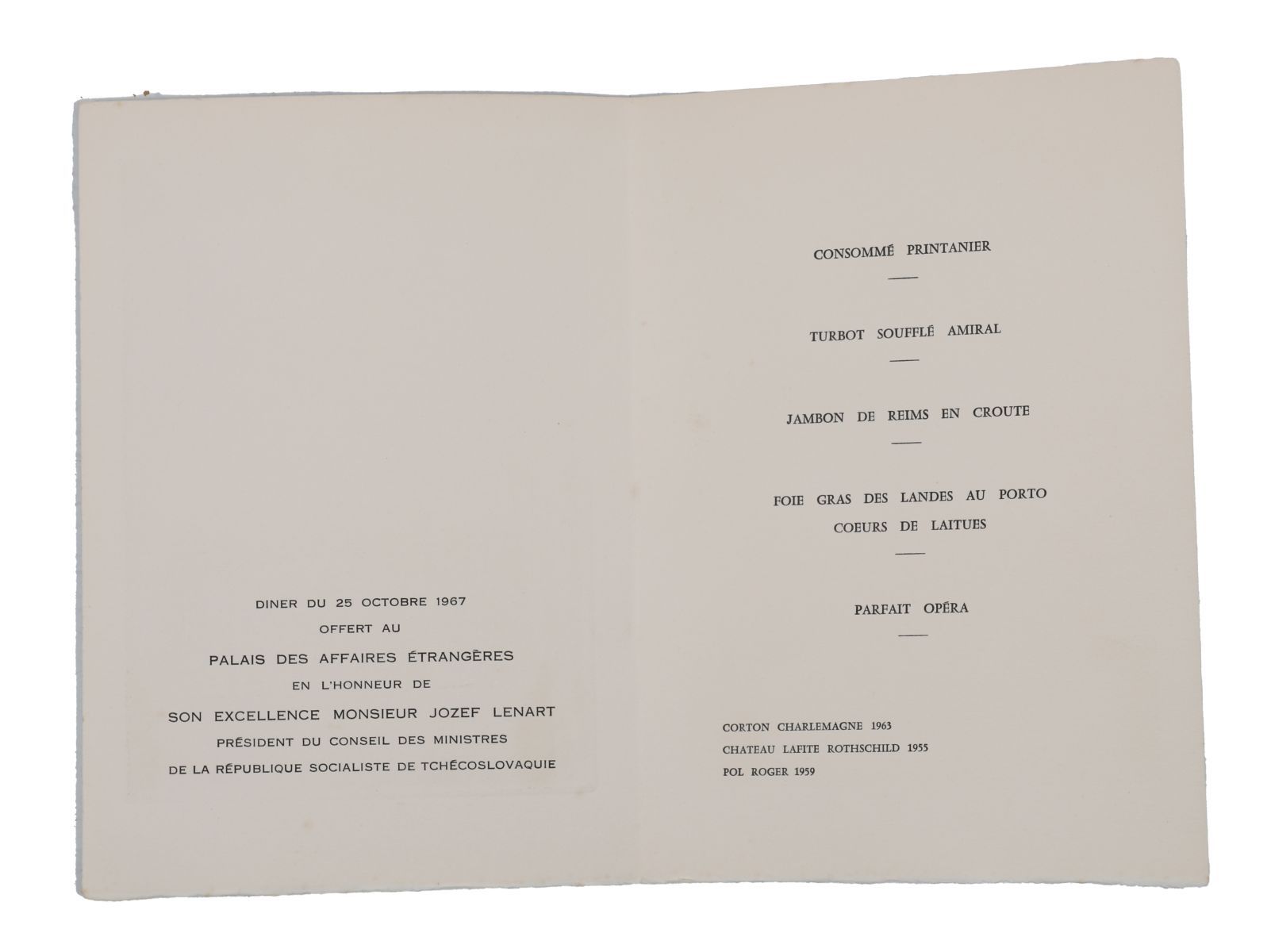 Lot 1469 IMPORTANT FRENCH QUAI D’ORSAY STATE DINNER MENU — PRESIDENCY OF CHARLES DE GAULLE