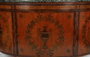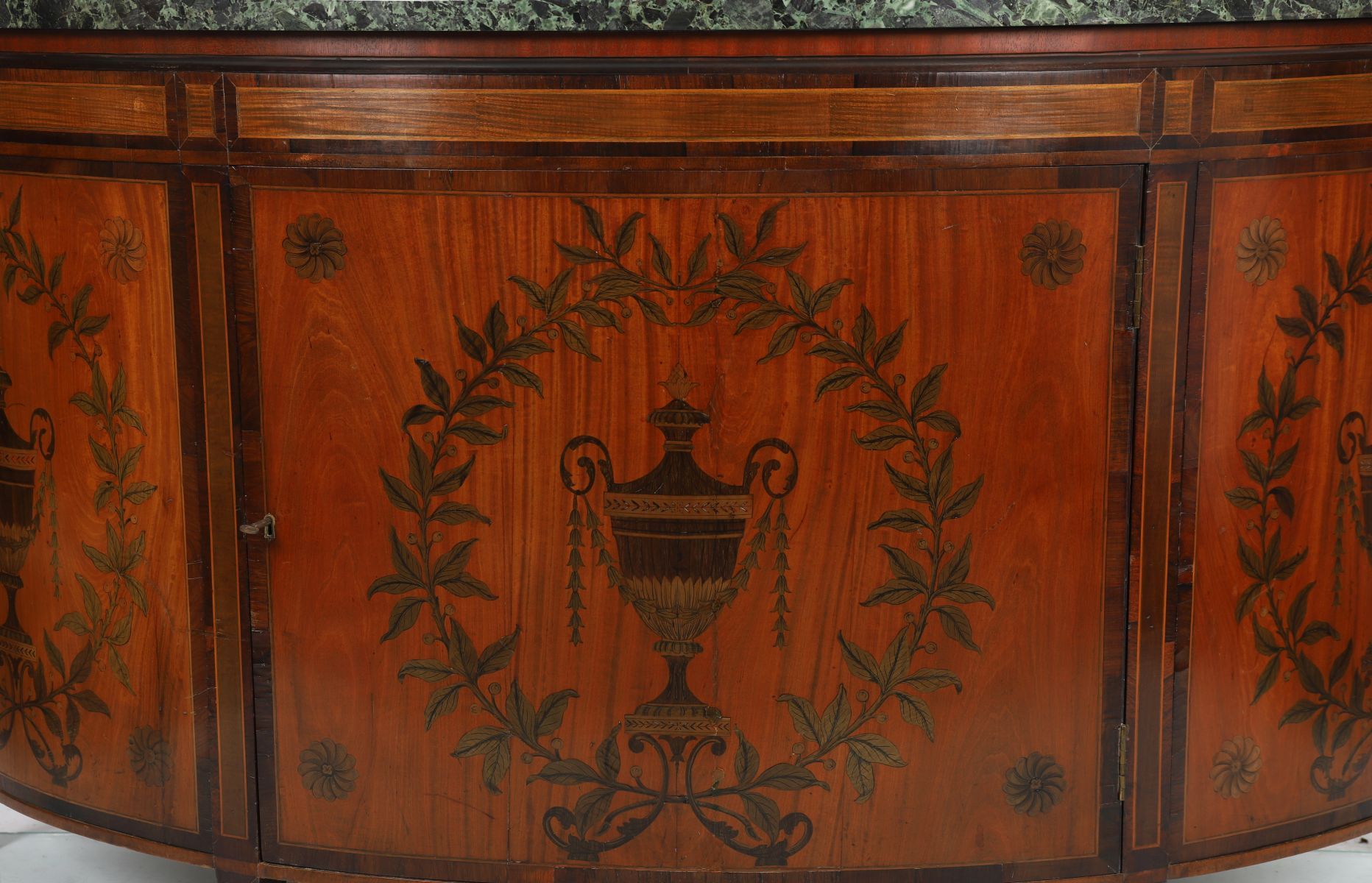 An important Irish satinwood and marquetry bow-front commode, the top with green marble surface above twin cupboard doors inlaid with urns and trailing foliage, raised on tapered legs.