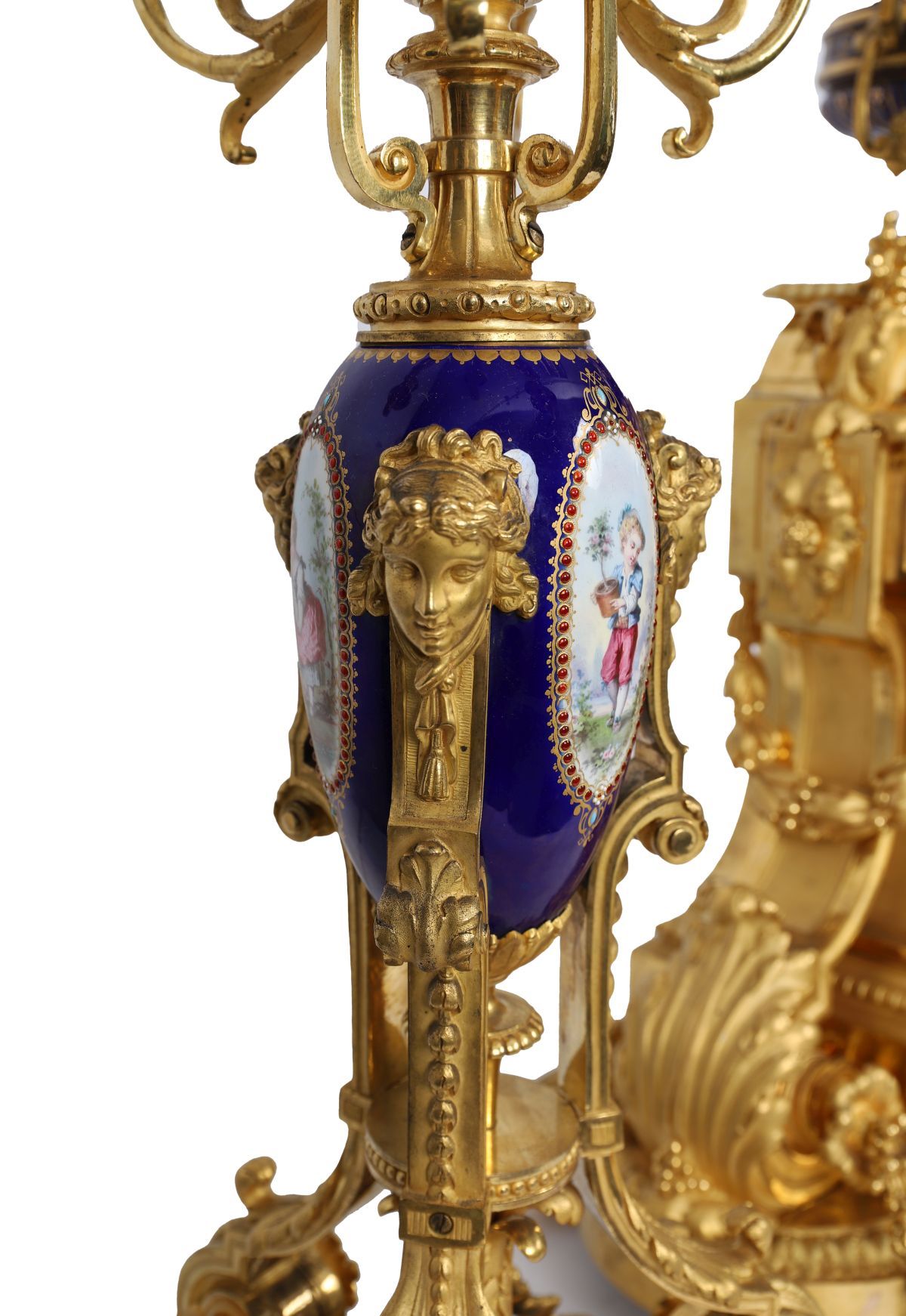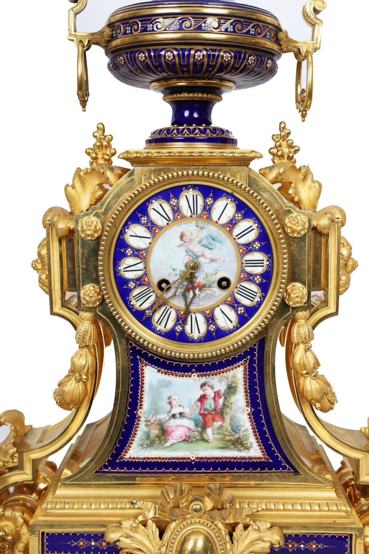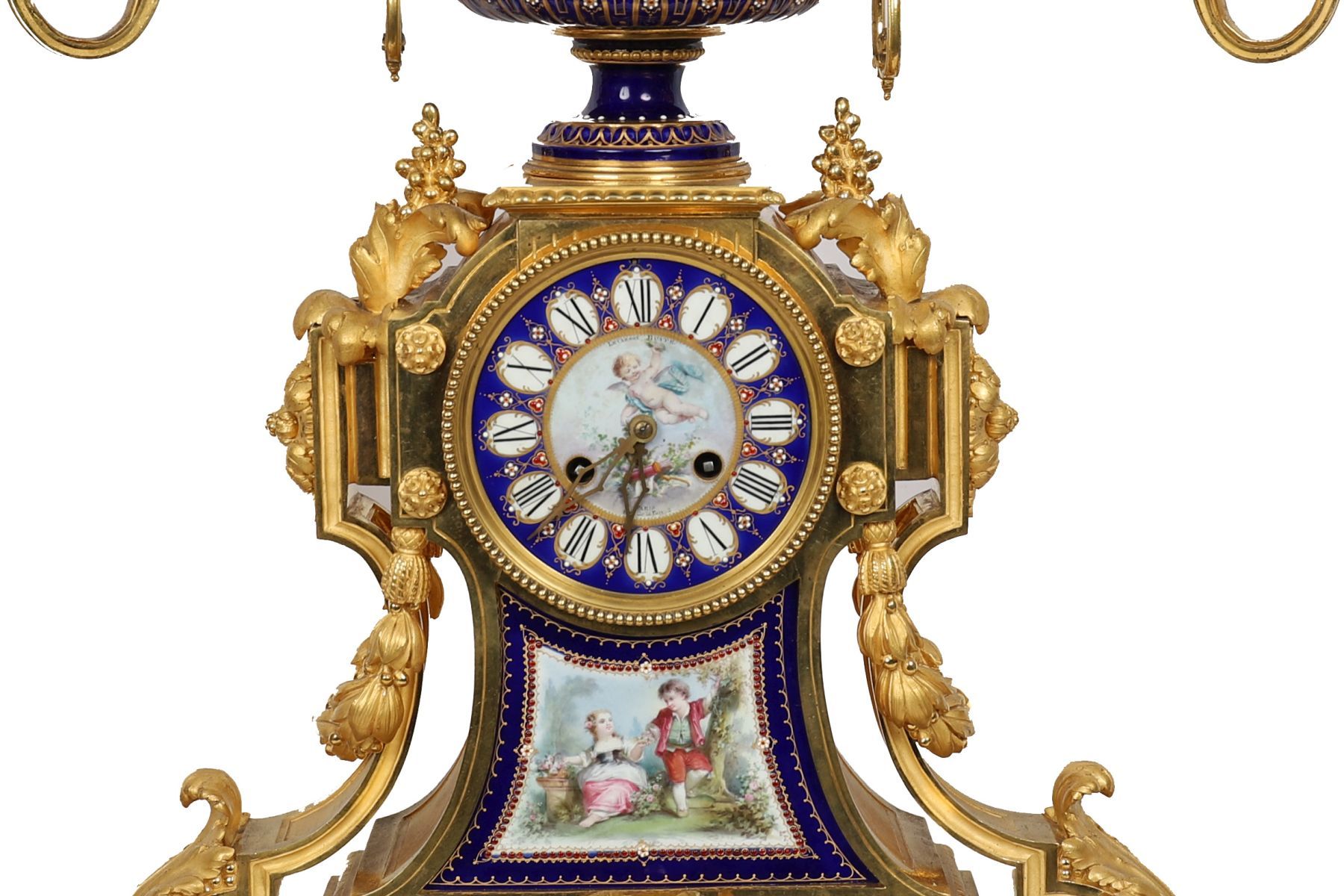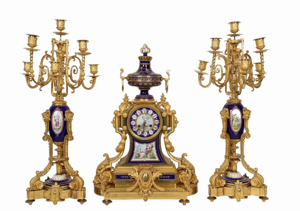 An important 19th-century French clock garniture comprising a central ormolu-mounted Sèvres porcelain mantel clock flanked by a pair of conforming candelabra, each decorated with painted panels on a deep blue ground and enriched with finely cast gilt-bronze mounts. French, 19th century.