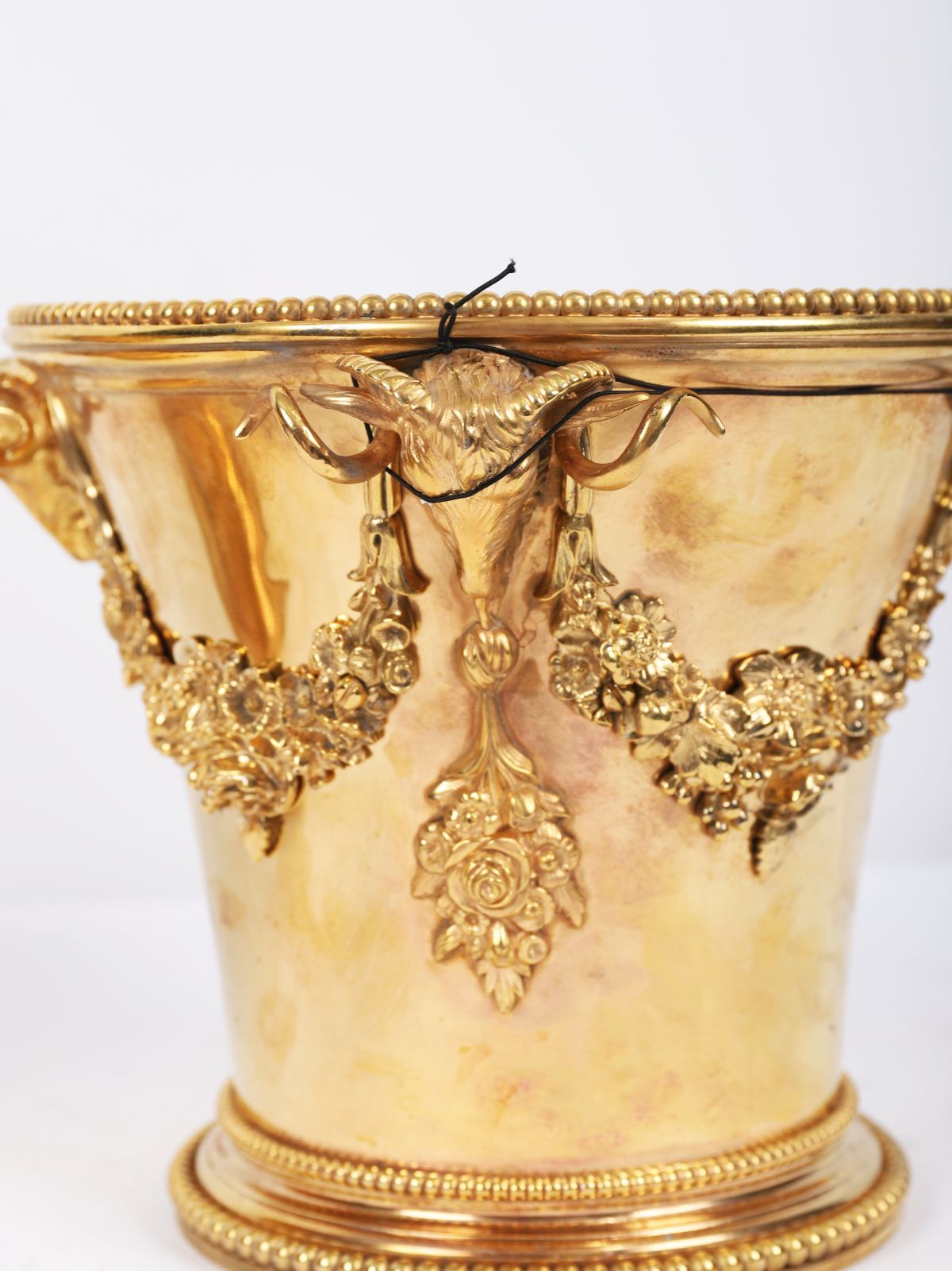 An exceptional pair of large crested and gilded Sheffield wine coolers, bearing the crest of the Peel Family (Sir Robert Peel) each with broad beaded rim, richly embossed decoration and applied ram's head handles, the bodies adorned with floral swags and wreaths in the neoclassical taste.