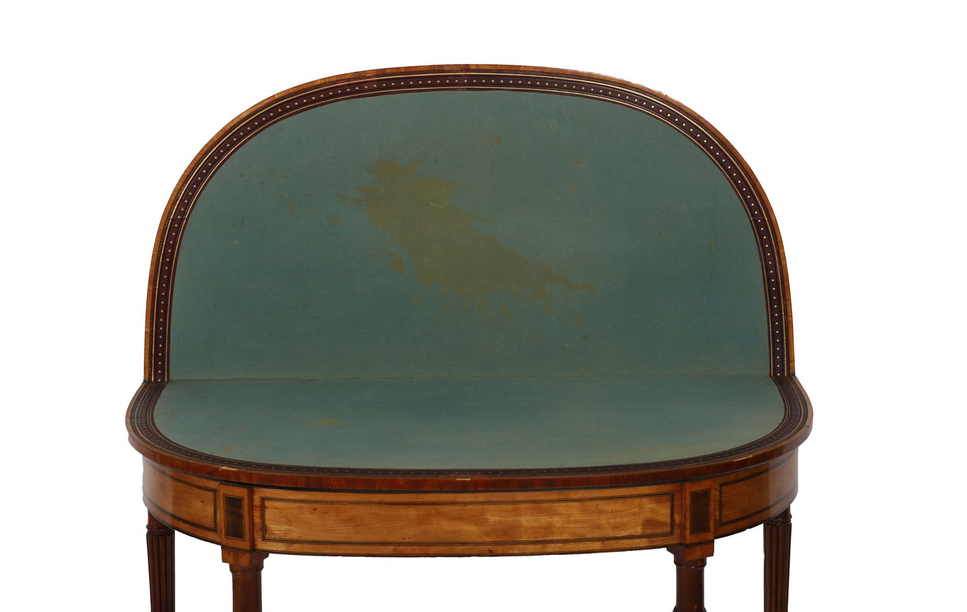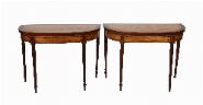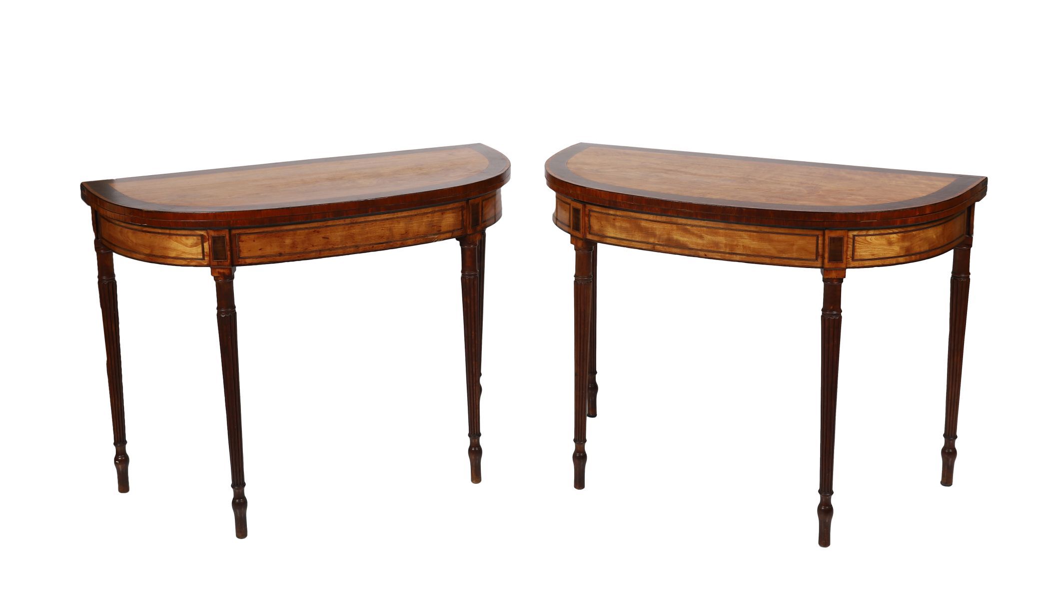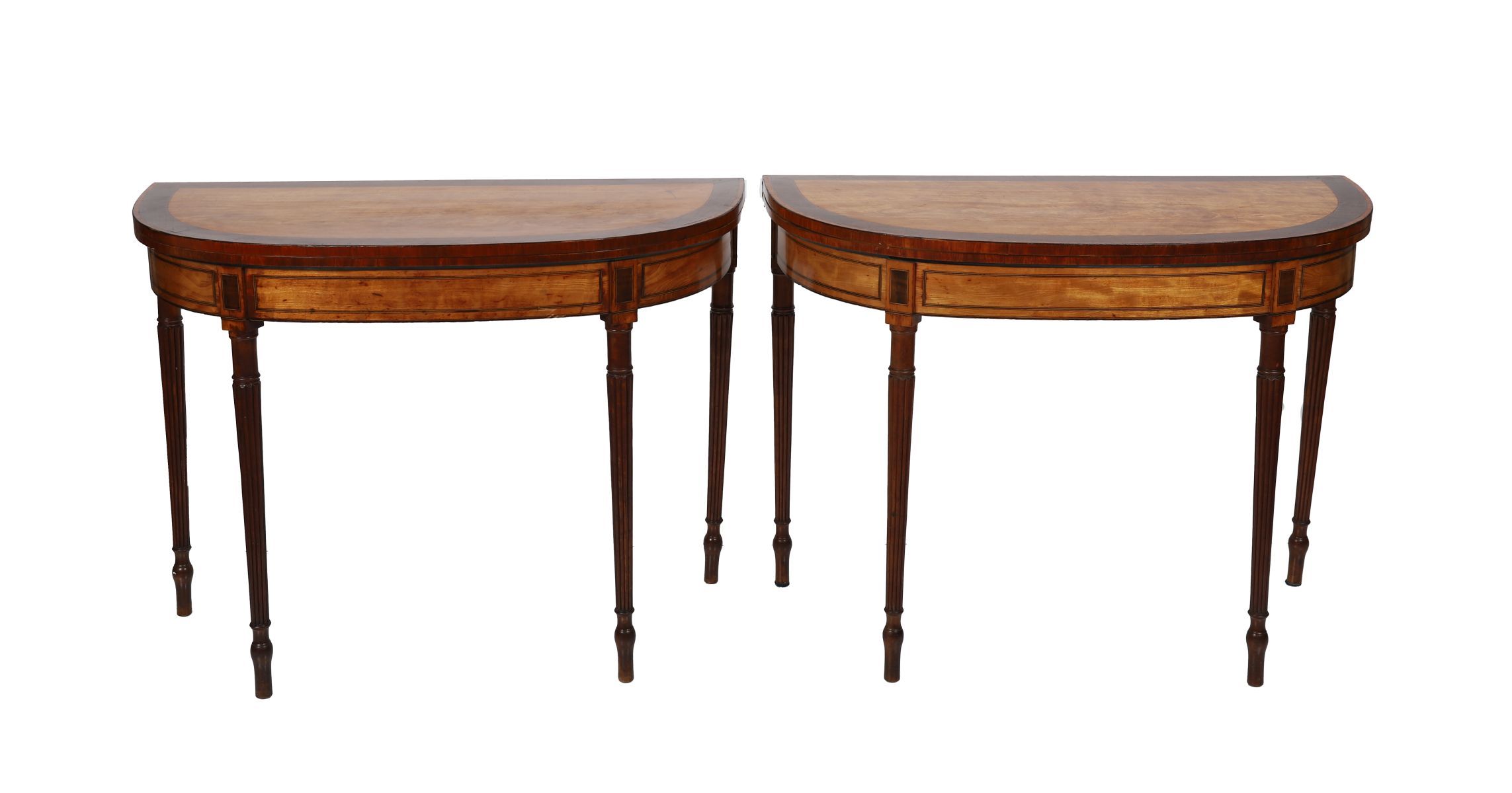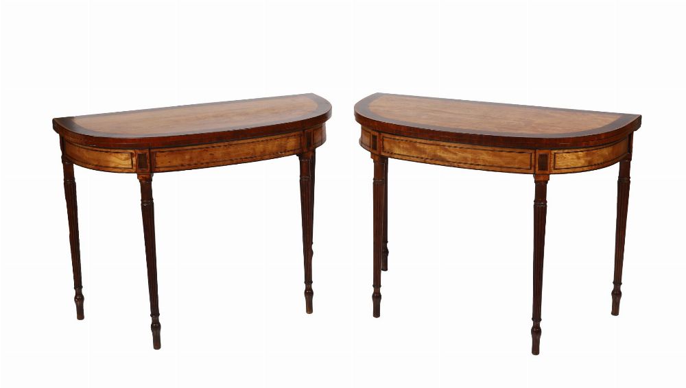 An important pair of Dublin late 18th-century satinwood and mahogany games tables, the d-shaped tops, crossbanded and inlaid with fan motifs, opening to reveal baize-lined interiors, raised on fluted tapering legs. Attributed to a Dublin maker in the manner of William Moore.