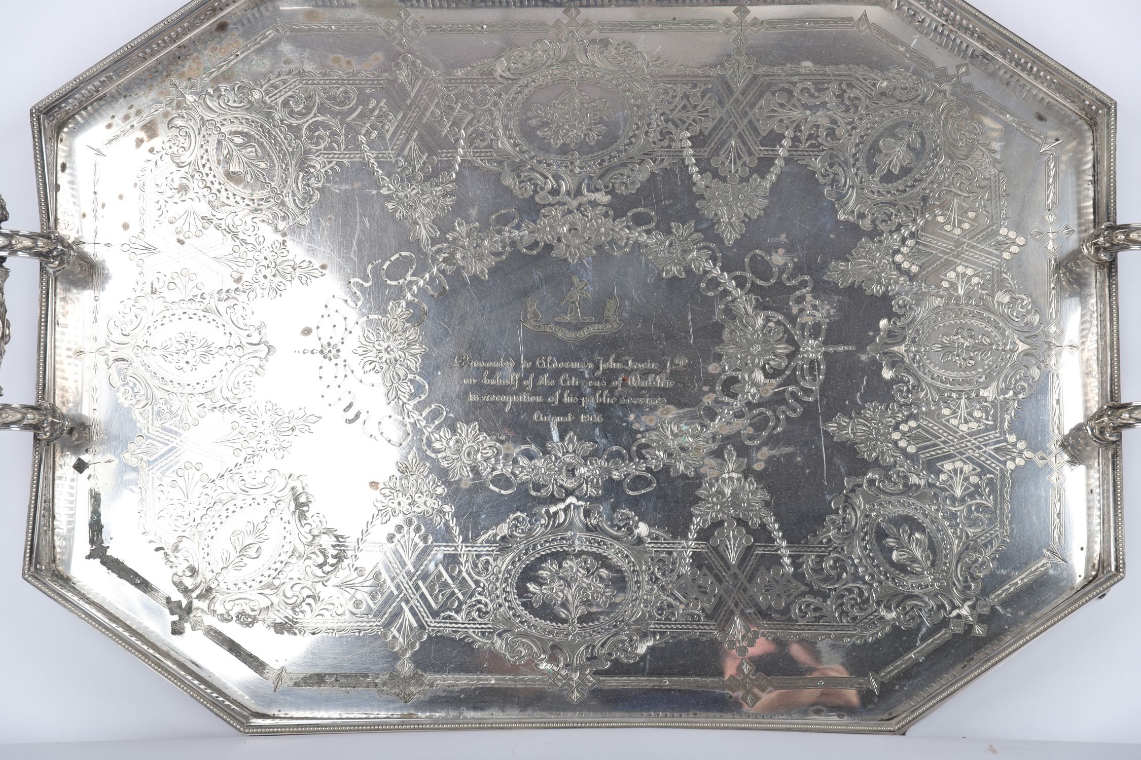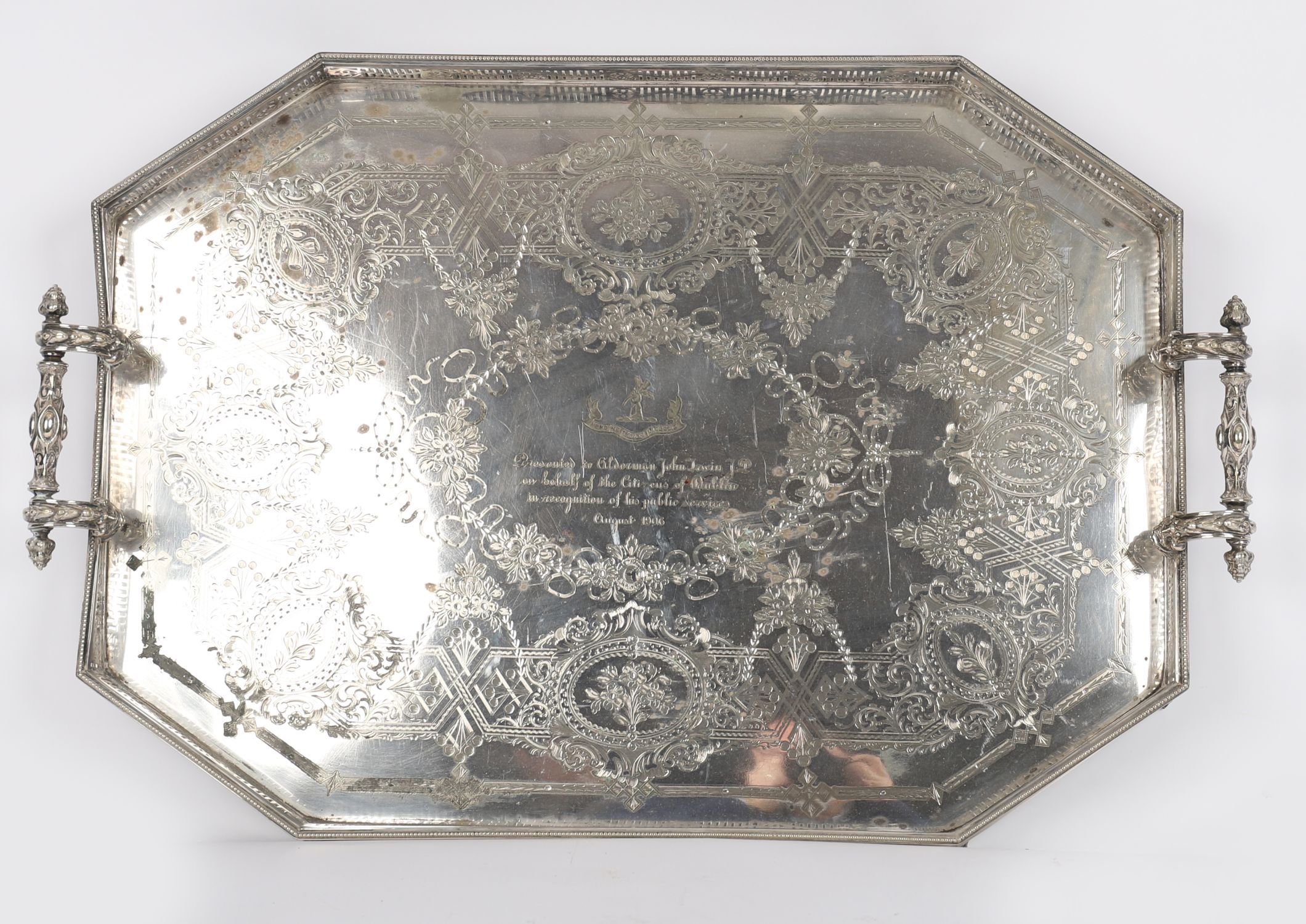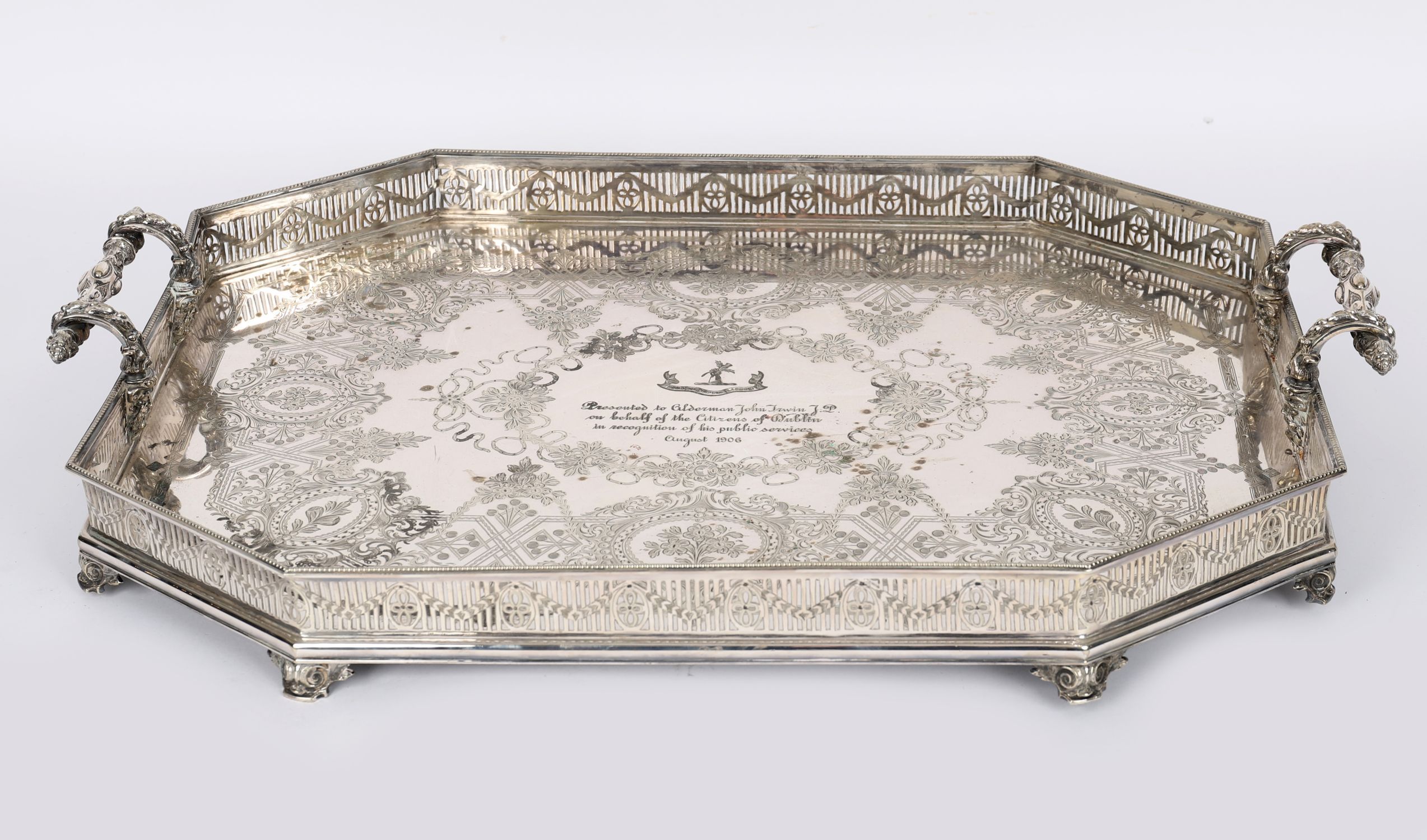 A large and impressive silver-plated gallery tray by West & Son, Dublin, of rectangular form with pierced gallery, mask-mounted handles, and finely engraved decoration. Inscribed: “Presented to Alderman John Irwin J.P. on behalf of the Citizens of Dublin in recognition of his public services, August 1906â€.