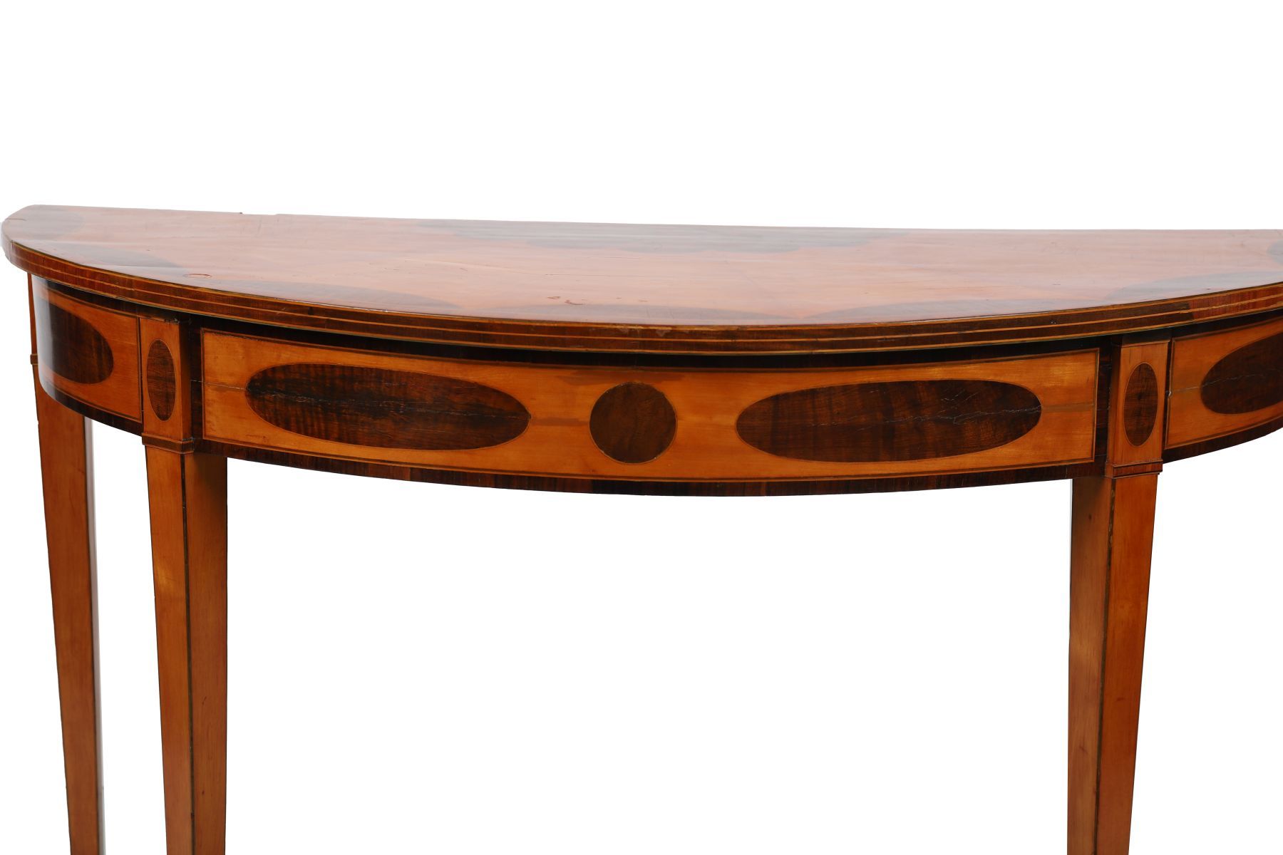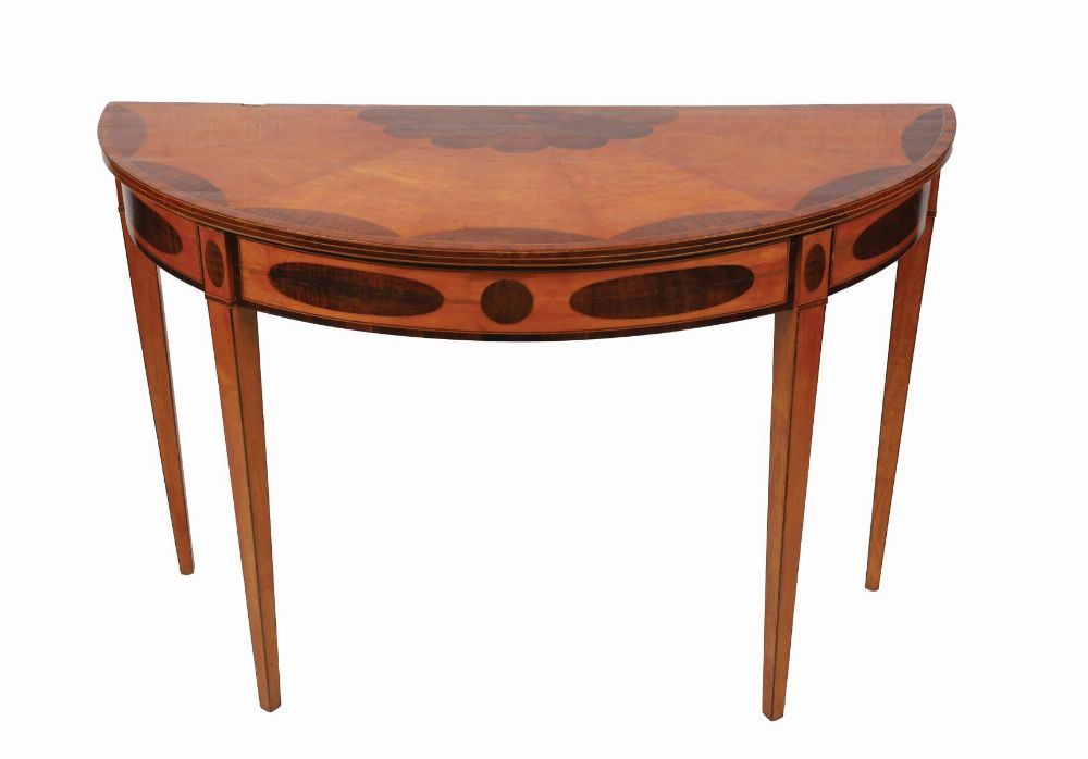 An exceptional late 18th-century demi-lune side table attributed to William Moore of Dublin, in satinwood with crossbanded fruitwood and sycamore inlay, the top decorated with fan and oval motifs, raised on tapering legs.