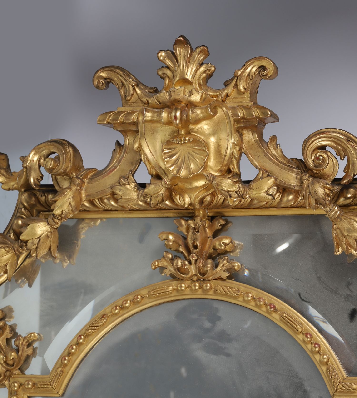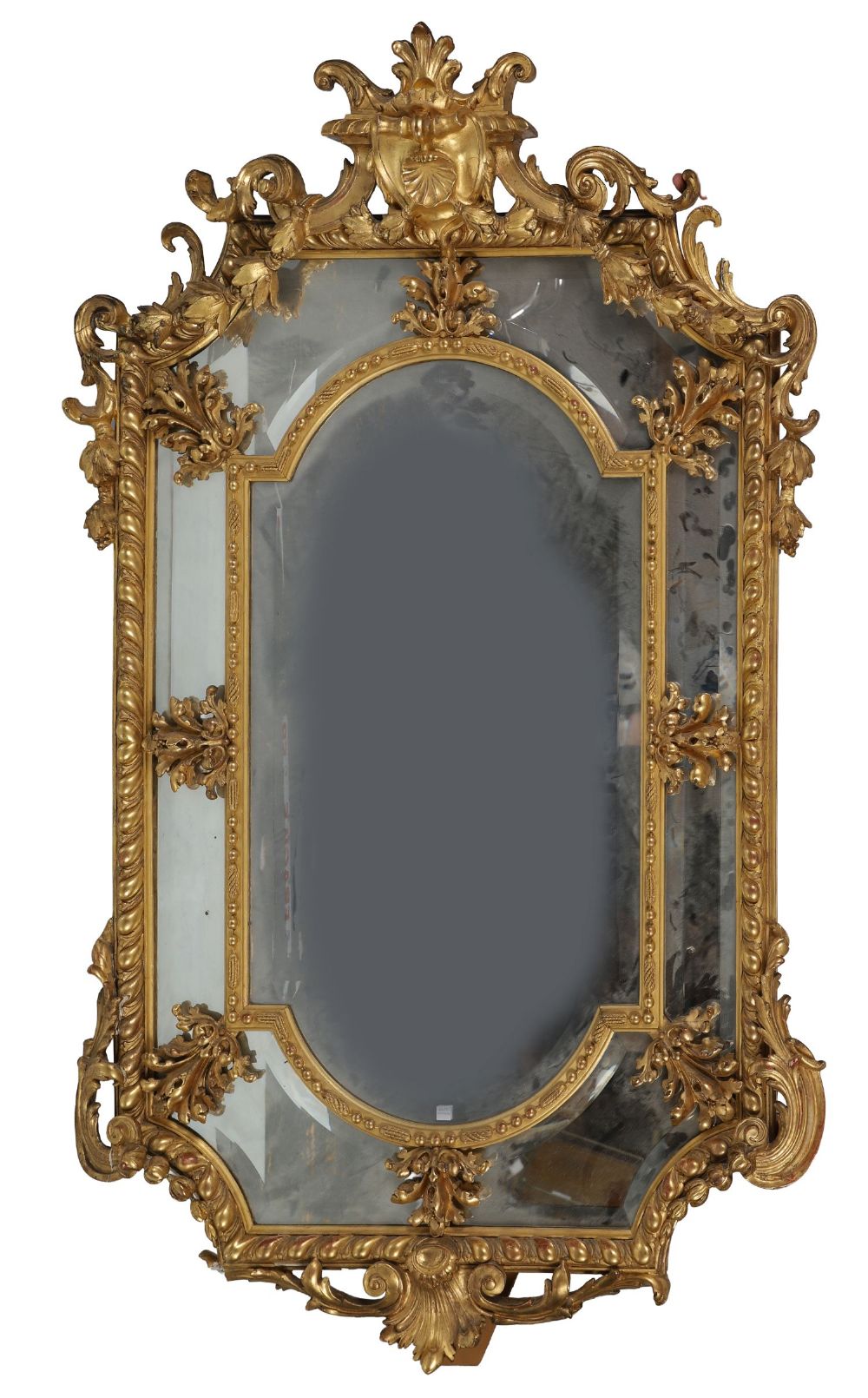 An impressive 19th-century giltwood pier mirror of grand proportions, richly carved in high relief with scrolling acanthus foliage, rocaille motifs, and shell crests. The frame displays deep relief ornamentation typical of the Rococo revival style, with an arched central mirror plate flanked by elaborate cartouches and scroll decoration