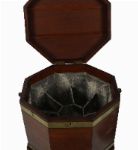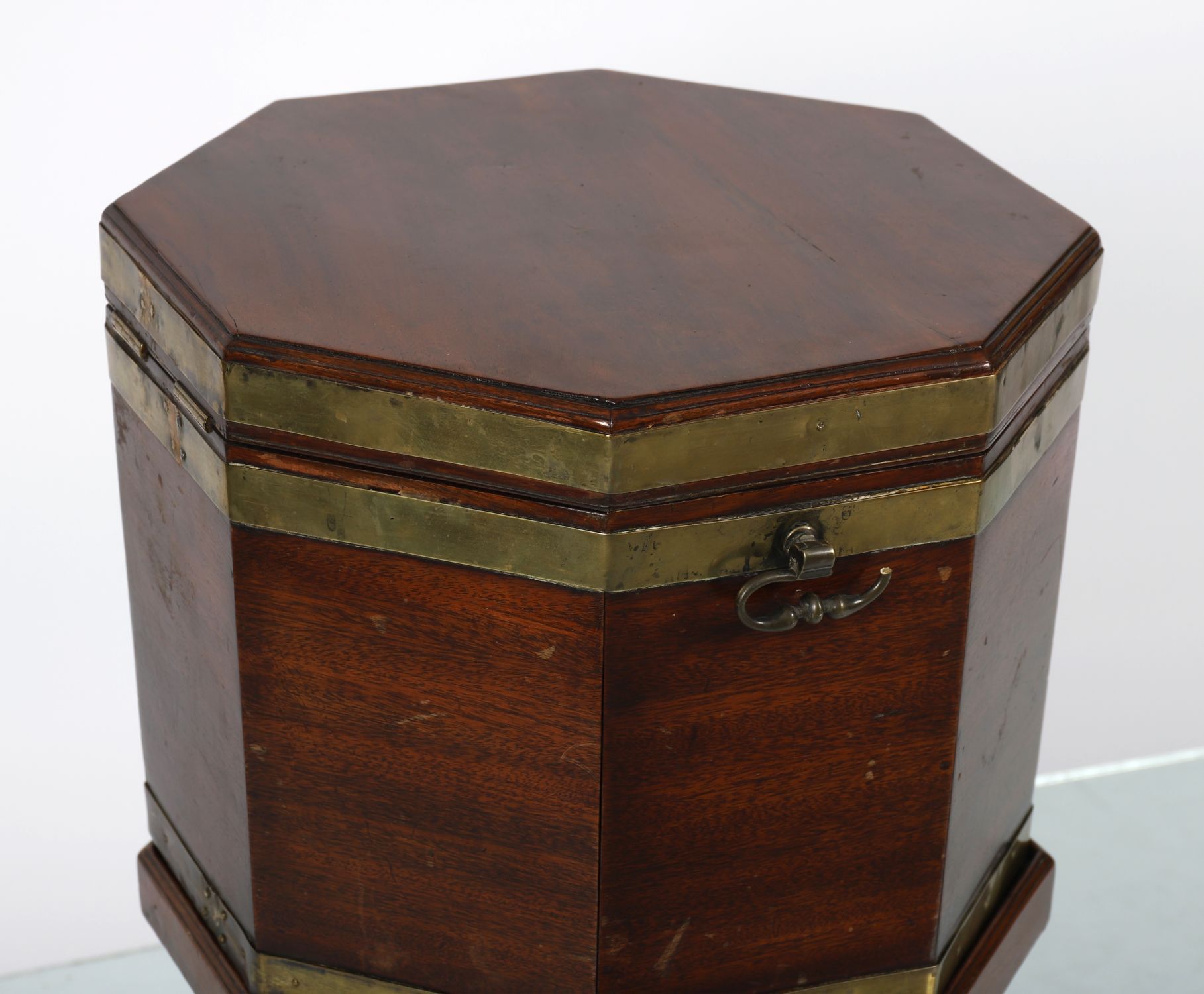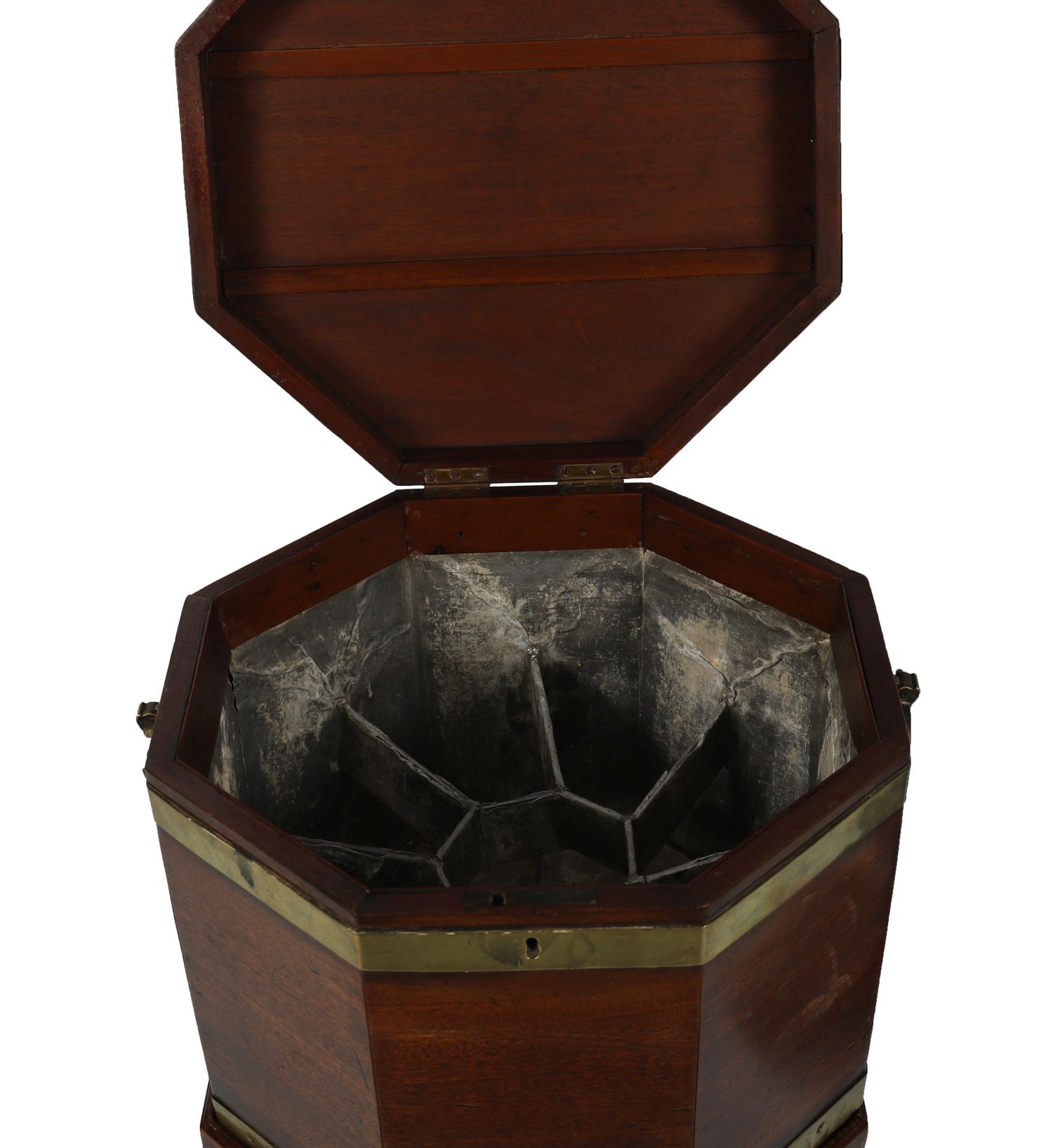 A well-proportioned Georgian wine cellarette of octagonal form in figured mahogany, with brass banding and original drop handles, the hinged lid opening to a lined storage interior.