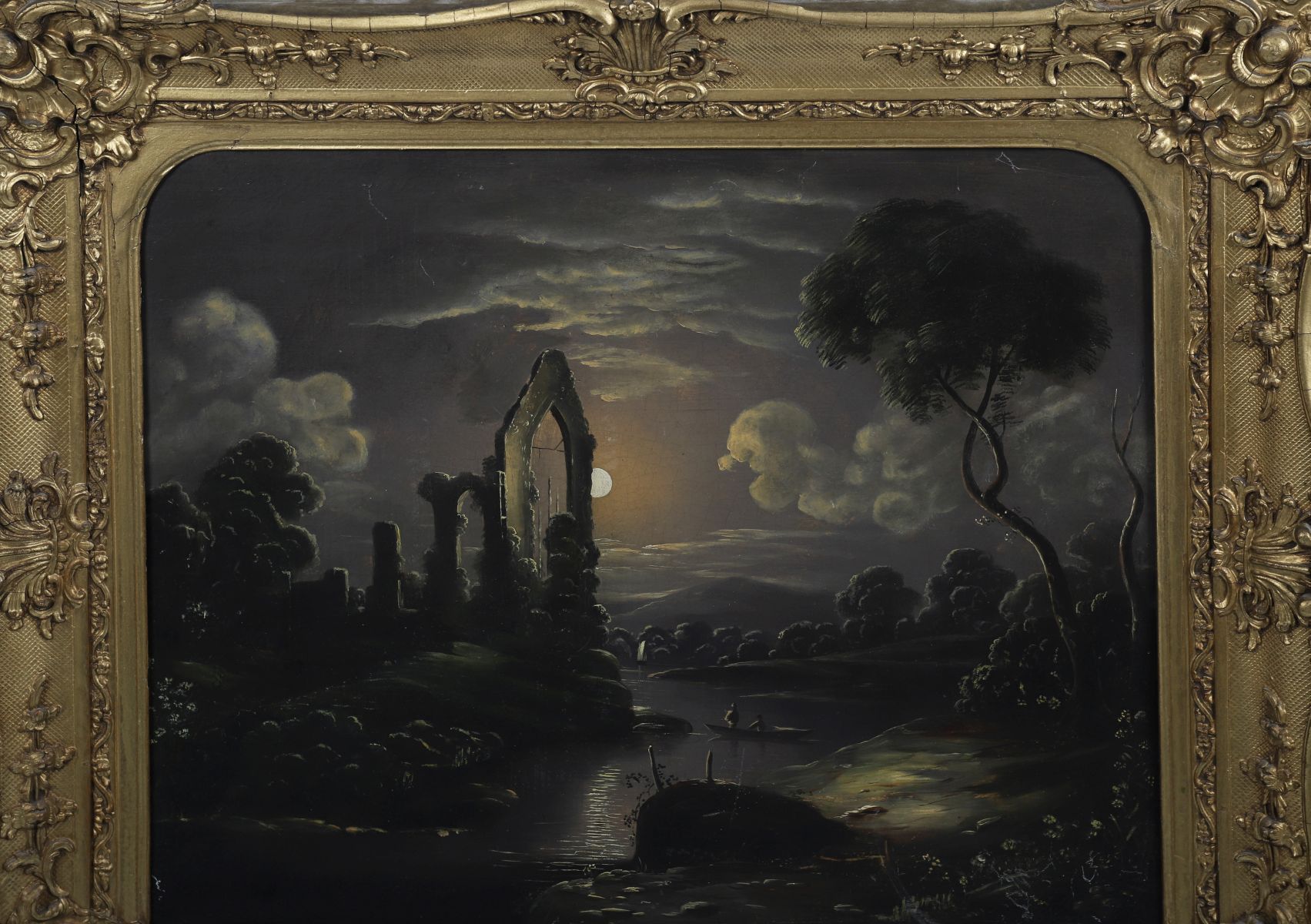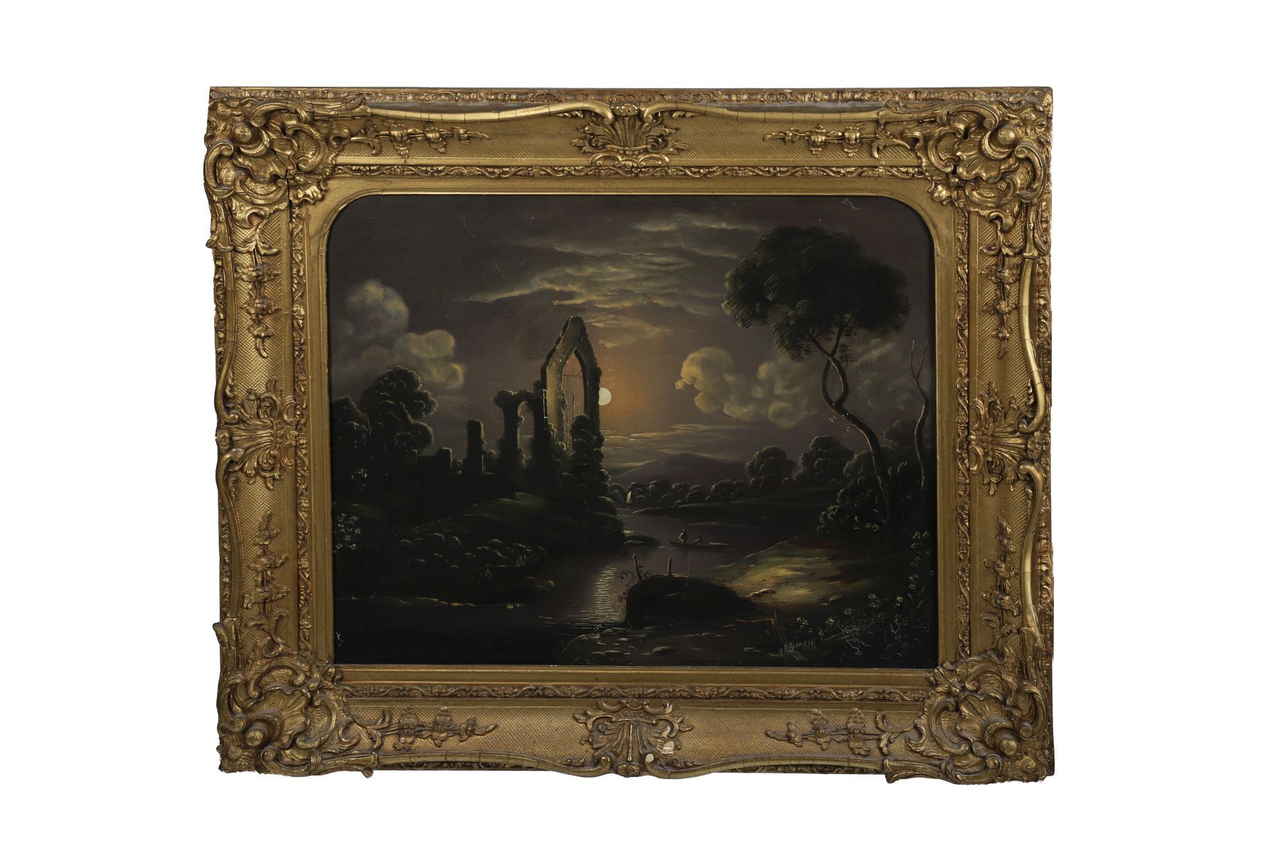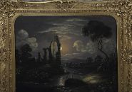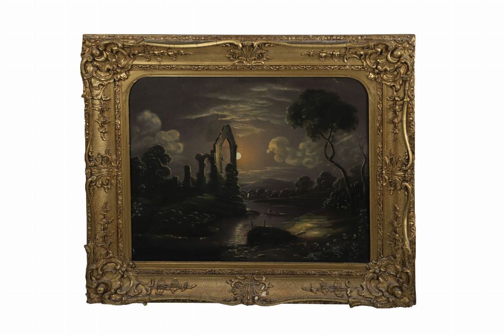 Oil on canvas. A dramatic moonlit river landscape with Gothic ruins reflected in water.