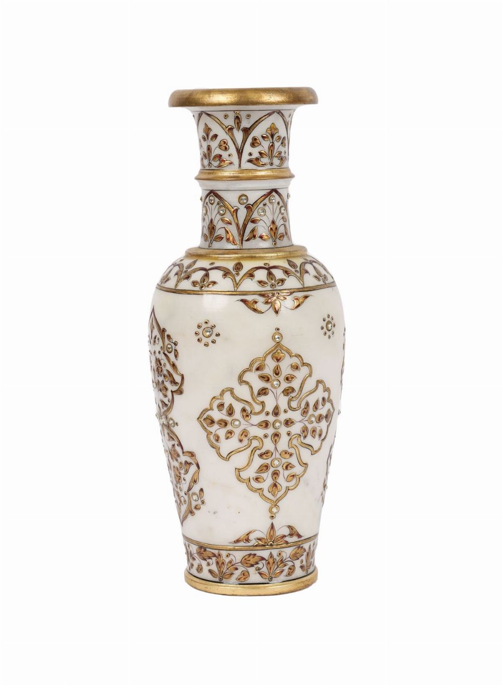 Decorative alabaster vase with gilt and enamel floral ornamentation inset with small cabochons. Indian, early 20th century.