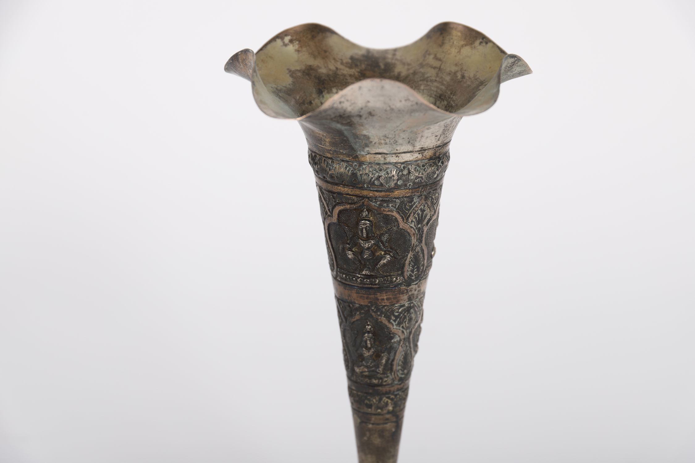 A tall Indian repoussé vase of trumpet form, engraved with Hindu deities in panels and bordered with traditional floral motifs, on a circular pedestal foot. Silvered copper with a dark patina.