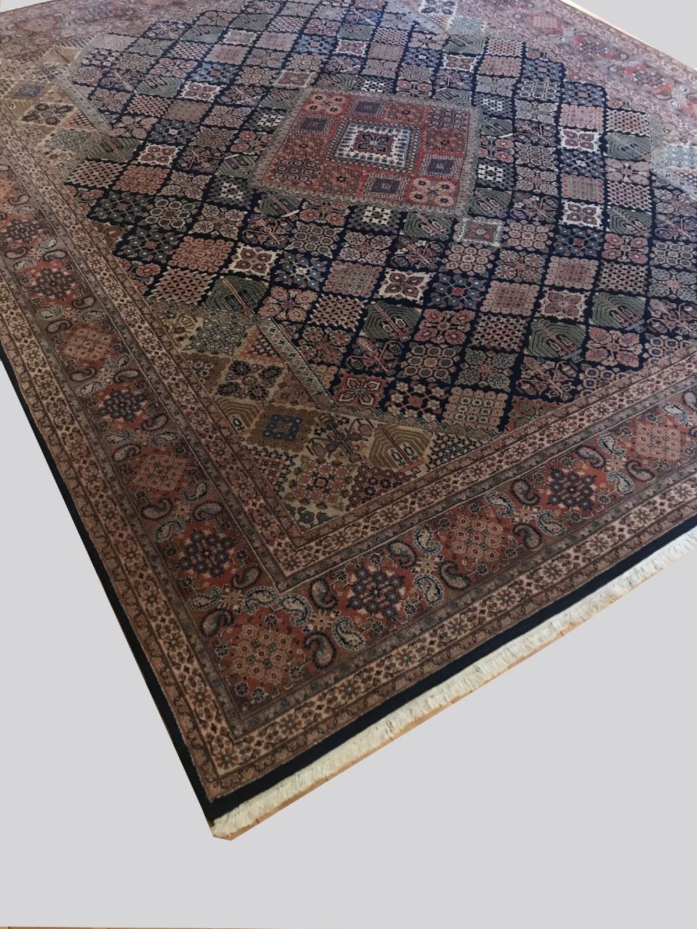 The dark navy field is arranged with a richly detailed grid of miniature floral panels and boteh motifs in soft rose, ivory, sage, and pale blue, centred by a square medallion. The intricately patterned border includes scrolling palmettes and rosettes on a muted terracotta ground, enclosed by floral guard stripes.