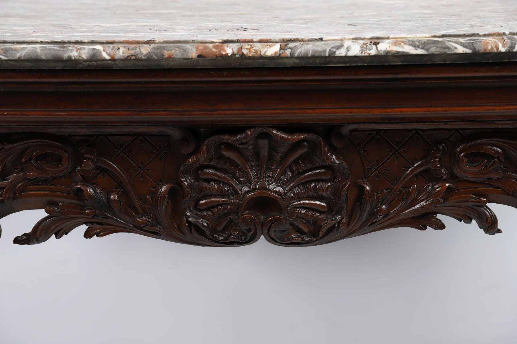 A fine Irish red walnut side table, the rectangular top with moulded edge above a richly carved frieze of acanthus scrolls and shells, raised on cabriole legs with foliate knees terminating in ball-and-claw feet, fitted with a variegated marble top.