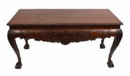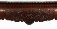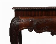 the rectangular gadroon moulded top above a conforming frieze and a dramatic phoenix and mask centred apron, raised on phoenix and acanthus leaf carved cabriole legs, terminating on claw and ball feet.